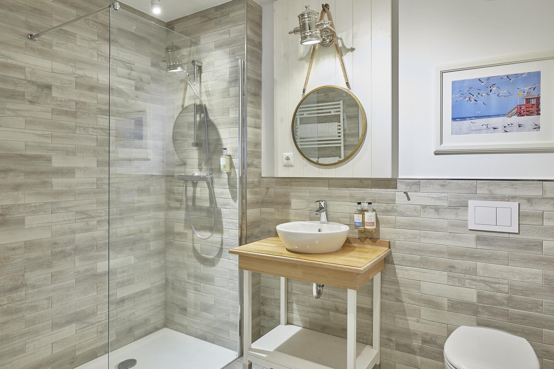 Geschlafen wird in einem der beiden Schlafzimmer mit komfortablen Doppelbett oder der Schlafcouch im Wohnbereich, falls es doch mal mehr Menschen werden sollten. Ein Schlafzimmer punktet mit der freistehenden Badewanne mit Blick auf die Dünenlandschaft, während das zweite Schlafzimmer über ein eigenes Ankleidezimmer verfügt.