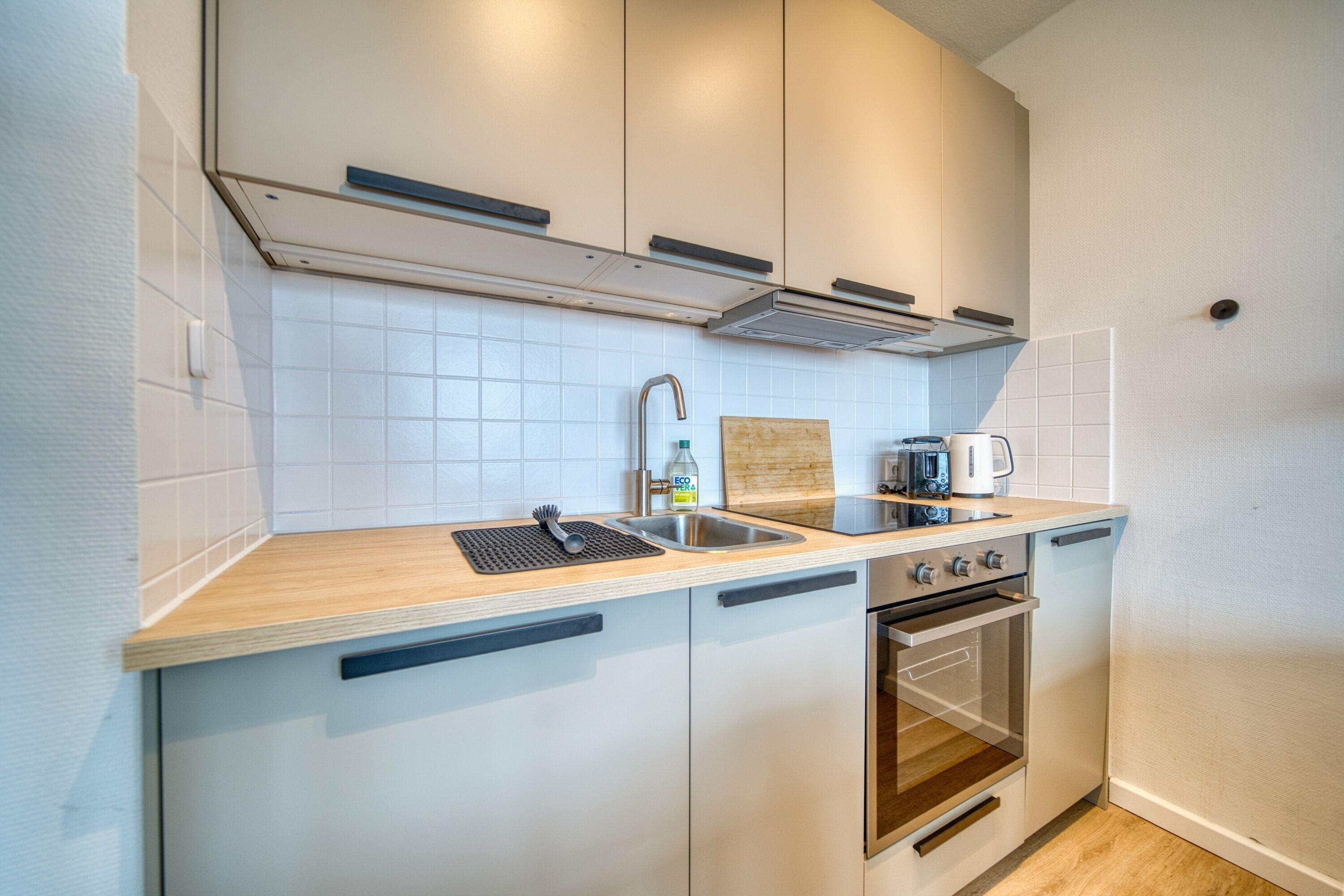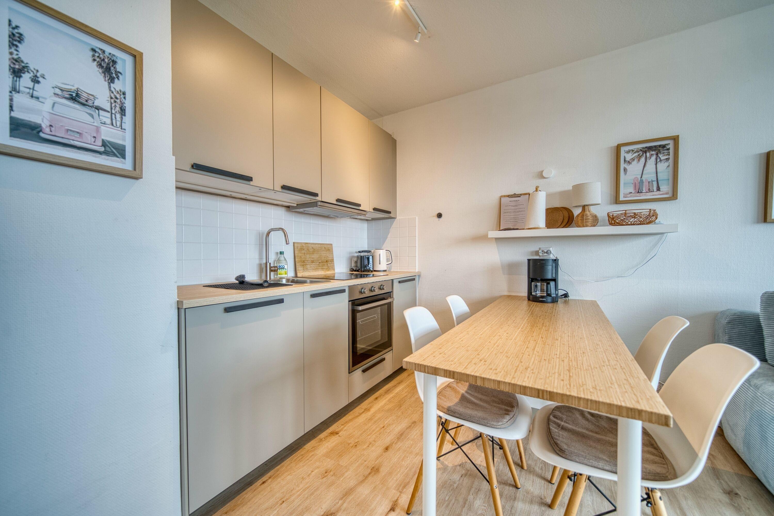 Küche mit Geschirrspüler, Ceranfeld, Backofen, Kühlschrank, Kaffeemaschine, Toaster, Wasserkocher