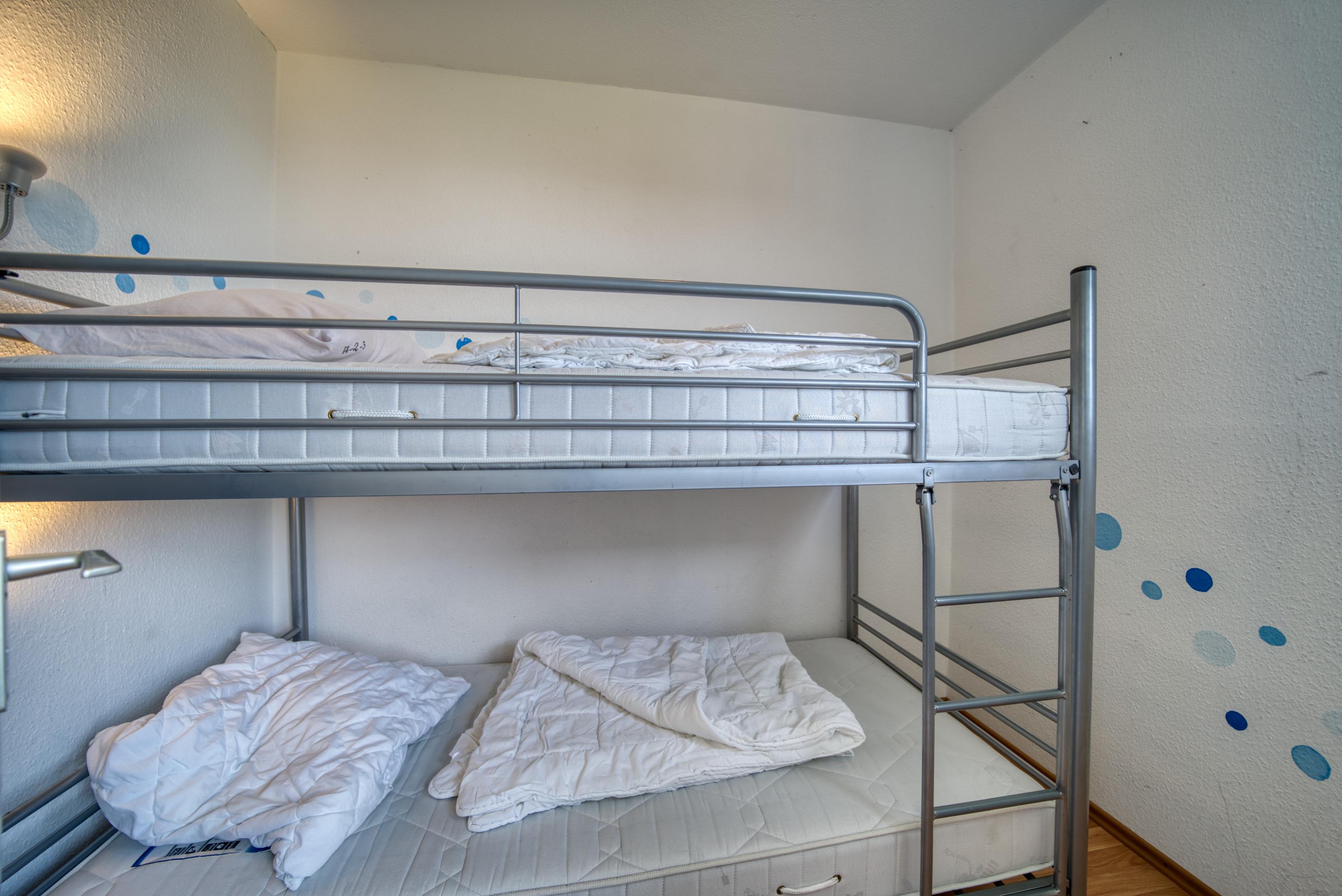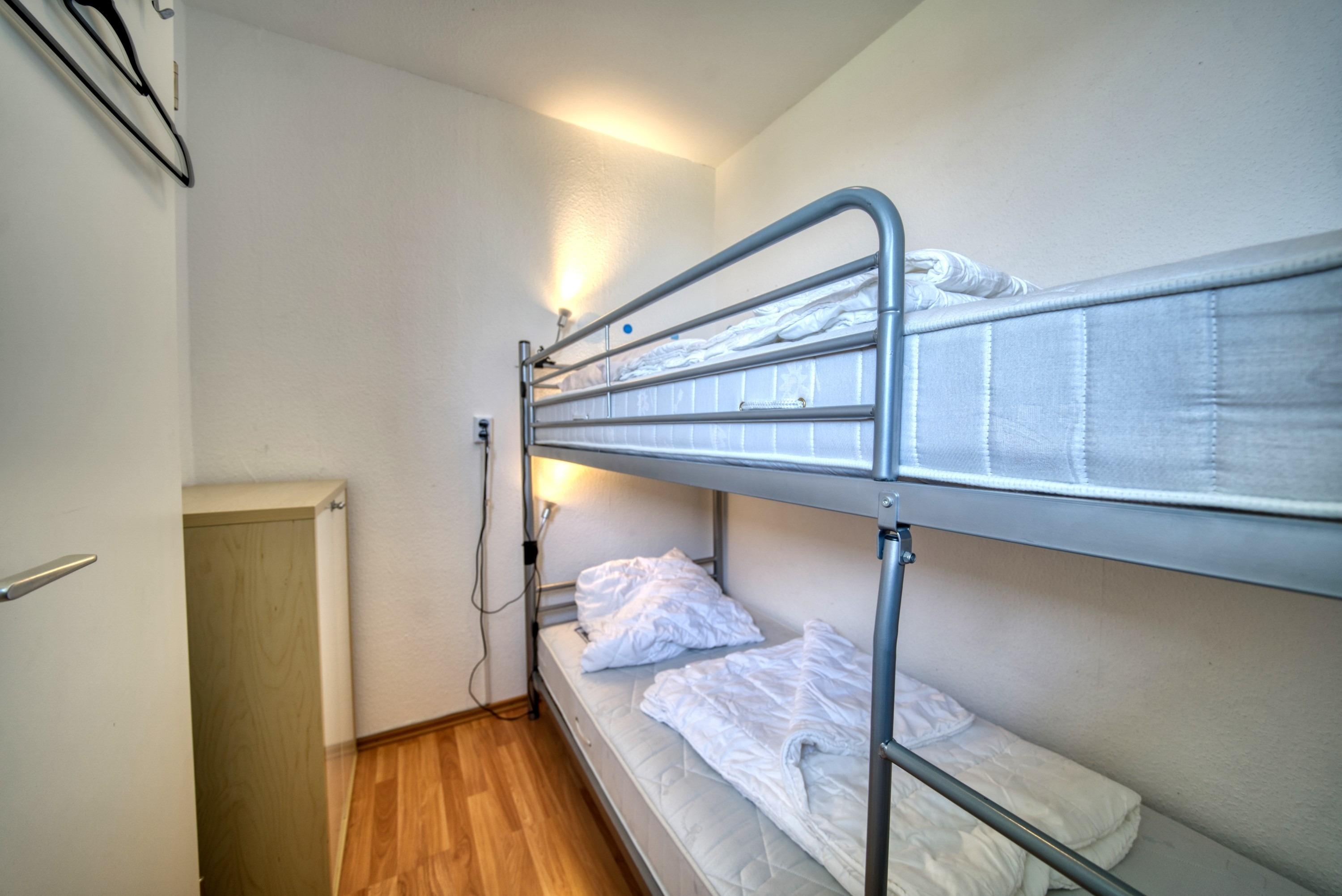 Der kombinierte Wohn-/Schlafbereich ist mit einem Doppelbett (Einzelmatratzen), einer Schlafcouch, Laminatboden, WLAN und Smart-TV ausgestattet. Zusätzlich steht ein separates Schlafzimmer mit Etagenbett zur Verfügung – ideal für Kinder.