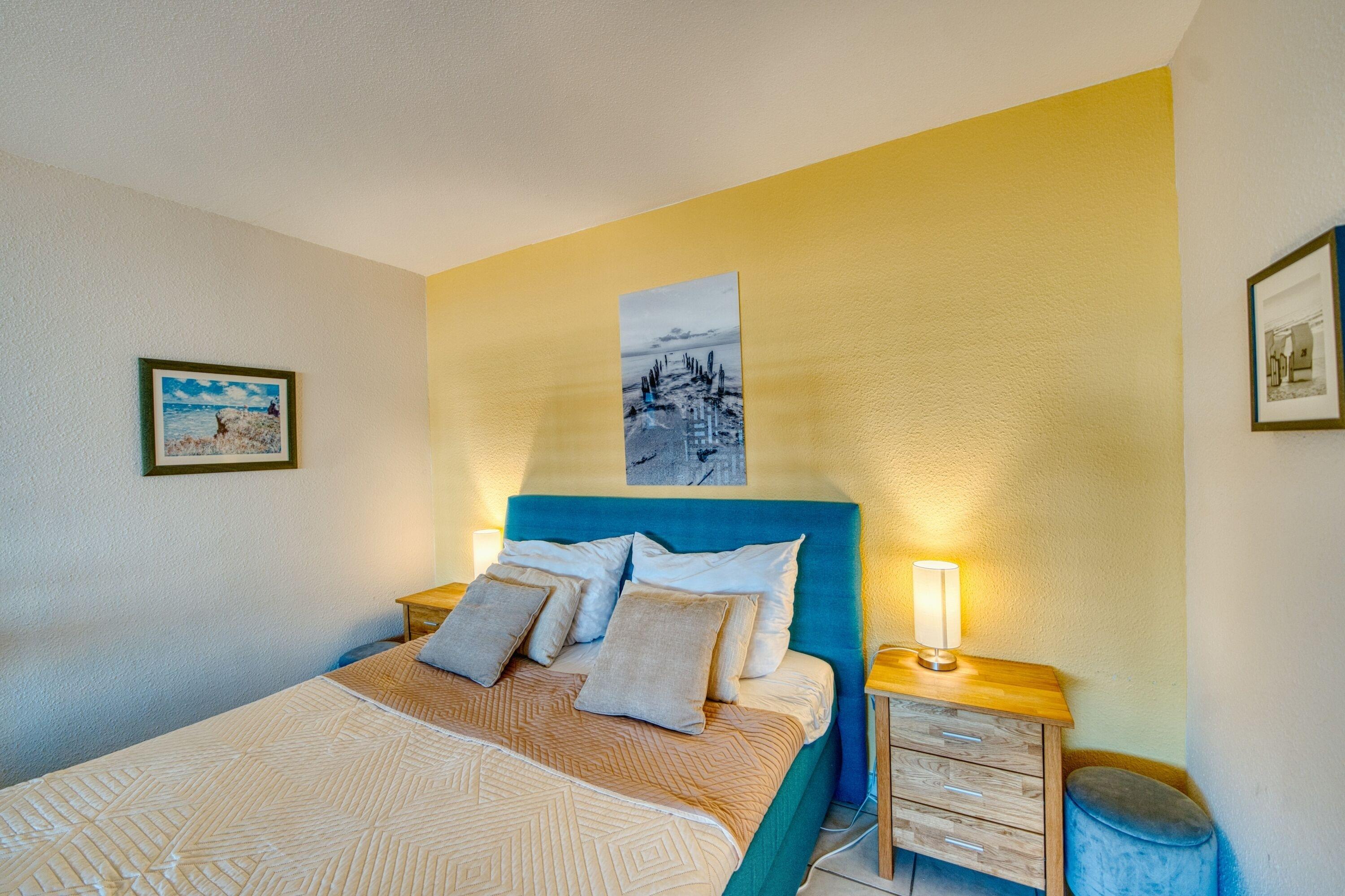Die Wohnung verfügt über ein Wohnzimmer mit Schlafcouch und Essecke, einen offenen Schlafbereich mit Boxspringbett (160x200 cm) sowie einen separaten Kinderschlafbereich mit Schlafcouch, jeweils durch Vorhänge abgetrennt. Ein großer Wandschrank bietet viel Stauraum. Eine Waschmaschine steht in der Wohnung zur Verfügung.