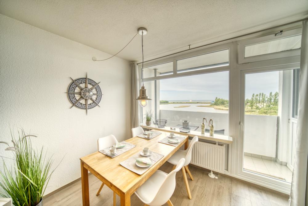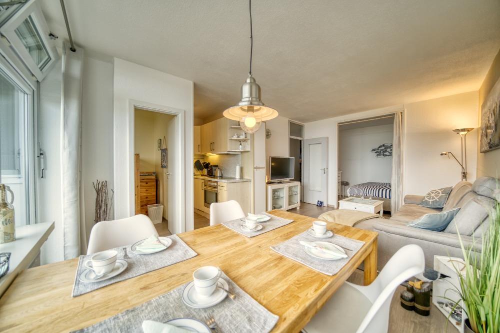 Die Wohnung verfügt über einen Schlafraum mit Boxspringbett (160x200 cm) sowie ein separates Schlafzimmer mit Etagenbett. Das Wohn-Esszimmer ist mit Ecksofa, Flachbild-TV und Esstisch ausgestattet und bietet direkten Zugang zum Balkon.