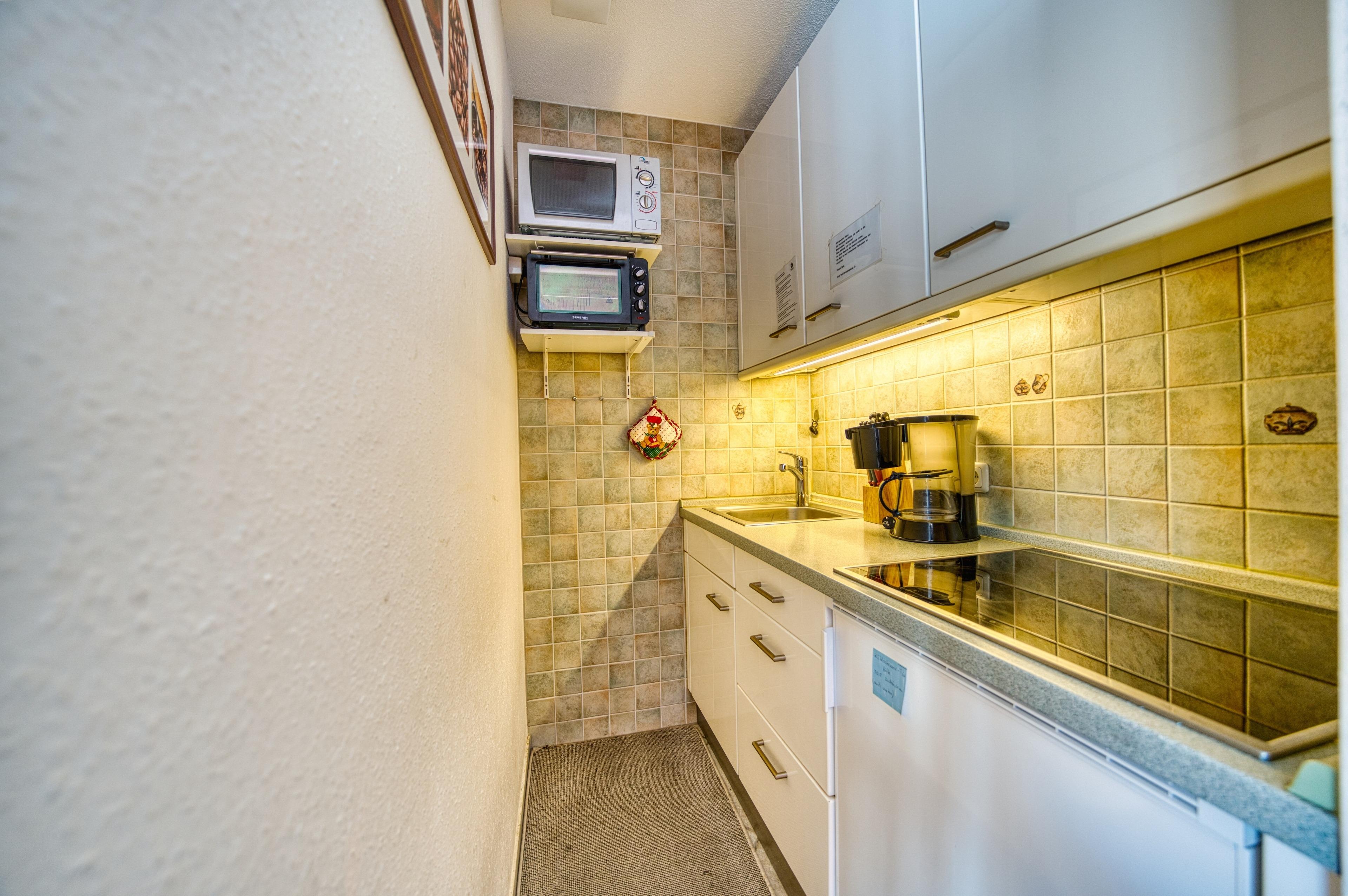 Die Küche verfügt über Cerankochfeld, Kühlschrank mit Gefrierfach, Mikrowelle, Kaffeemaschine, Toaster und Wasserkocher. Das Badezimmer ist mit Duschkabine und Handtuchtrockner ausgestattet.