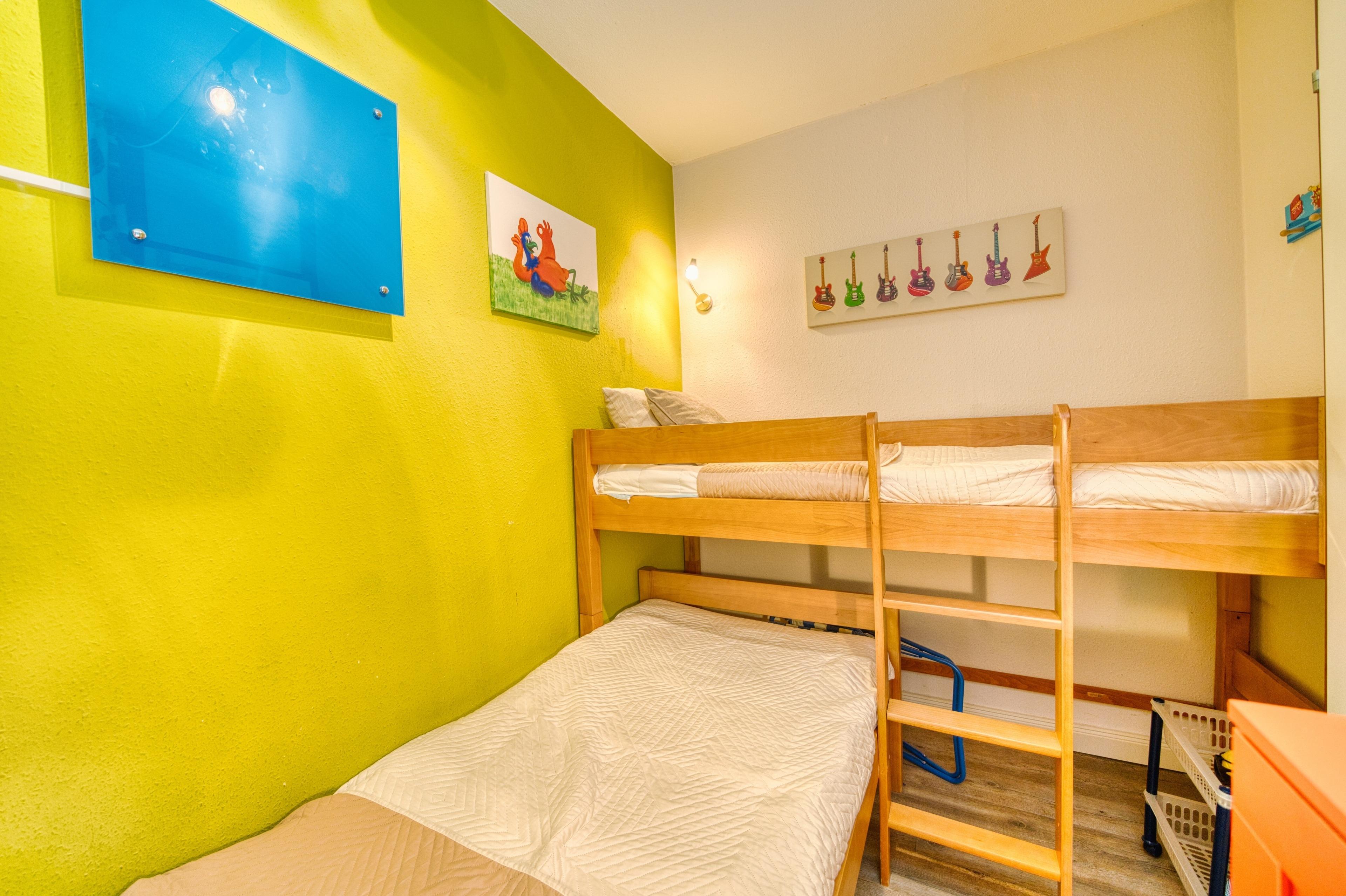 Der Wohn-/Schlafbereich ist mit Doppelbett, Flachbild-TV und WLAN ausgestattet. Zusätzlich steht ein separates Kinderzimmer mit Etagenbett sowie ein weiterer TV zur Verfügung.