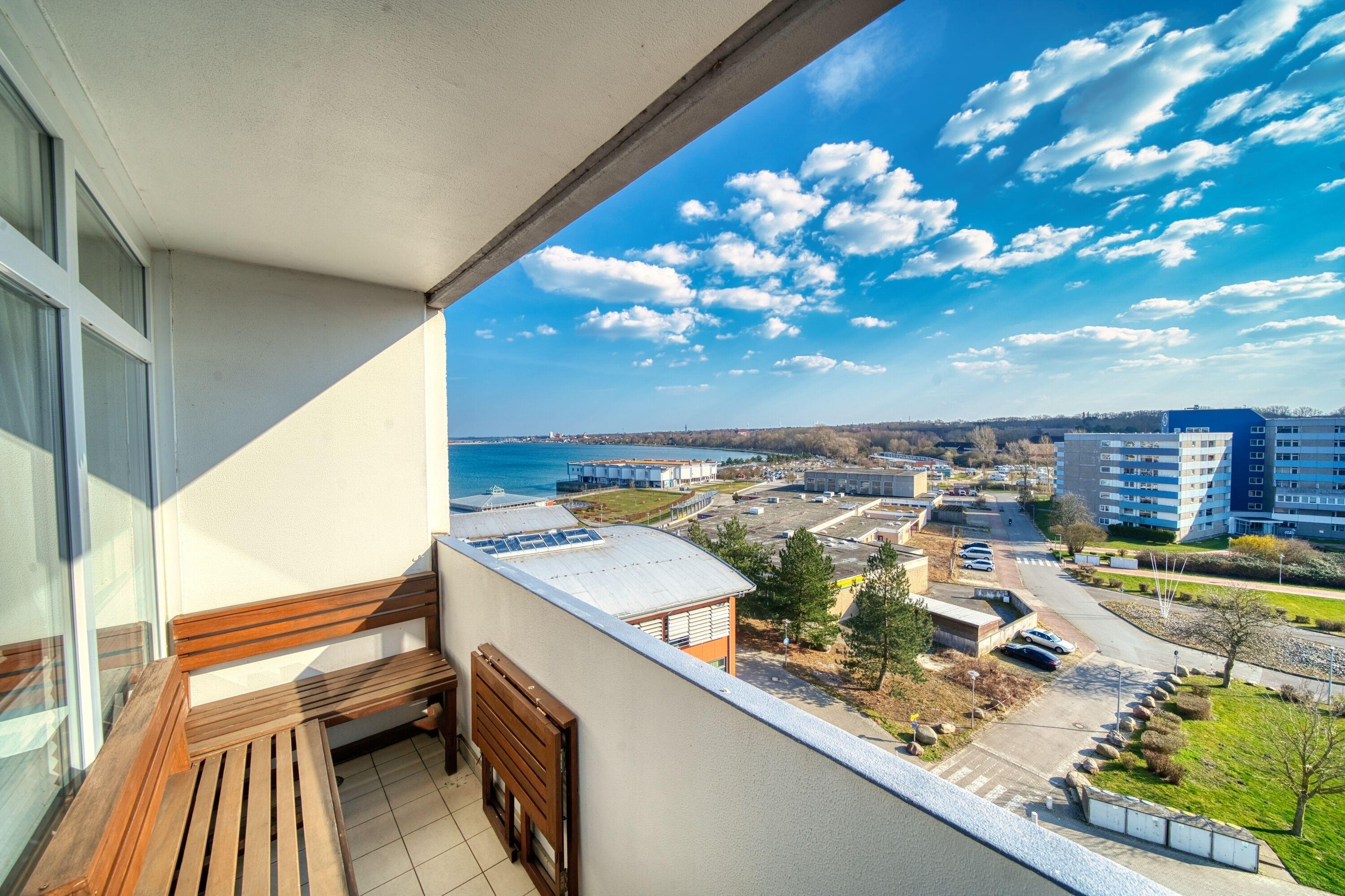 Stilvolle Ferienwohnung in Heiligenhafen mit Südbalkon und seitlichem Binnenseeblick, ideal für Familien und Paare.