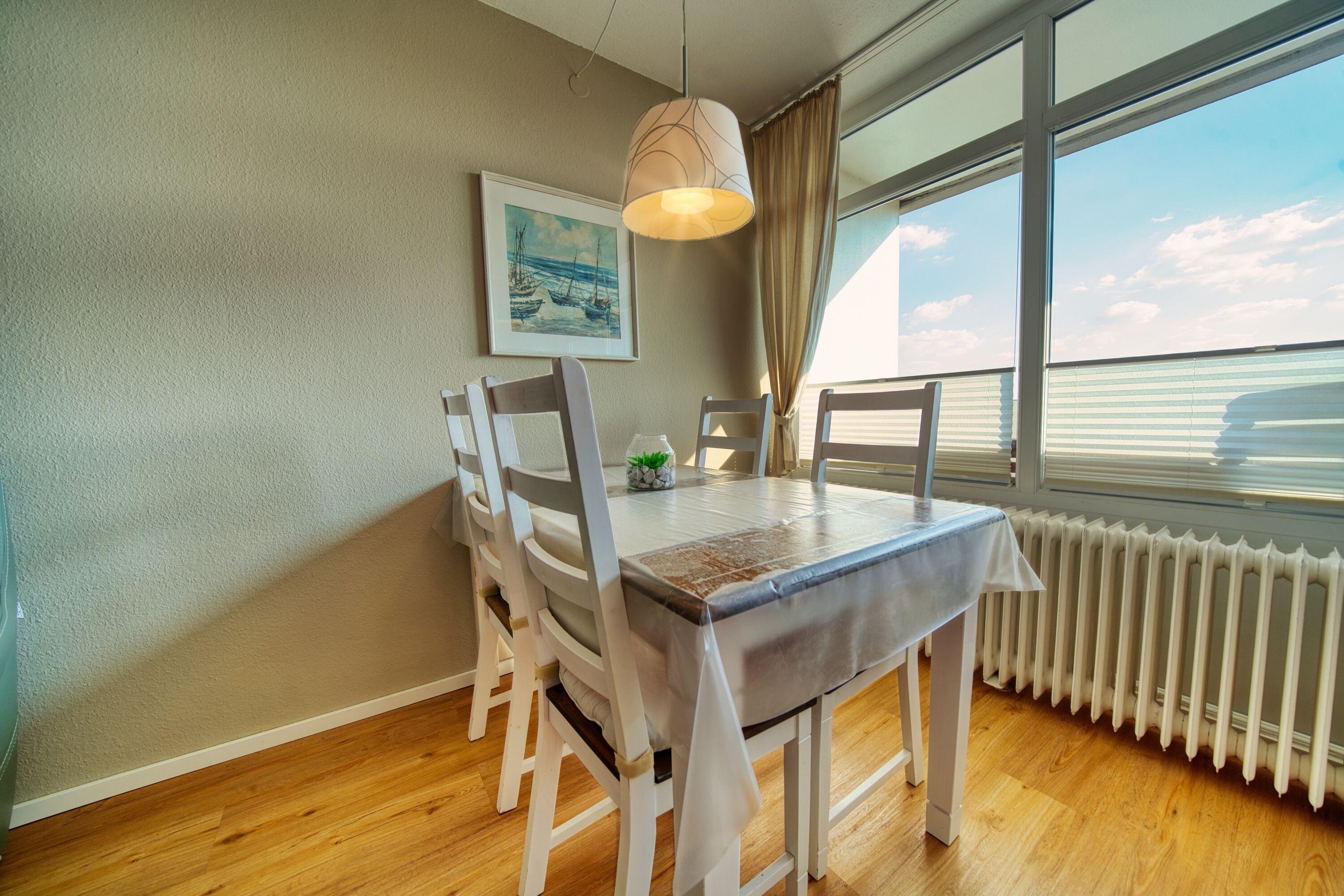 Diese stilvolle Wohnung liegt in der 7. Etage des Hauses A im Ferienpark Heiligenhafen. Der Südbalkon bietet Sonnenschein und einen seitlichen Blick auf den Binnensee. Auf 45 m² Wohnfläche finden bis zu 4 Personen bequem Platz – ideal für Familien oder Paare.