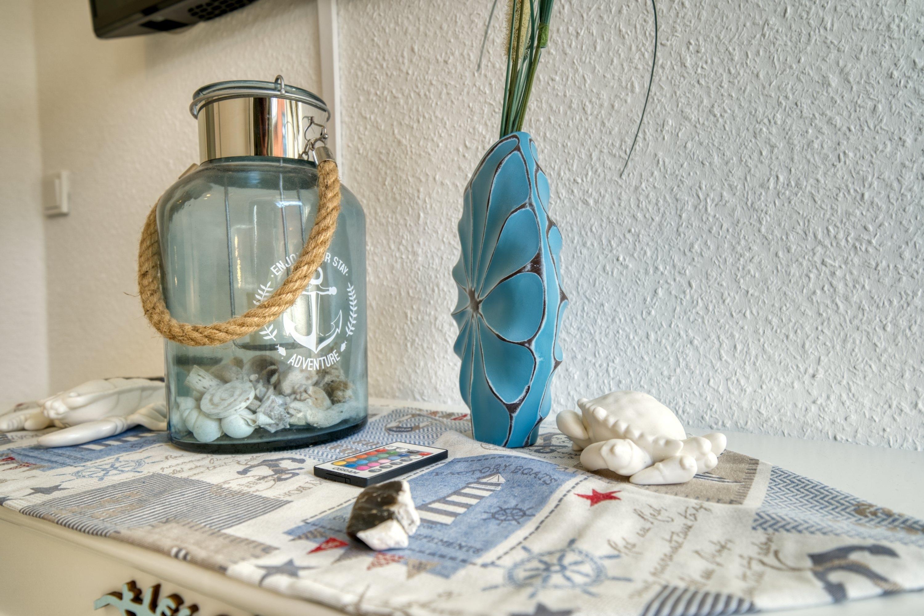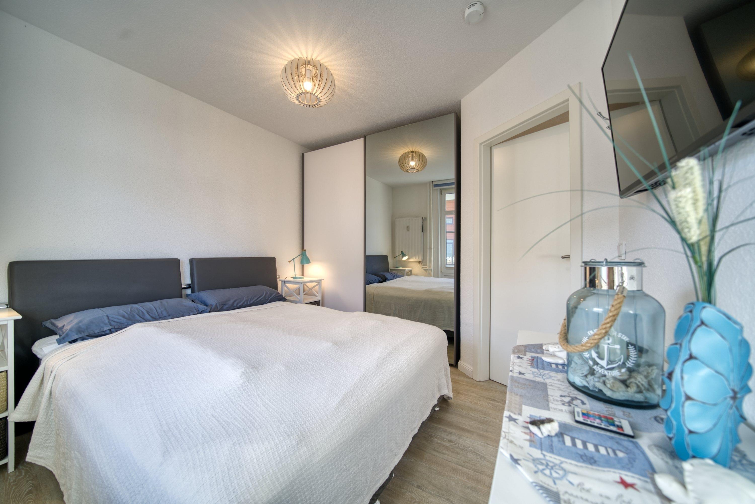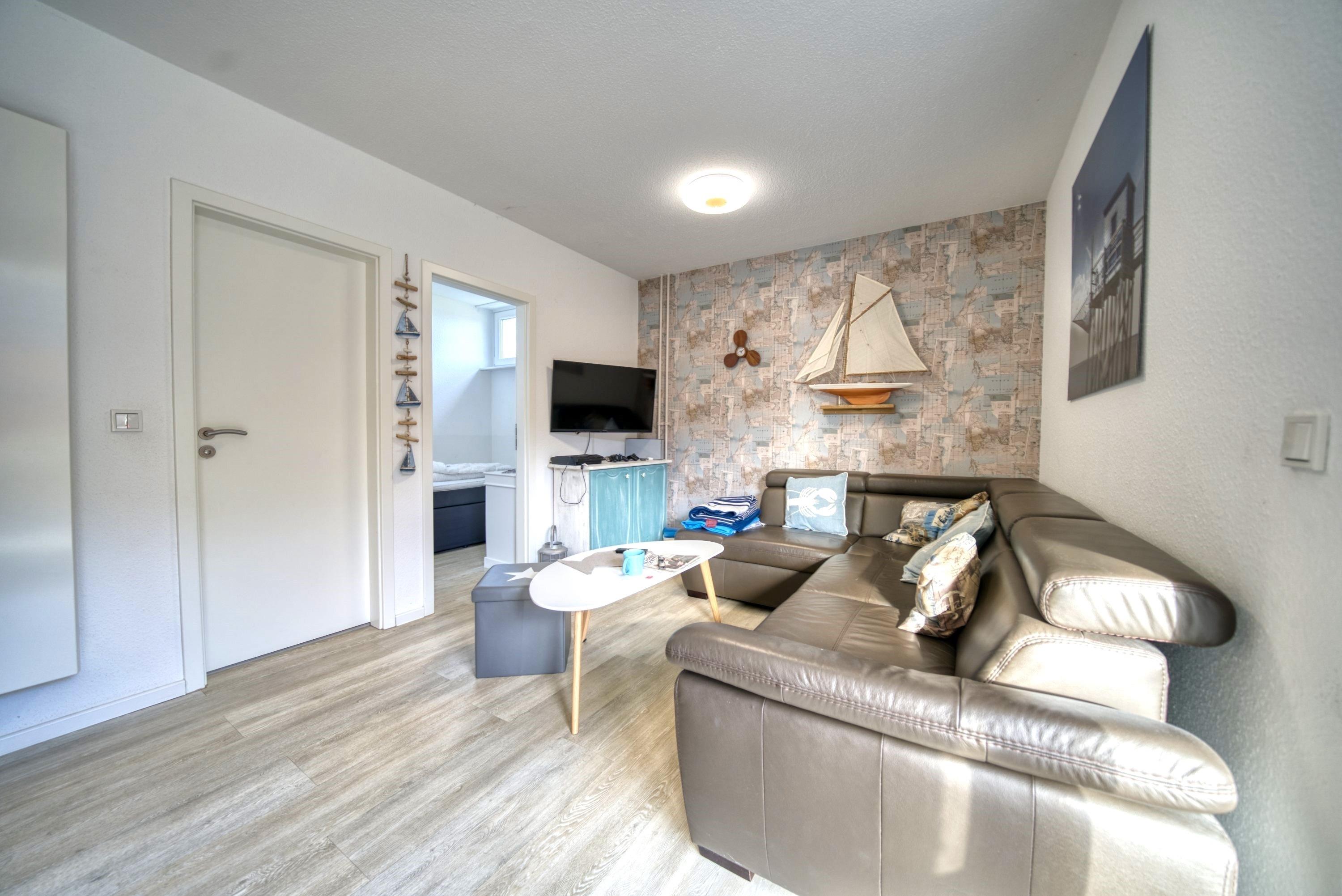 Die Wohnung verfügt über einen Wohnbereich mit Sofa, Esstisch und TV, ein Schlafzimmer mit Boxspringbett und TV, ein Kinderzimmer mit Einzelbett sowie eine voll ausgestattete Küche mit Backofen, Ceranfeld, Kühlschrank mit Gefrierfach, Kaffeemaschine, Wasserkocher und Toaster. Das moderne Bad ist mit Dusche ausgestattet.
