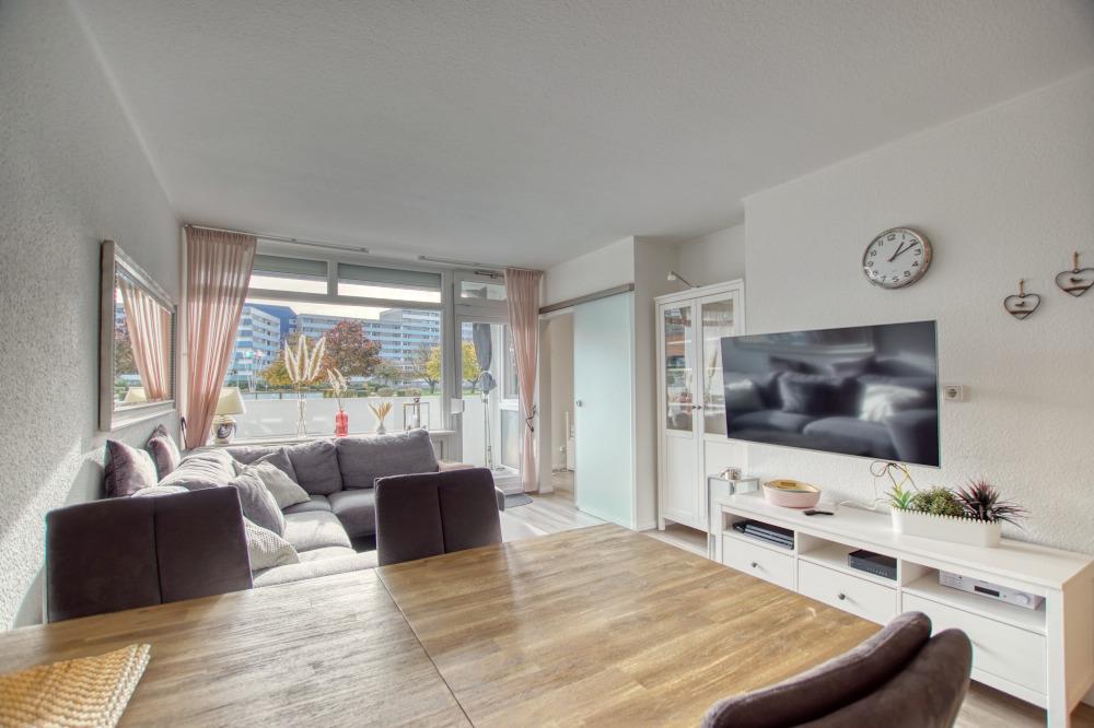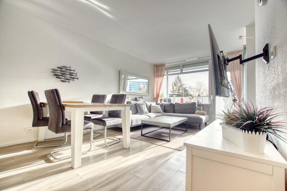 Die Ferienwohnung verfügt über ein Wohn-/Esszimmer mit Couch, Essecke, Flachbild-TV und einen Elternschlafbereich mit Doppelbett, TV und Zugang zum Kinderzimmer, ein Kinderzimmer mit ausziehbarem Einzelbett und TV sowie eine moderne Küche mit Backofen, Cerankochfeld, Kühlschrank mit Gefrierfach, Geschirrspüler, Kaffeemaschine und Wasserkocher.