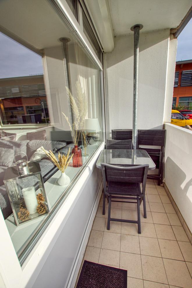 Diese stilvoll renovierte 45 m² Wohnung im Haus A bietet Platz für bis zu 4 Personen. Der gemütliche Balkon blickt in den Innenhof und lädt zum Entspannen ein.