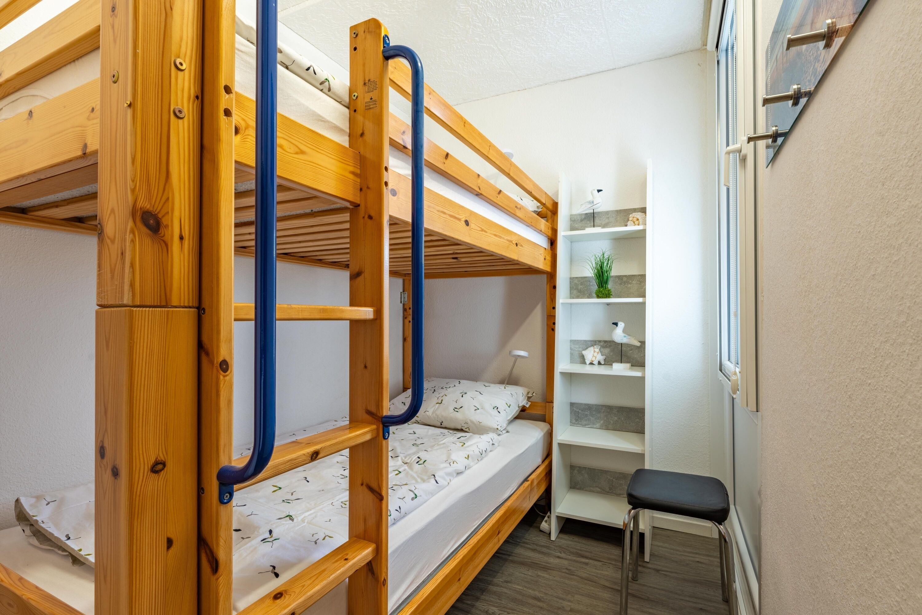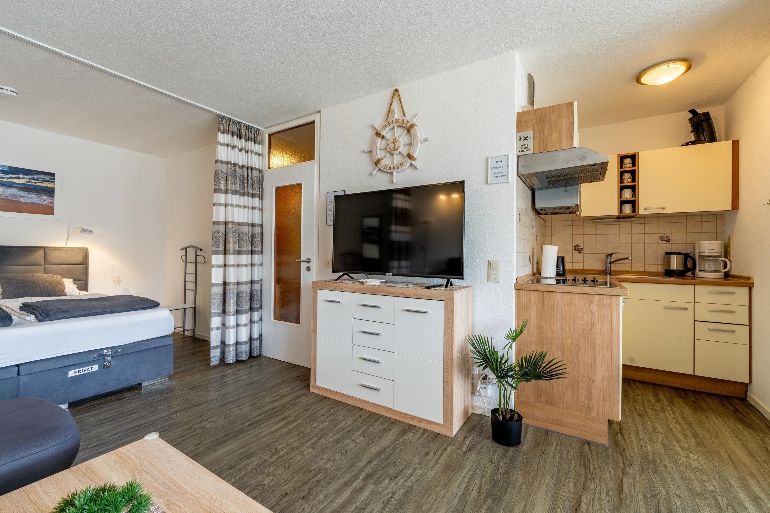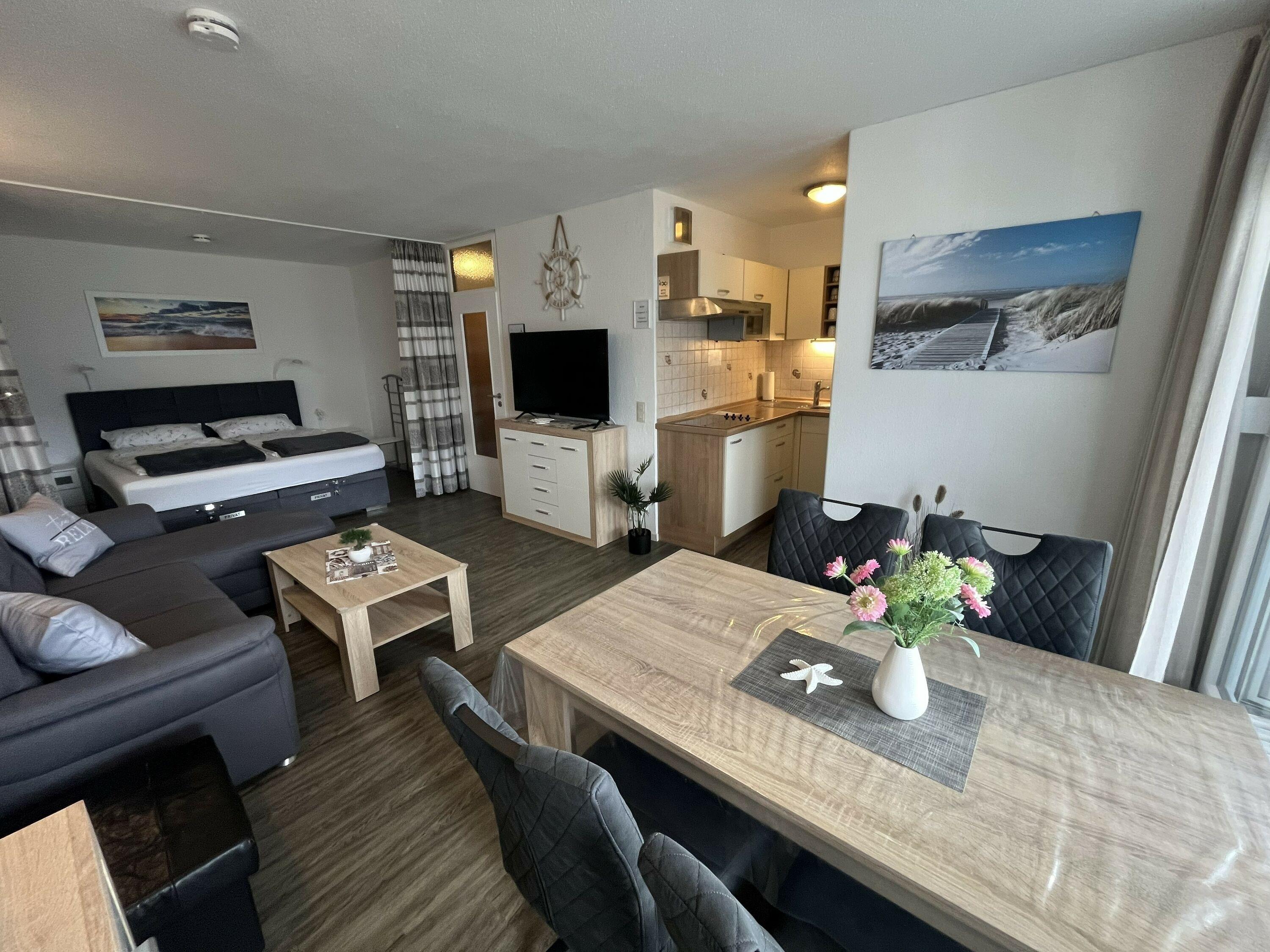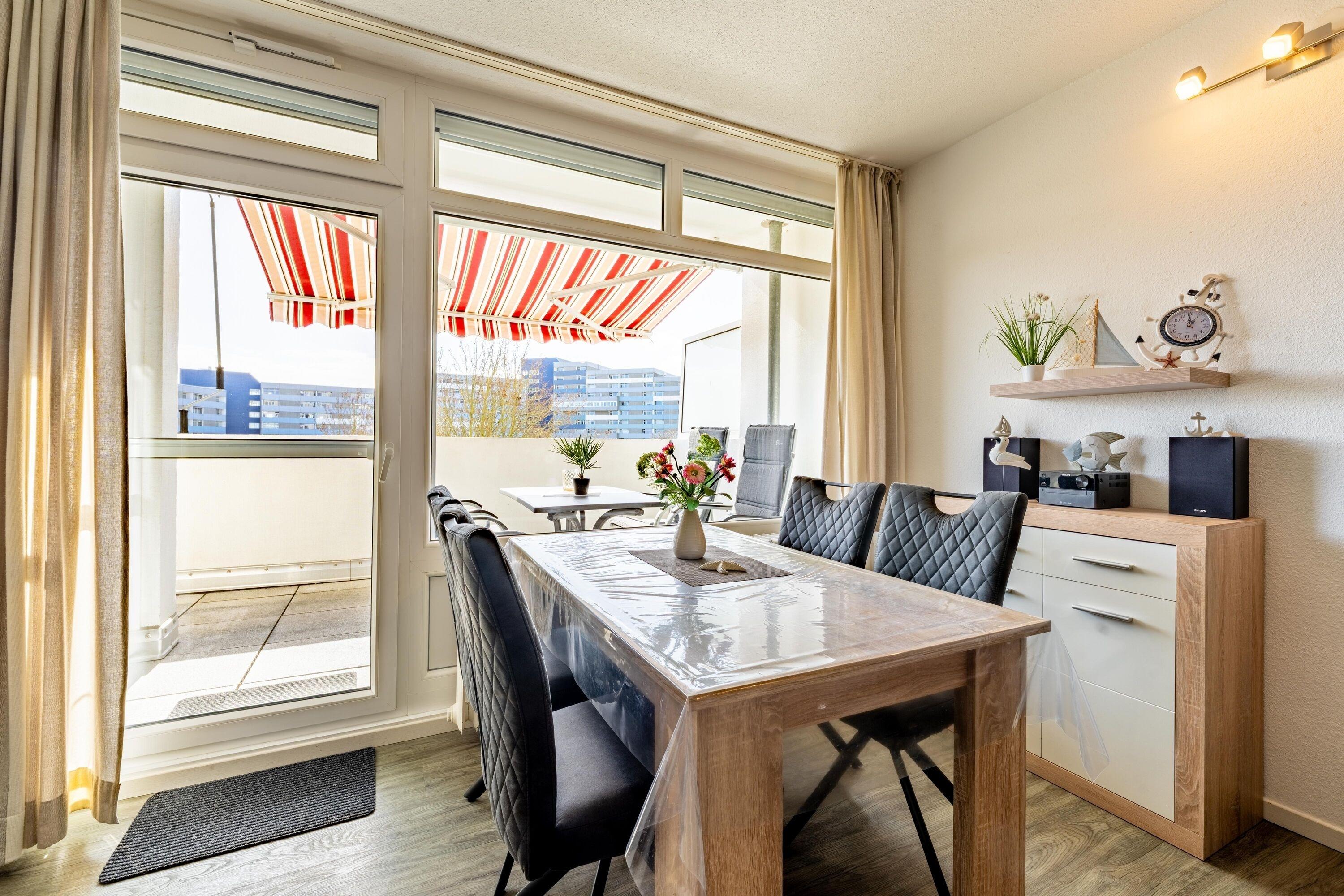 Die Wohnung befindet sich im Haus B des Ferienparks Heiligenhafen und wurde 2026 renoviert. Sie liegt in der 3. Etage und bietet einen schönen Ausblick auf Innenhof und Binnensee. Der extra große Südbalkon mit Gartenmöbeln und Markise lädt zum Sonnenbaden ein. Auf 51?m² finden Sie Wohn-/Esszimmer mit Flachbild-TV und Musikanlage, Schlafbereich mit Doppel-Boxspringbett (180?×?200?cm), separates Kinderzimmer mit Etagenbett, voll ausgestattete Küche mit Kühlschrank, Ceranfeld, Senseo, Toaster, Kaffeemaschine, Wasserkocher, Mikrowelle und Mixer sowie Badezimmer mit Dusche/WC. Max. 4 Personen, Nichtraucher, keine Haustiere. WLAN inklusive.