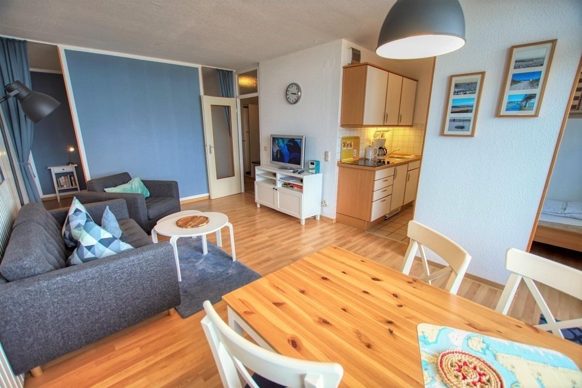 Die ca. 45 m² große Wohnung ist ideal für bis zu 3 Personen. Der Wohn-/Essbereich verfügt über eine gemütliche Sitzgarnitur, Flachbild-TV, Radio sowie einen Essplatz am Fenster. Der Schlafbereich ist mit einem Doppelbett (optisch abgetrennt) ausgestattet, zusätzlich steht ein separates Kinderzimmer mit Einzelbett zur Verfügung.