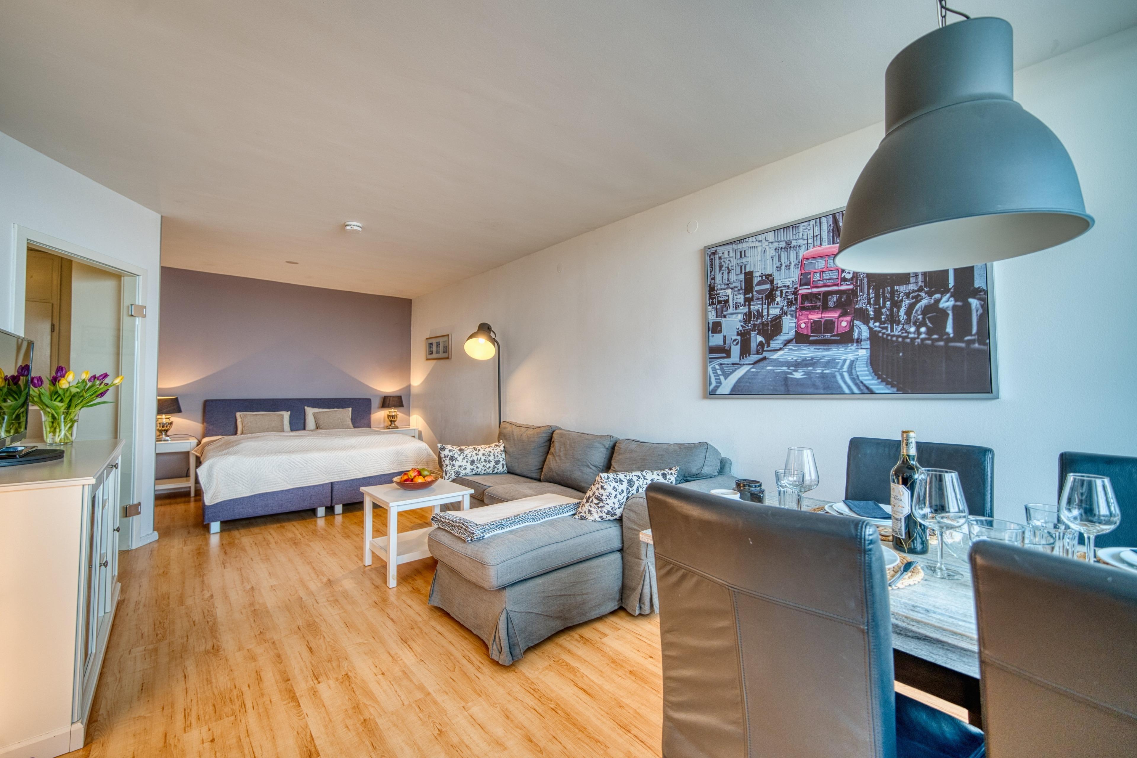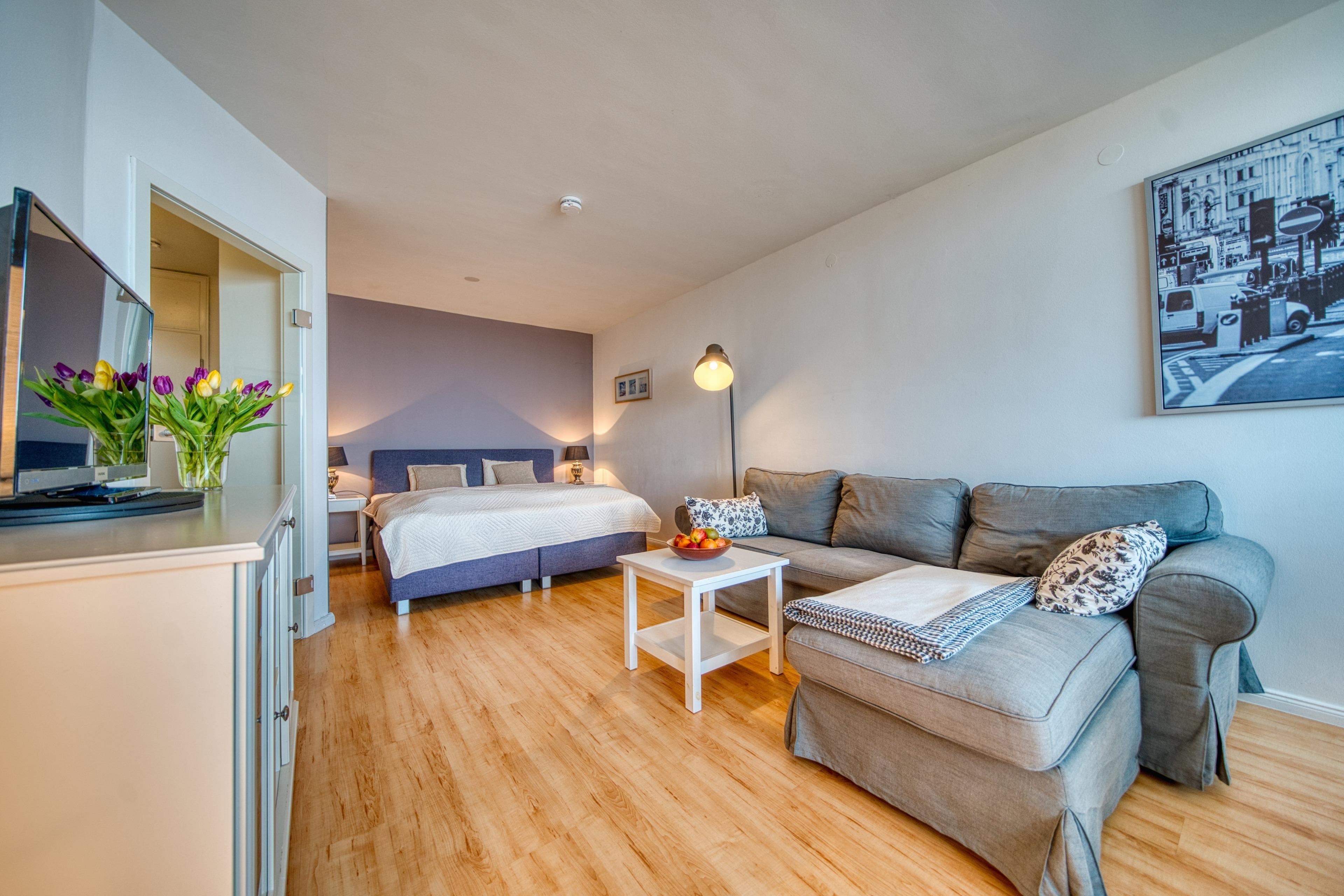 Wohn-/Schlafraum mit komfortabler Sitzgelegenheit [&] TV-Flachbild