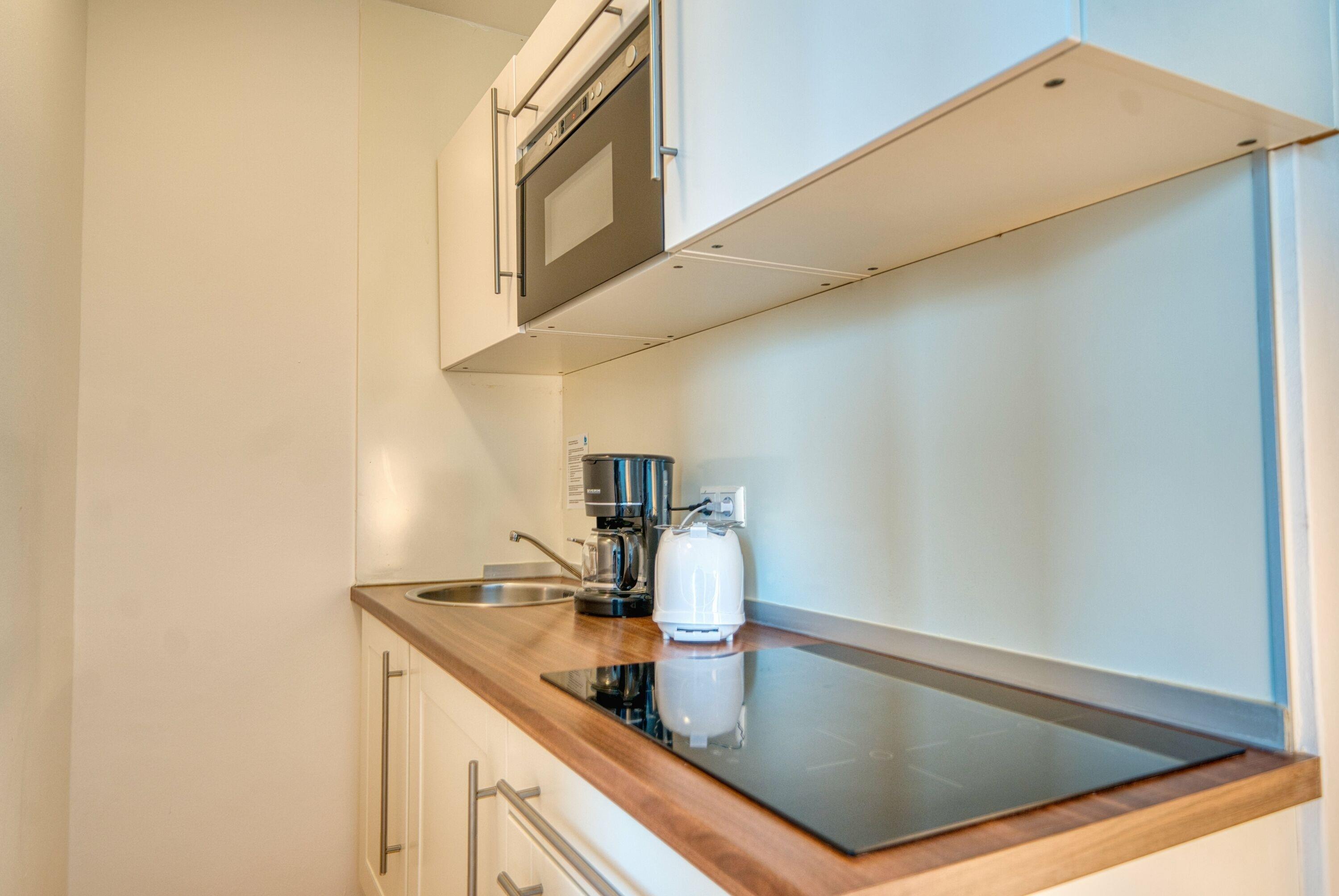 moderne Küchenzeile mit 4-Zonen-Induktionskochfeld, Kaffeemaschine (Filter), Mikrowelle [&] allen wichtigen Utensilien