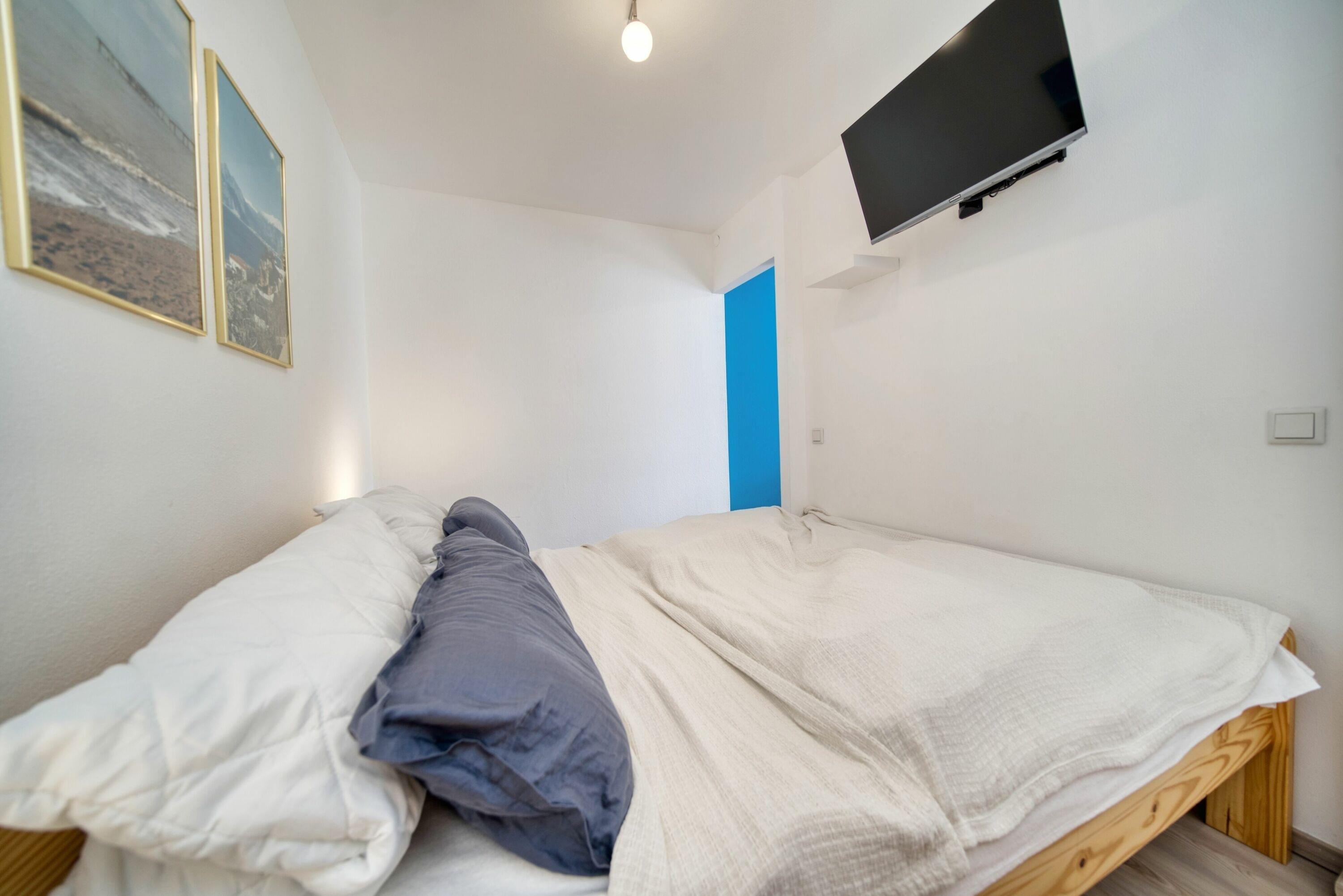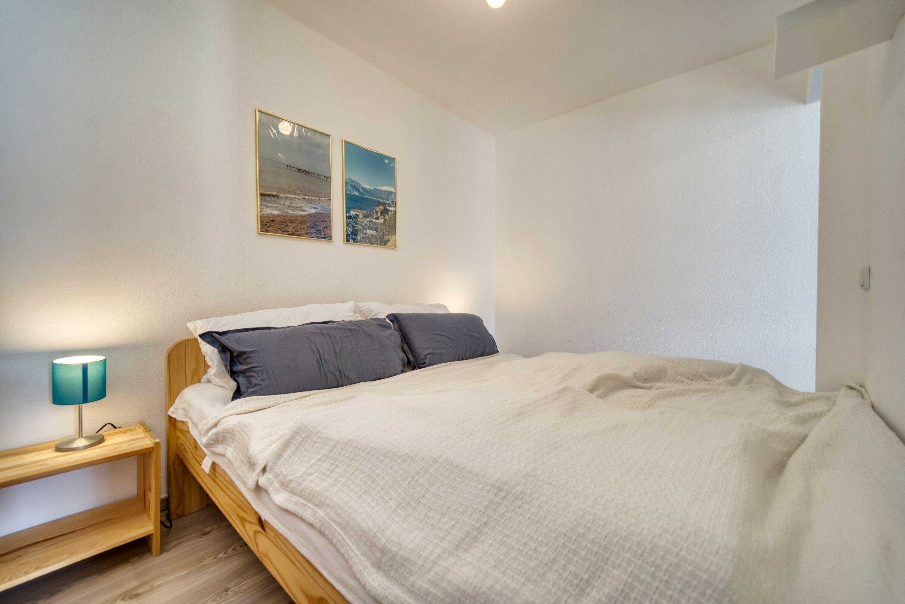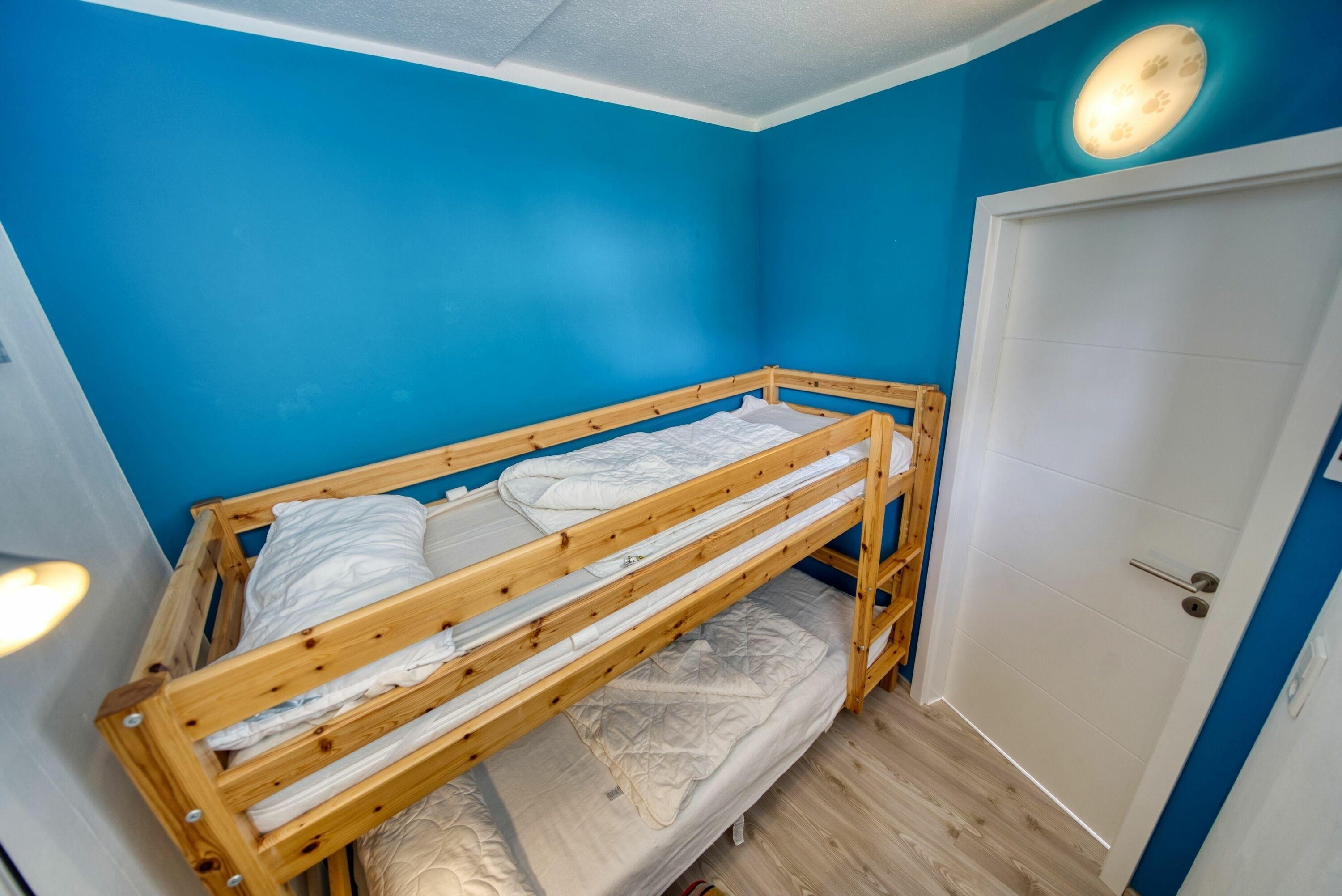 Die Wohnung verfügt über ein Wohn-/Esszimmer mit Sitzecke, Flachbild-TV und Radio, einen Elternschlafbereich mit Doppelbett und TV sowie ein separates Kinderzimmer mit Etagenbett. Die moderne Einbauküche ist mit 4-Platten-Ceranherd, Kühlschrank mit Gefrierfach, Geschirrspüler und Waschmaschine im Flurschrank ausgestattet. Das Bad bietet Dusche und WC.