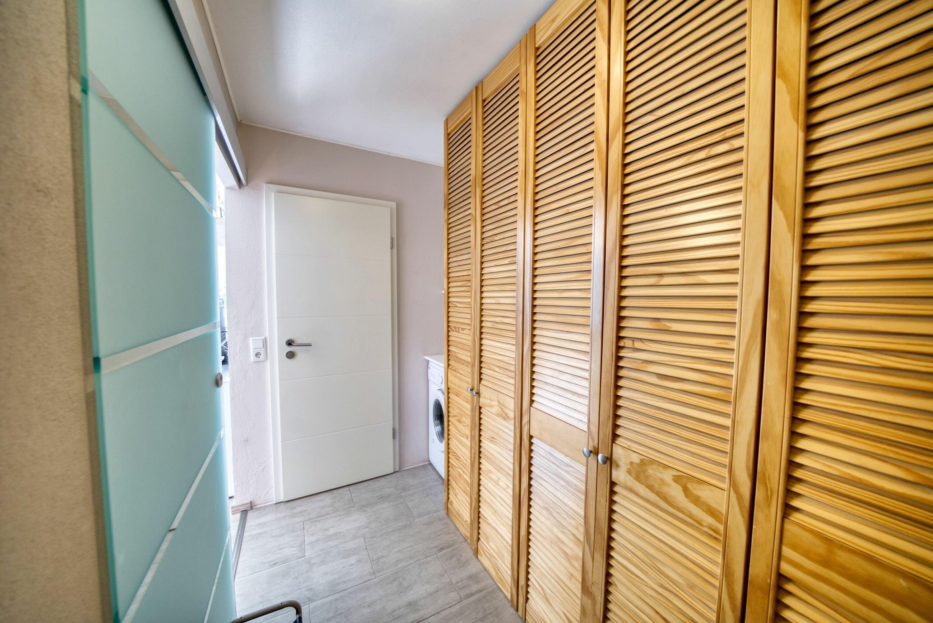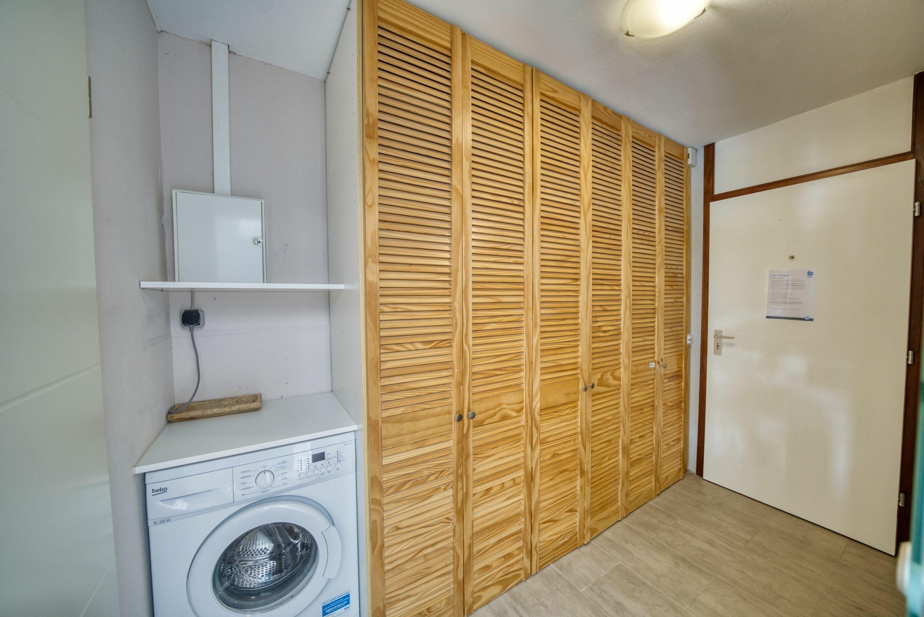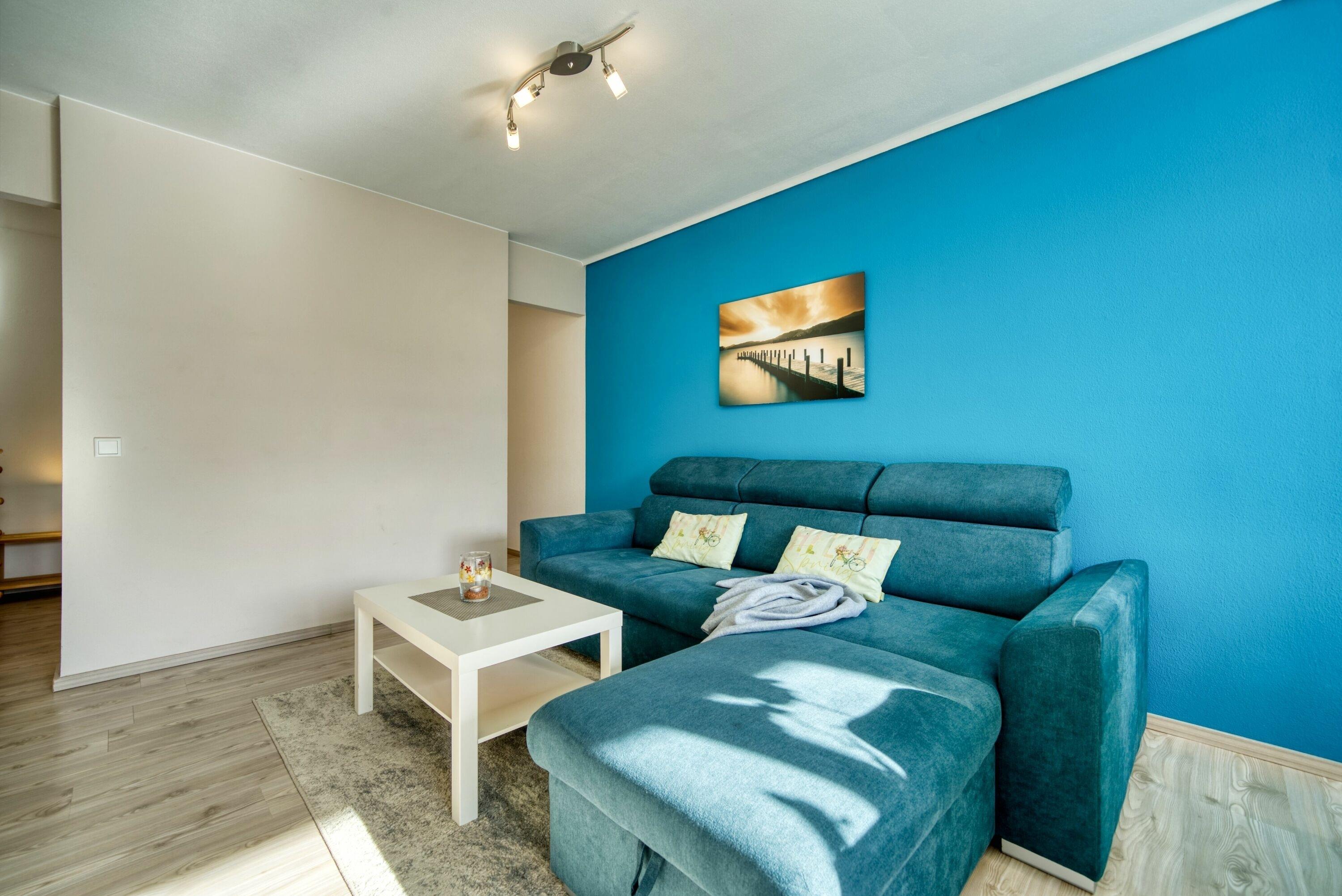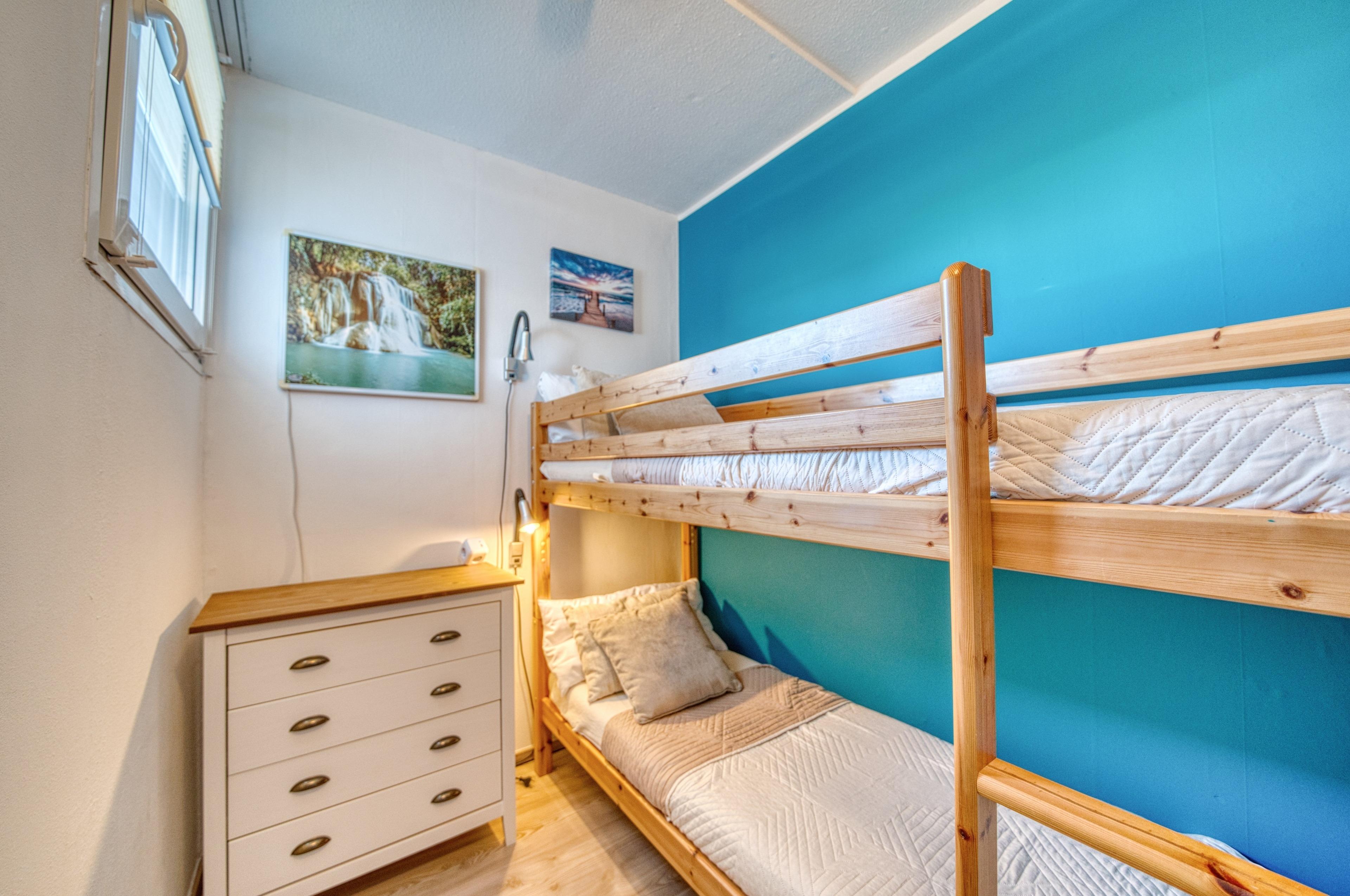 Die Wohnung verfügt über ein Wohn-/Esszimmer mit Sitzecke, Flachbild-TV und Radio, einen Elternschlafbereich mit Doppelbett und TV sowie ein separates Kinderzimmer mit Etagenbett. Die moderne Einbauküche ist mit 4-Platten-Ceranherd, Kühlschrank mit Gefrierfach, Geschirrspüler und Waschmaschine im Flurschrank ausgestattet. Das Bad bietet Dusche und WC.