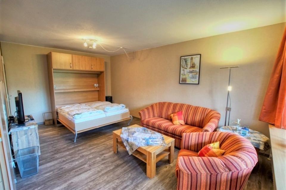 Die Unterkunft verfügt über einen Wohn-/Schlafbereich mit praktischem Schrankbett, Flachbild-TV und Laminatboden. Die offene Küche ist voll ausgestattet mit Ceran-Kochfeld, Kühlschrank, Kaffeemaschine und Wasserkocher. Das Badezimmer bietet Dusche und WC.
