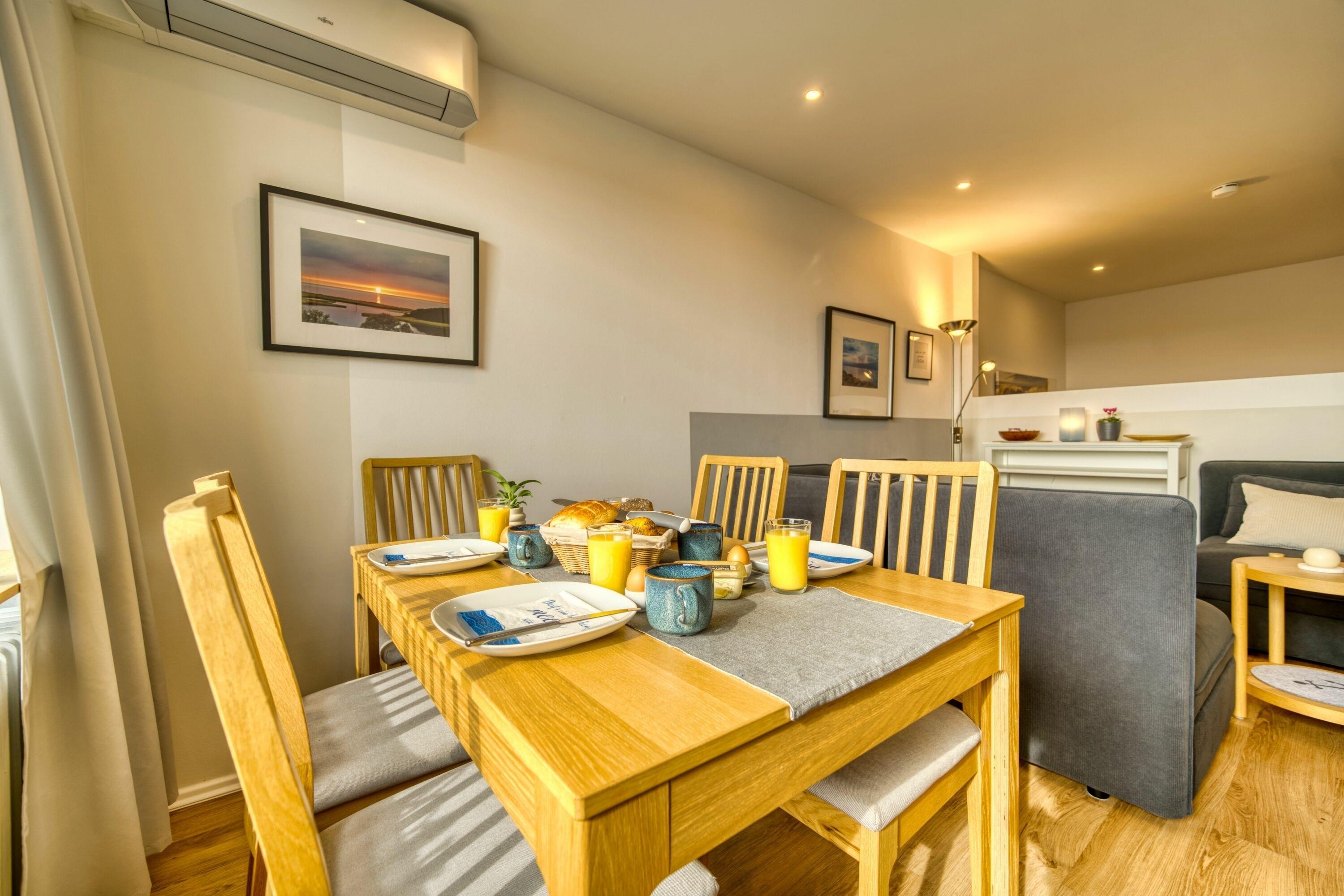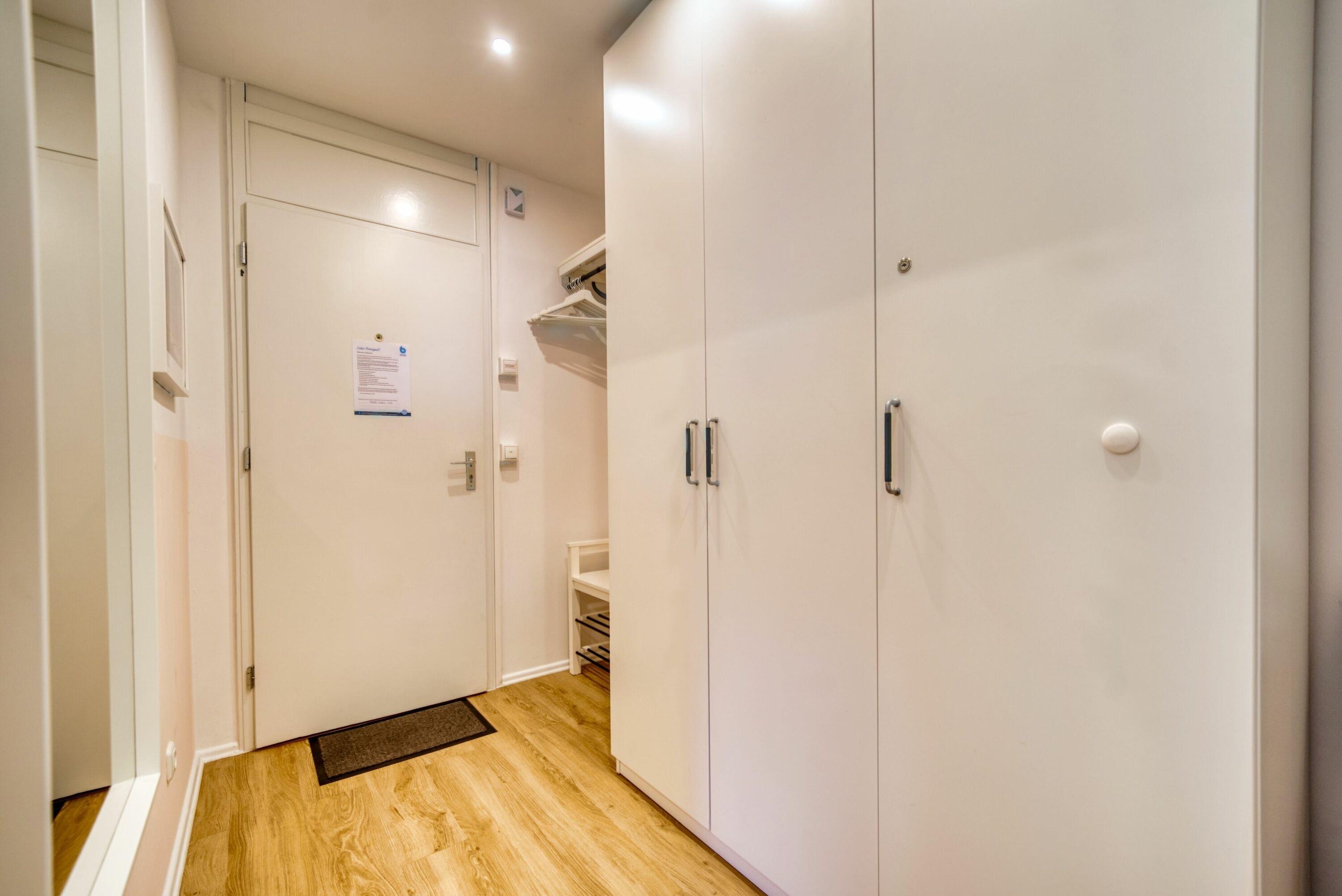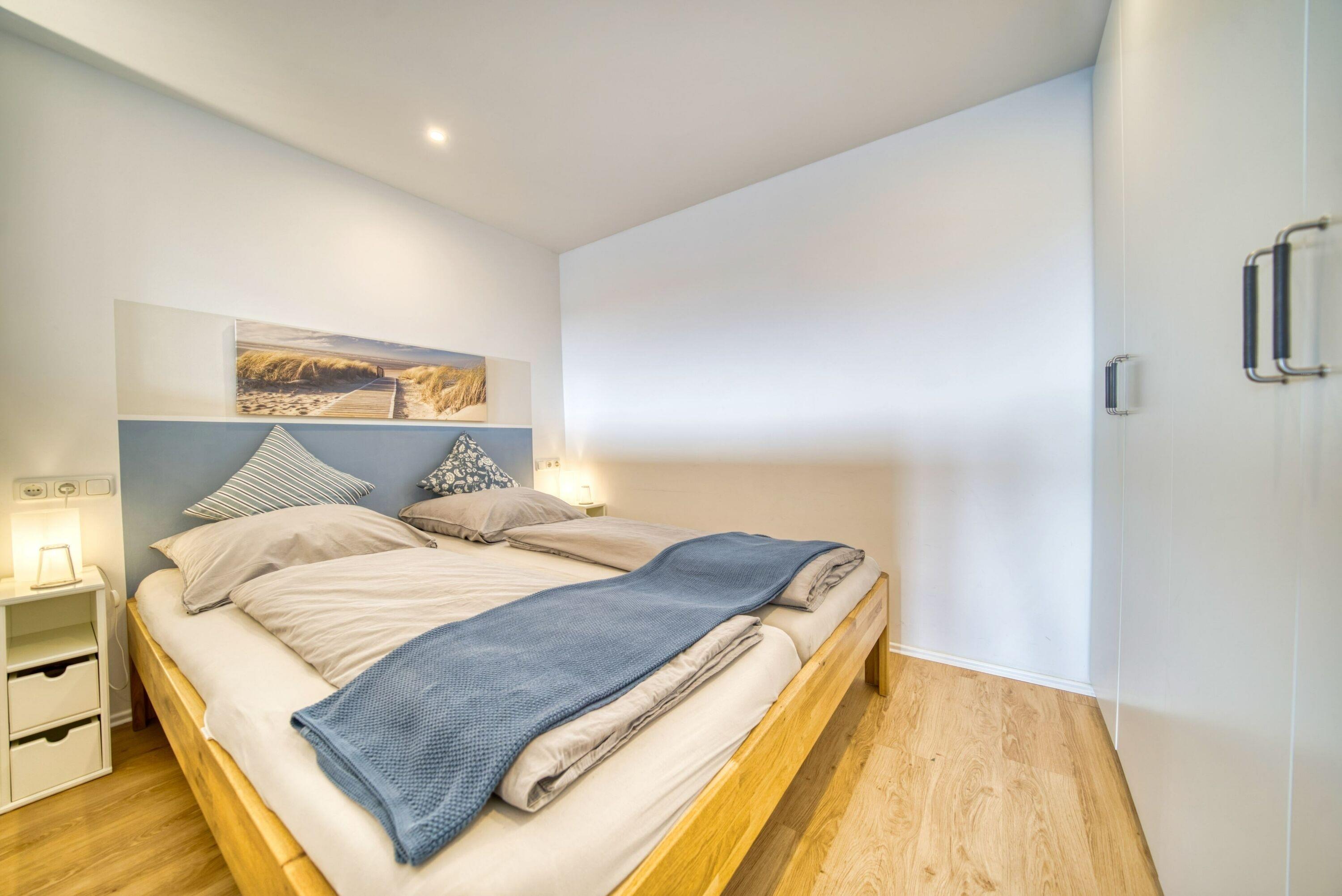 Wohn-/Schlafbereich mit Doppelbett, separates Schlafzimmer mit Etagenbett, Vinylboden, Smart-TV, Esstisch mit Binnenseeblick, Balkon mit Rollo. Küche mit Ceranherd, Backofen, Kühlschrank, Wasserkocher, Kaffeemaschine, Toaster. Bad mit Duschkabine. WLAN inklusive. Ca. 300?m zum Strand, Fahrstuhl, Fahrradräume, Parkplatz vorhanden. Nichtraucherwohnung, keine Haustiere. Hinweis: Neubau auf Nachbargrundstück ab Oktober 2025 kann zu Beeinträchtigungen führen.