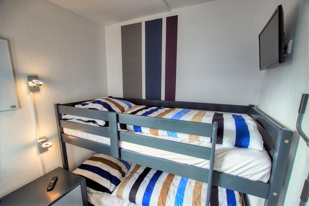 Zur Ausstattung gehören ein Wohn-Esszimmer mit Fernseher und Radio, ein Elternschlafbereich im Wohnzimmer mit Doppelbett sowie ein separates Kinderzimmer mit Etagenbett. Die neue Küche ist komplett ausgestattet mit Kühlschrank, Backofen, Ceranfeld, Geschirrspüler, Wasserkocher und Toaster. Das Bad verfügt über WC und Duschkabine mit niedrigem Einstieg. Kostenloses WLAN ist vorhanden. Nichtraucherwohnung, keine Haustiere, Fahrstuhl, Parkplatz hinter dem Ferienpark. Strand ca. 300?m entfernt, Aktiv-Hus mit Schwimmbad, Sauna, Wellness und Kinderspielwelt in der Nähe.