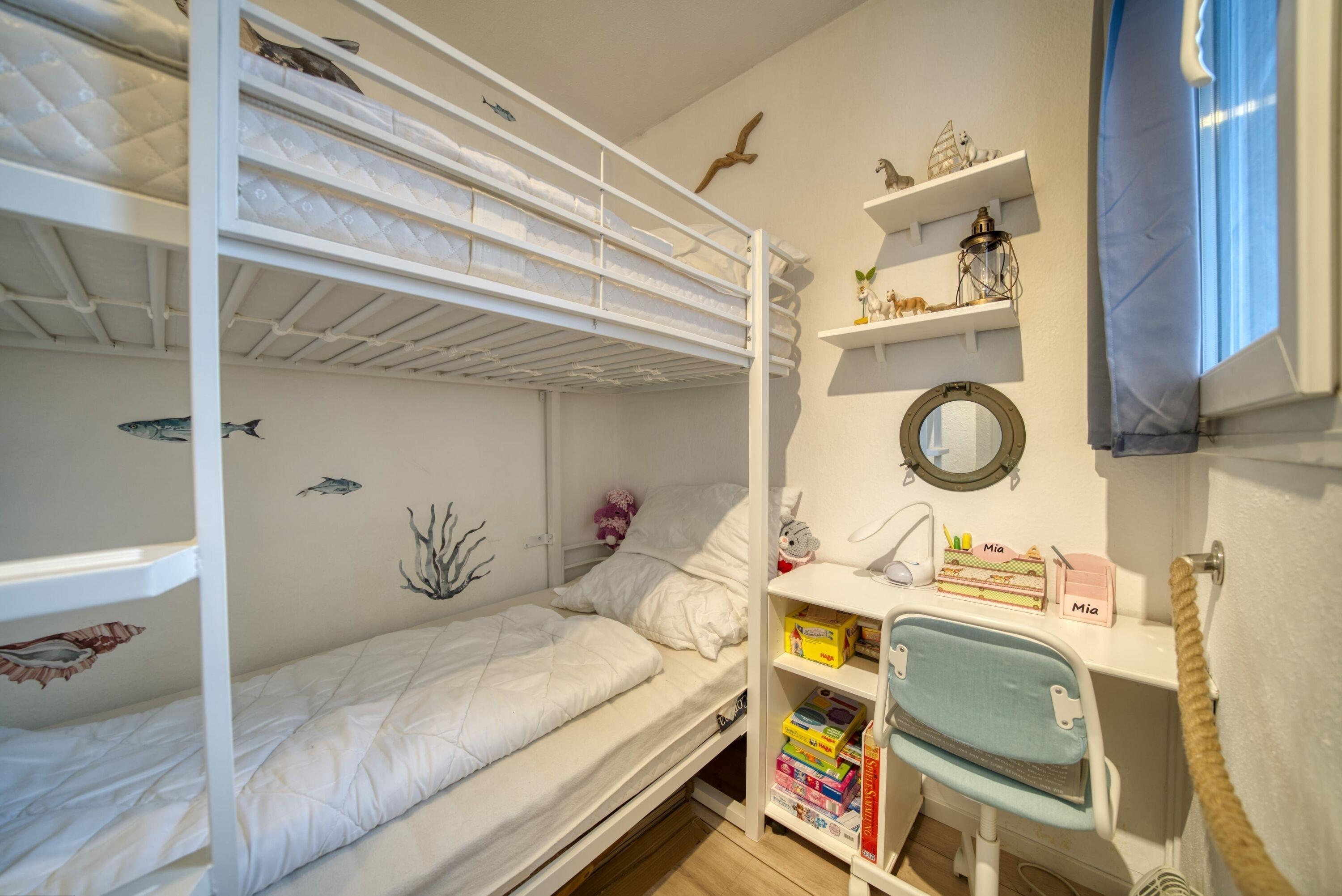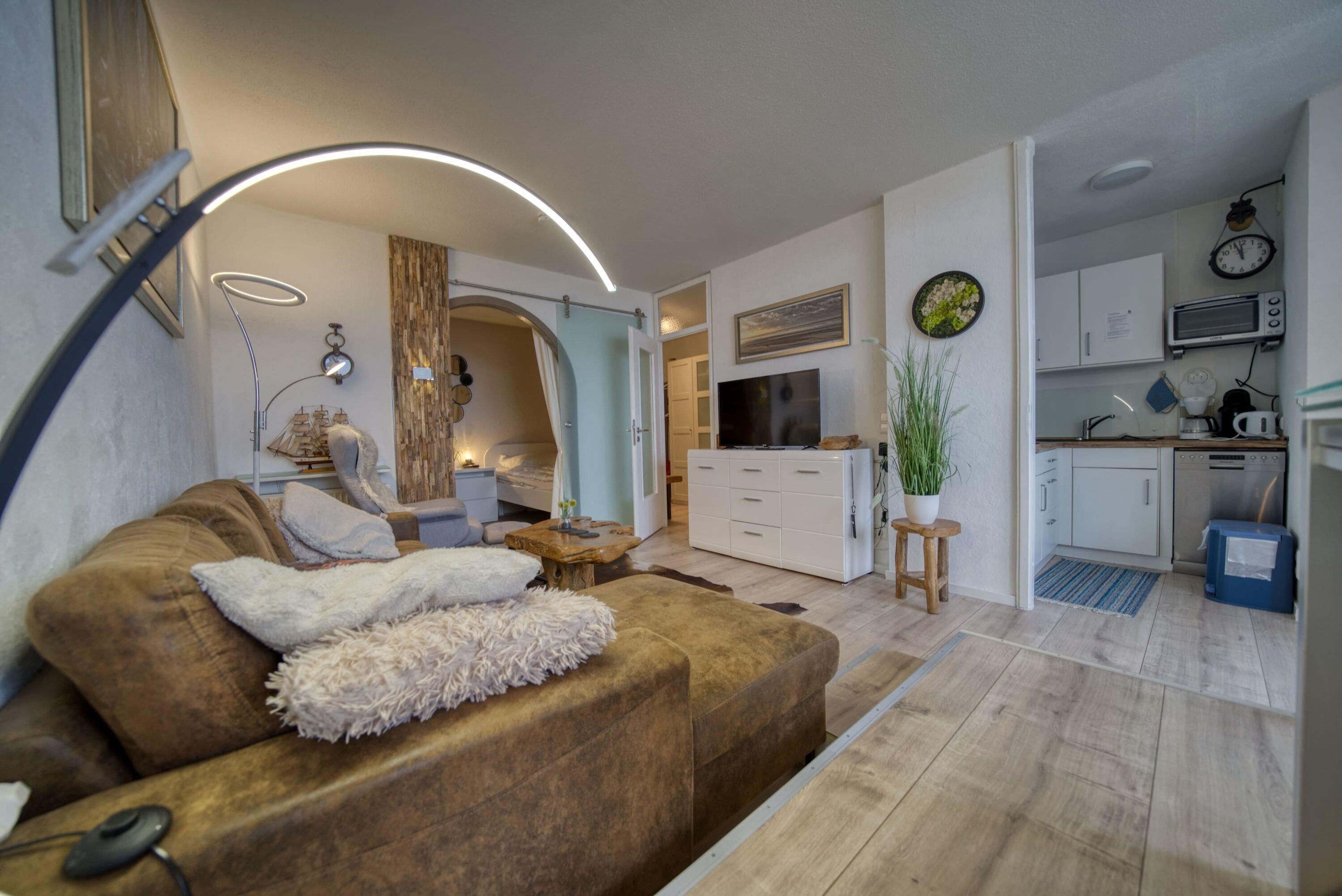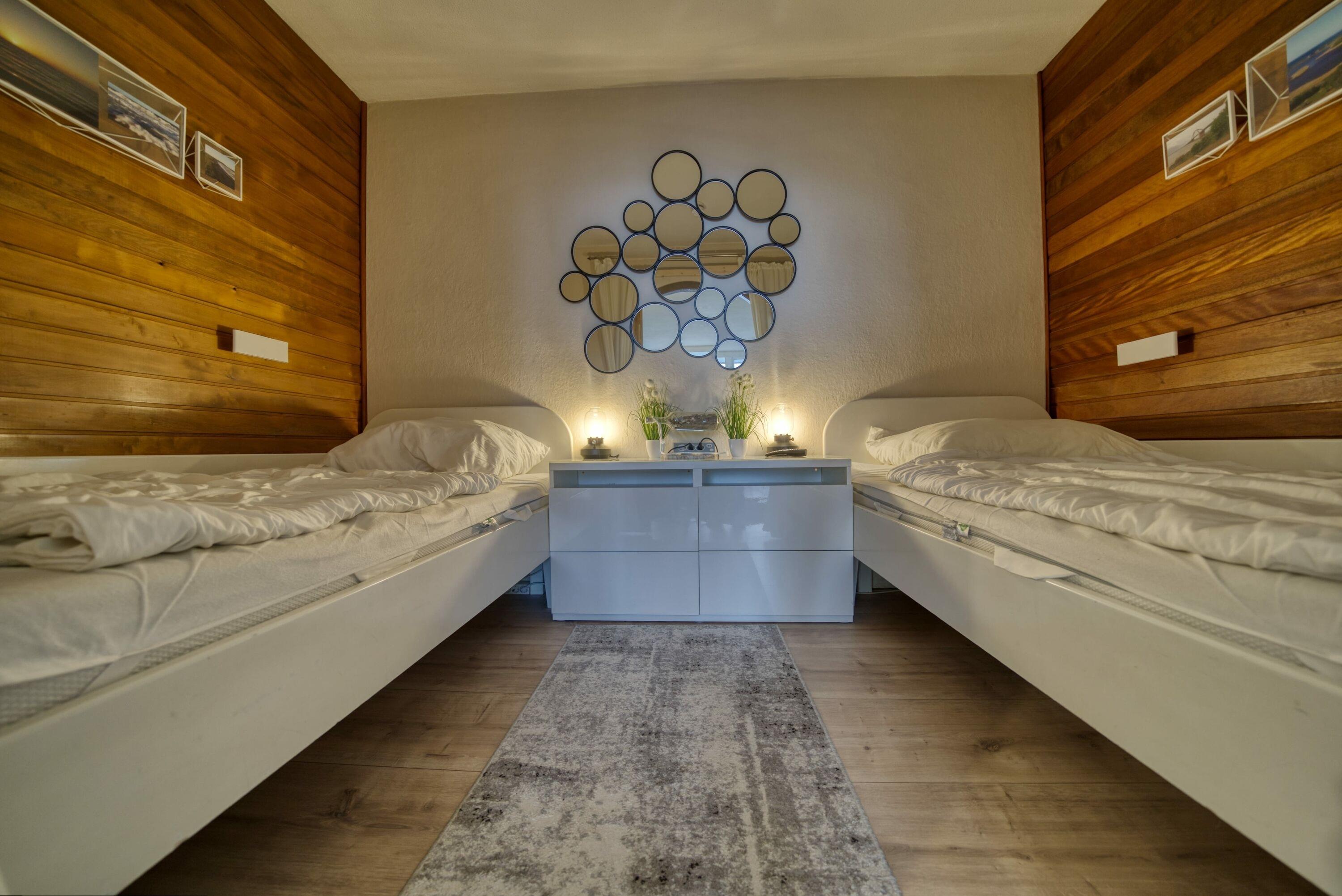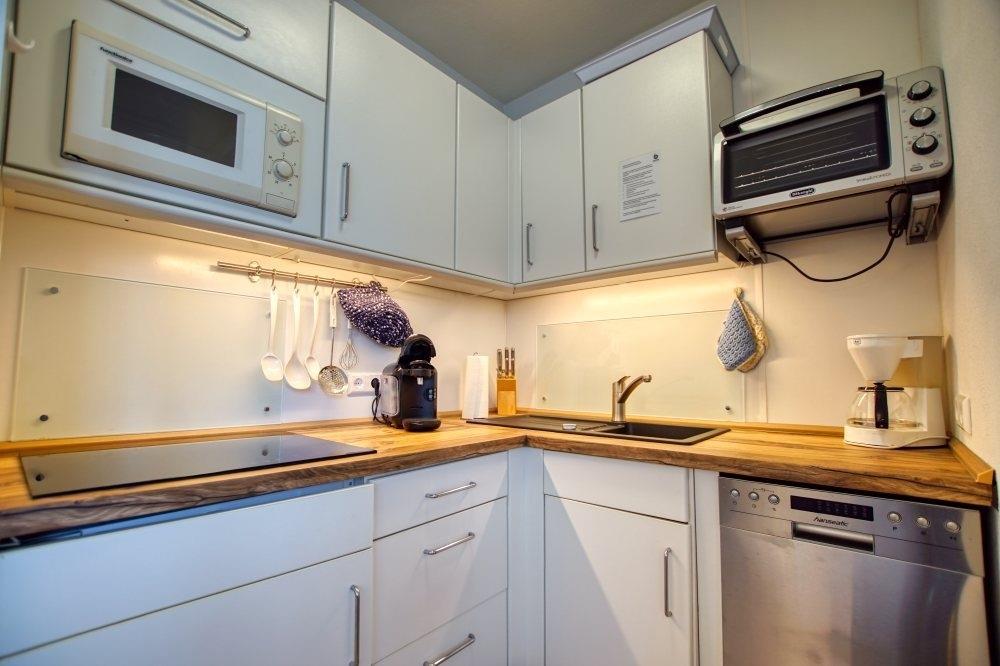 Der Wohn-/Schlafbereich verfügt über zwei Einzelbetten und TV, ein separates Schlafzimmer ist mit Etagenbett ausgestattet. Die Küche bietet Ceranherd, Mikrowelle, Beistell-Backofen, Kühlschrank mit Gefrierfach, Geschirrspüler, Kaffeemaschine, Toaster und Wasserkocher. Das Bad verfügt über Duschkabine und WC. WLAN ist inklusive. Nichtraucherwohnung, keine Haustiere, Fahrstuhl, Fahrradräume, Parkplatz hinter dem Ferienpark. Der Strand ist ca. 300?m entfernt, das Aktiv-Hus mit Schwimmbad, Sauna und Wellness ist fußläufig erreichbar.