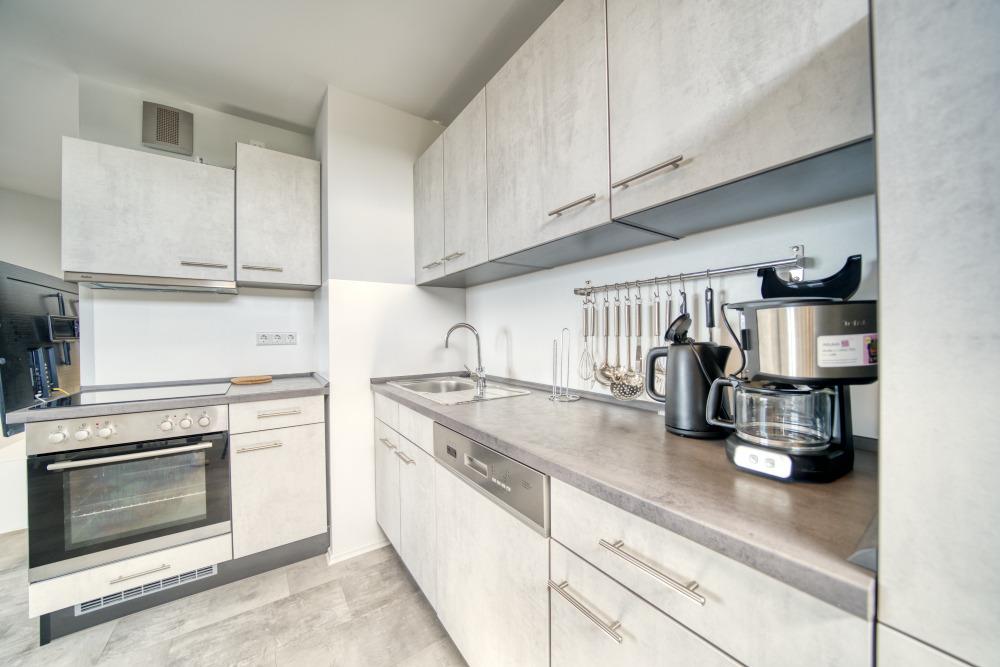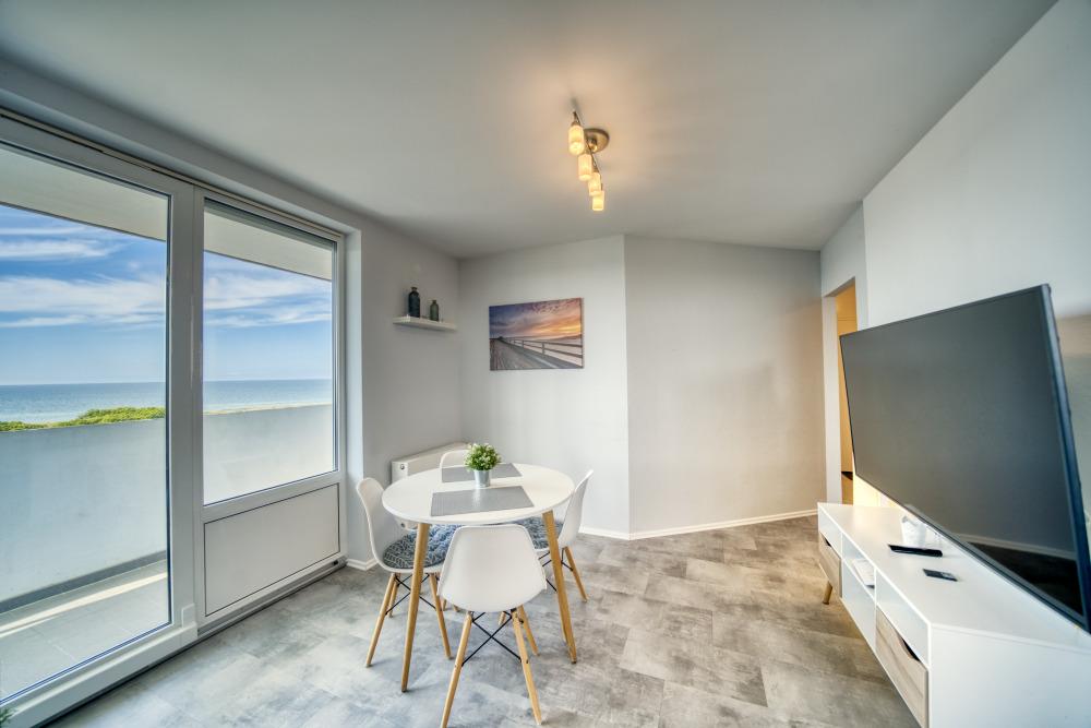 Der Wohn-Essbereich verfügt über 65-Zoll-Smart-TV und eine Tom Tailor Couch mit Schlaffunktion und Topper im Bettkasten. Das Schlafzimmer bietet Doppelbett, 32-Zoll-Smart-TV und elektrische Augenrolläden. Die Küche ist komplett ausgestattet mit Ceranherd, Backofen, Geschirrspüler, Kühlschrank mit Gefrierfach sowie Wein- und Sektgläsern. Das Bad verfügt über Badewanne, WC und hochwertige Ausstattung. WLAN inklusive. Nichtraucherwohnung, keine Haustiere. Fahrstuhl, Parkplatz, gemeinschaftliche Fahrradräume vorhanden. Der Strand ist ca. 300?m entfernt.