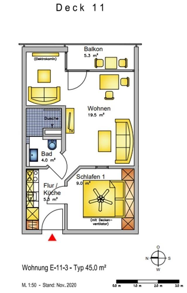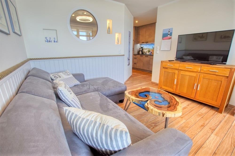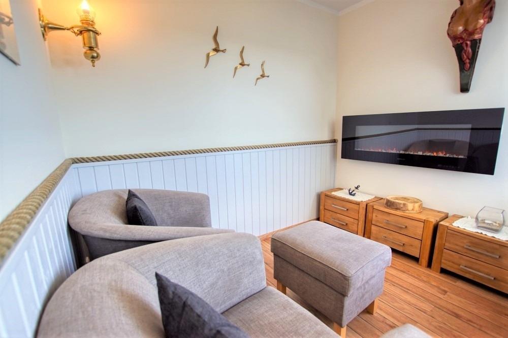 Wohnfläche 45?qm. Separater Elternschlafbereich mit Doppelbett. Offener Wohnbereich mit Flachbild-TV, Elektrokamin, gemütlicher Sitzecke und zwei Relax-Sesseln. Küche mit Ceranfeld, Backofen-Mikrowelle, Spülmaschine, Kühlschrank mit Gefrierfach und Kaffeemaschine. Modernes Bad mit Dusche. Bonus: WLAN. Nichtraucher, keine Haustiere, max. 2 Personen, Fahrstuhl, Fahrradräume, Strand ca. 300?m, kostenfreier Parkplatz. Ferienpark mit Schwimmbad, Sauna, Wellness, Läden und Kinderspielwelt.