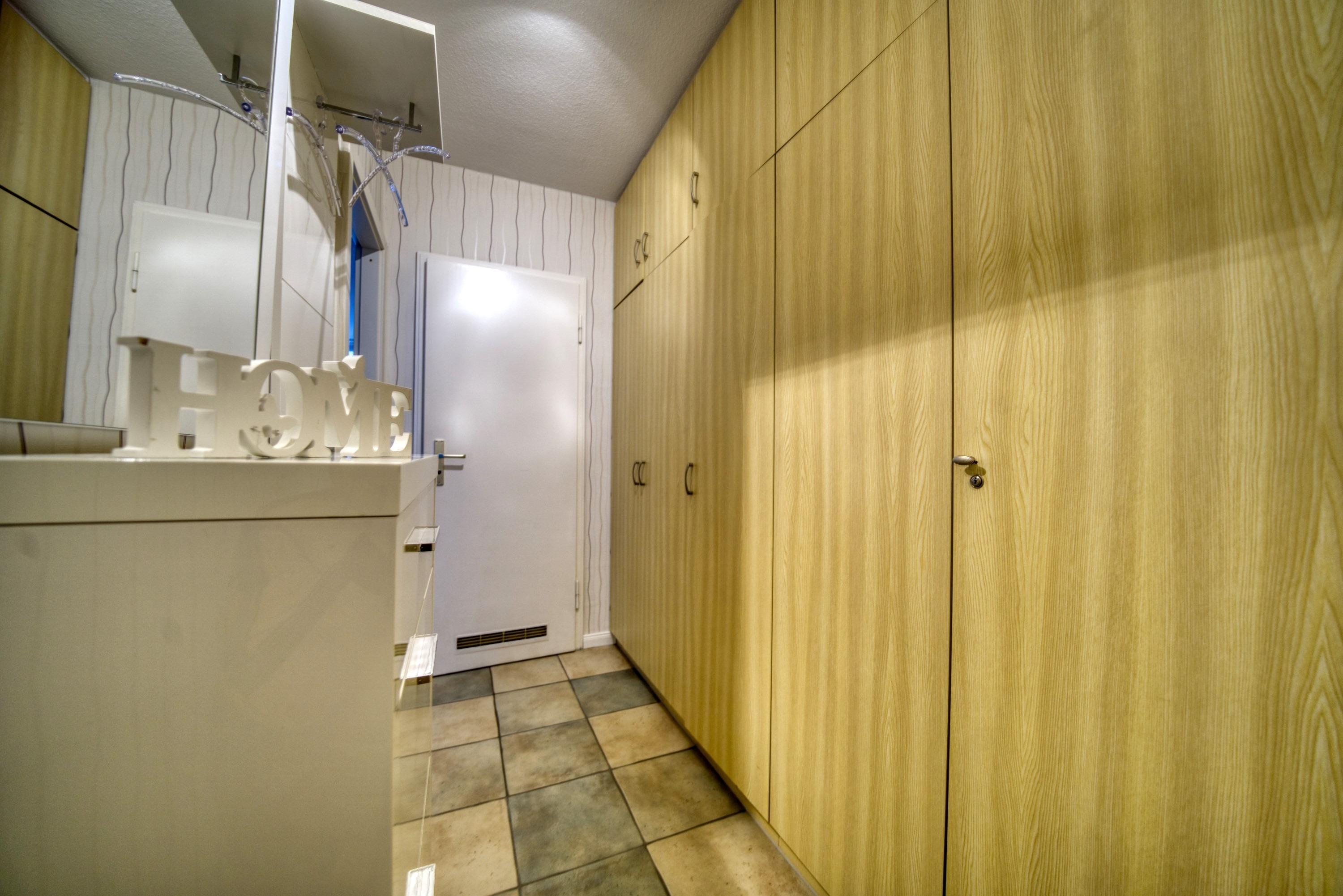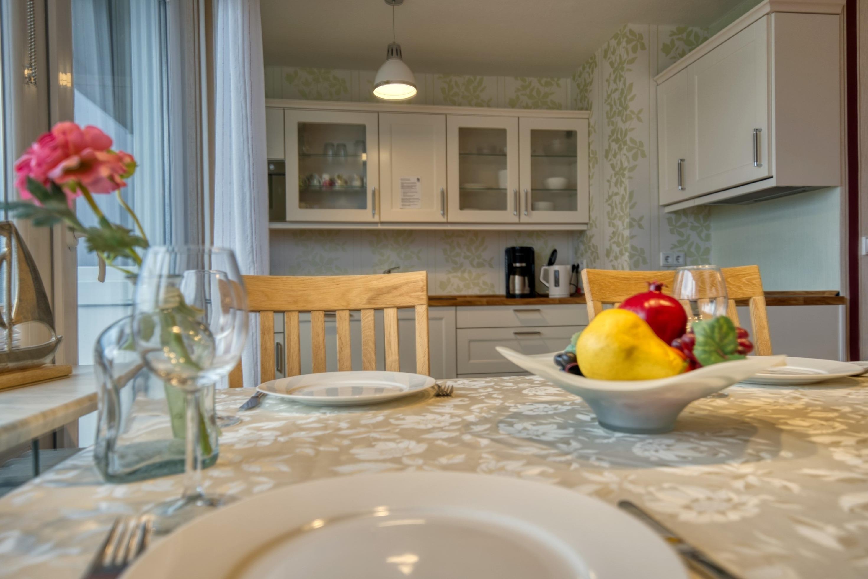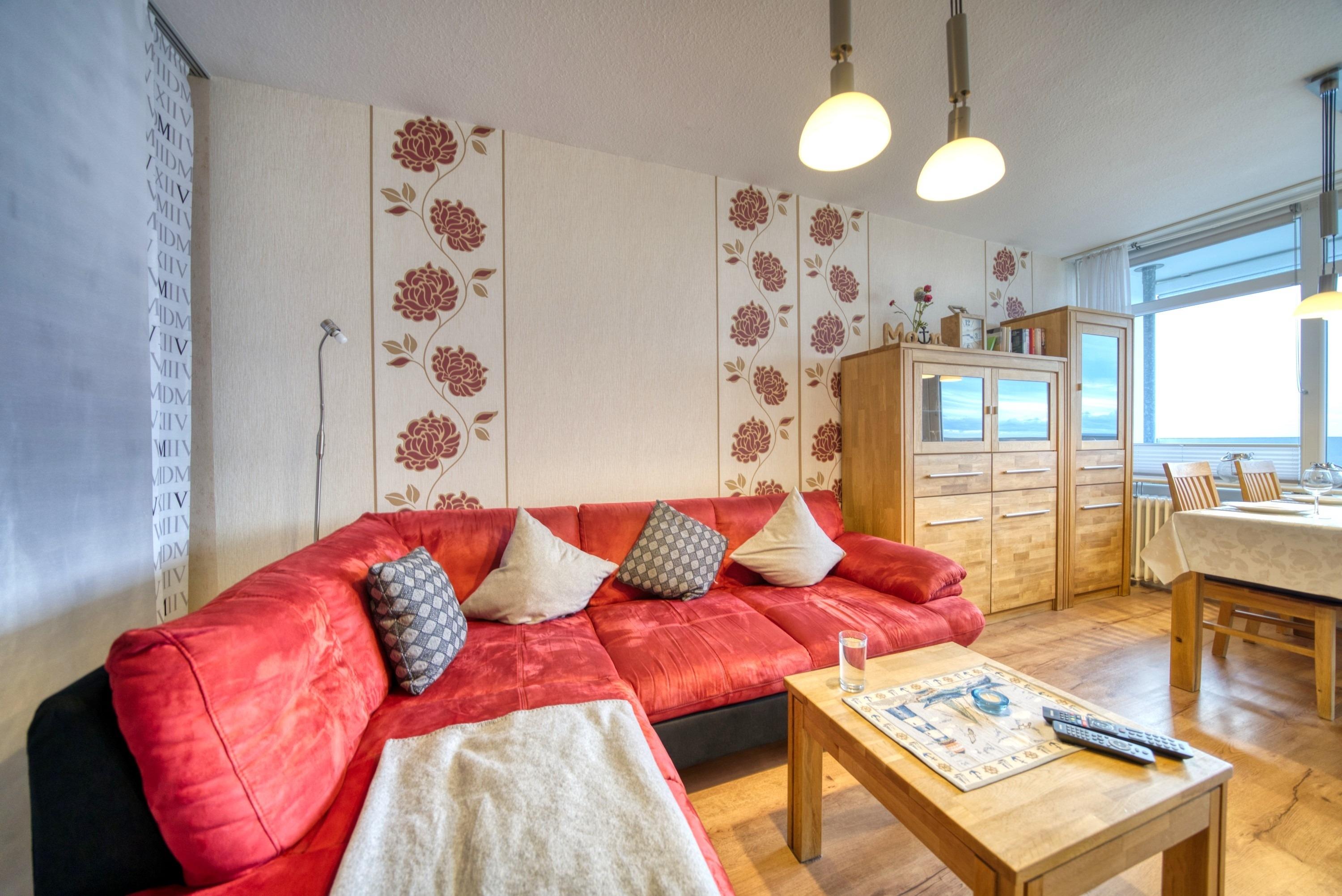 Wohnfläche 45?qm. Wohn-/Esszimmer mit Schlafcouch (2,45?m × 1,80?m), Elternschlafraum mit Doppelbett. Moderne Küche mit Kaffeemaschine, Wasserkocher, Toaster, Kühlschrank mit Gefrierfach, 4-Platten-Herd und Backofen. Bad mit WC und Duschkabine. Radio [&] TV im Wohnzimmer. Bonus: WLAN, kostenloser Strandkorb (Mitte Mai–Mitte September). Nichtraucher, keine Haustiere, max. 4 Personen, Fahrstuhl, Fahrradräume, Strand ca. 300?m, Parkplatz kostenlos. Ferienpark mit Schwimmbad, Sauna, Wellness, Läden und Kinderspielwelt.