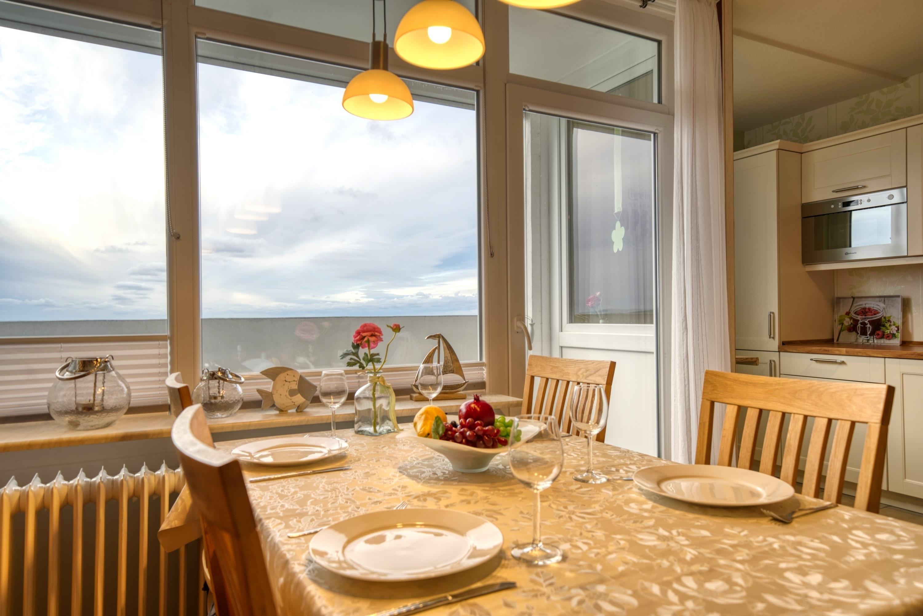Die Ferienwohnung im Haus E, 11. Etage, mit Balkon zur Westseite, bietet einen herrlichen Ostseeblick und Sonne vom Nachmittag bis in die Abendstunden. Genießen Sie das farbenfrohe Lichterspiel des Sonnenuntergangs an der Ostsee.