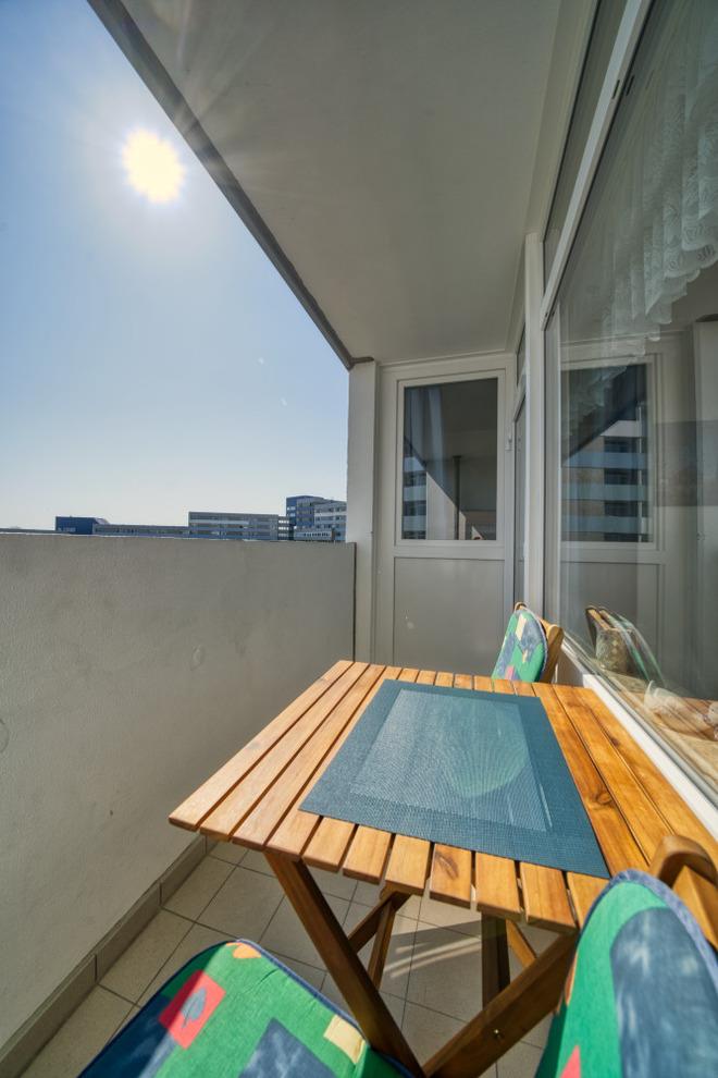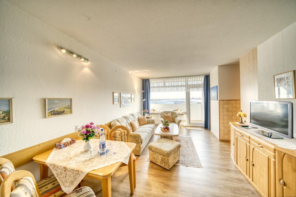 Die Ferienwohnung im Haus F, 6. Etage, mit Balkon zur Ostseite, bietet einen herrlichen Blick auf die Ostsee mit Fehmarnsundbrücke sowie auf den Binnensee mit Stadt- und Yachthafen.
