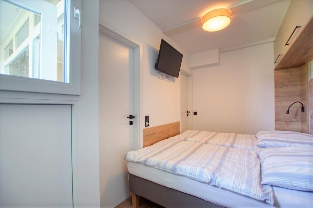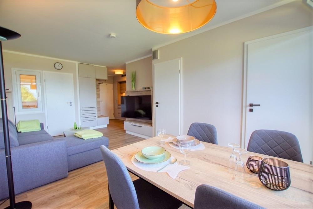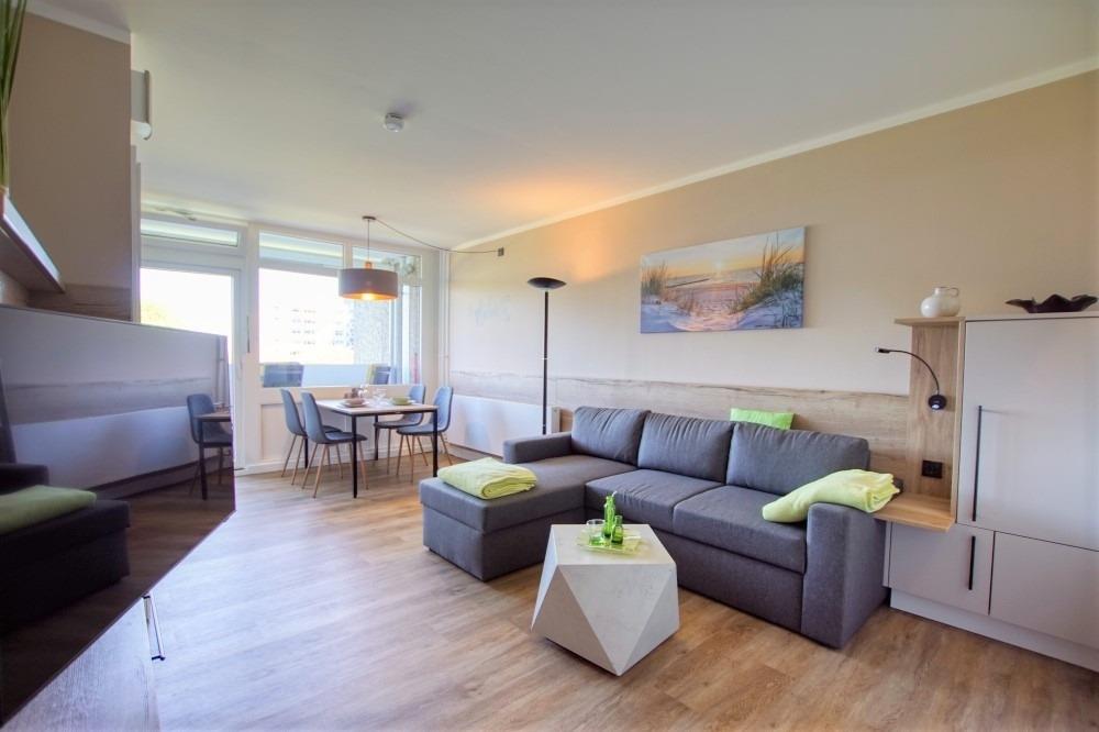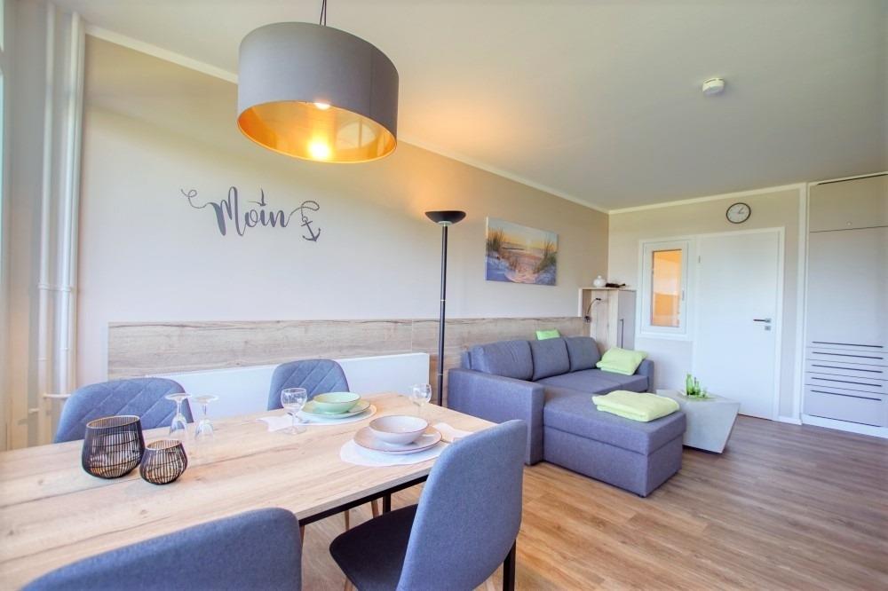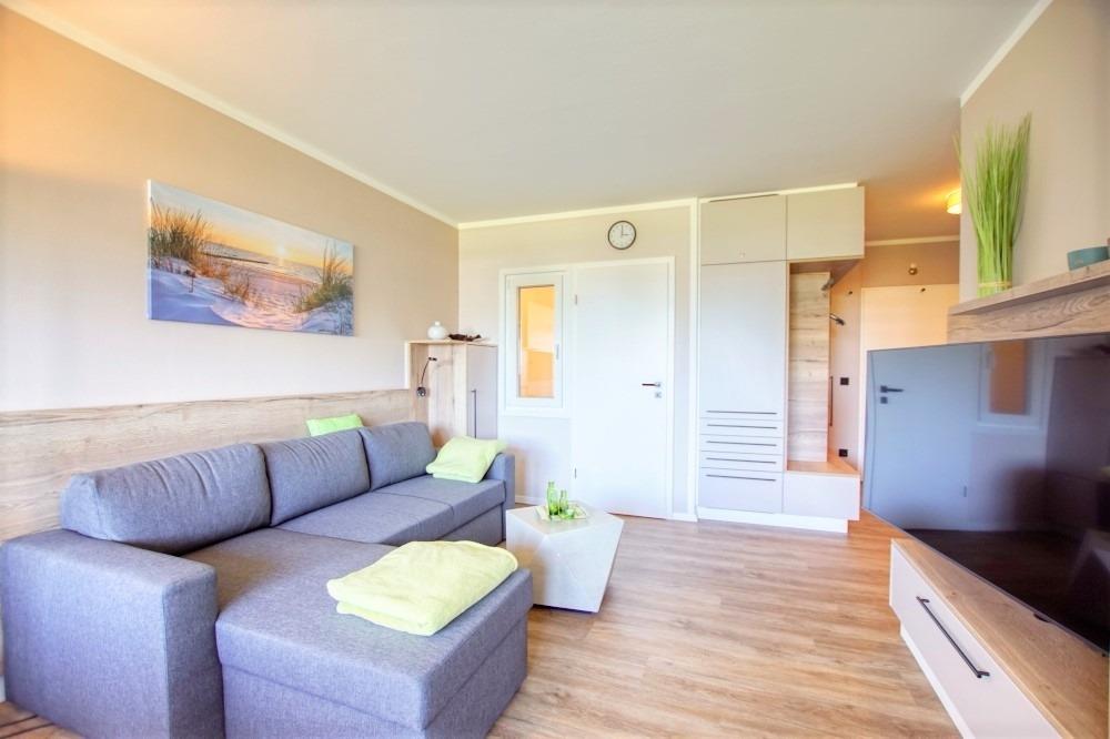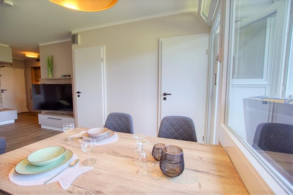 Die Wohnung verfügt über ein Wohn-/Esszimmer mit Sofaecke, großem Flachbild-TV und Essplatz am Fenster, Balkonzugang, separates Schlafzimmer mit Doppelbett und TV, Kinderzimmer mit Etagenbett und Arbeitsplatz, moderne Einbauküche (Ceranfeld, Backofen, Geschirrspüler, Kühlschrank mit Gefrierfach, Mikrowelle, Kaffeemaschinen, Toaster) sowie Bad mit Duschkabine, WC und Waschbecken. WLAN, Fahrstuhl, abschließbare Fahrradräume und kostenfreier Parkplatz inklusive. Strand ca. 300?m, Aktiv-Hus mit Schwimmbad, Sauna, Wellness und Kinderspielwelt direkt im Ferienpark. Nichtraucher, keine Haustiere.