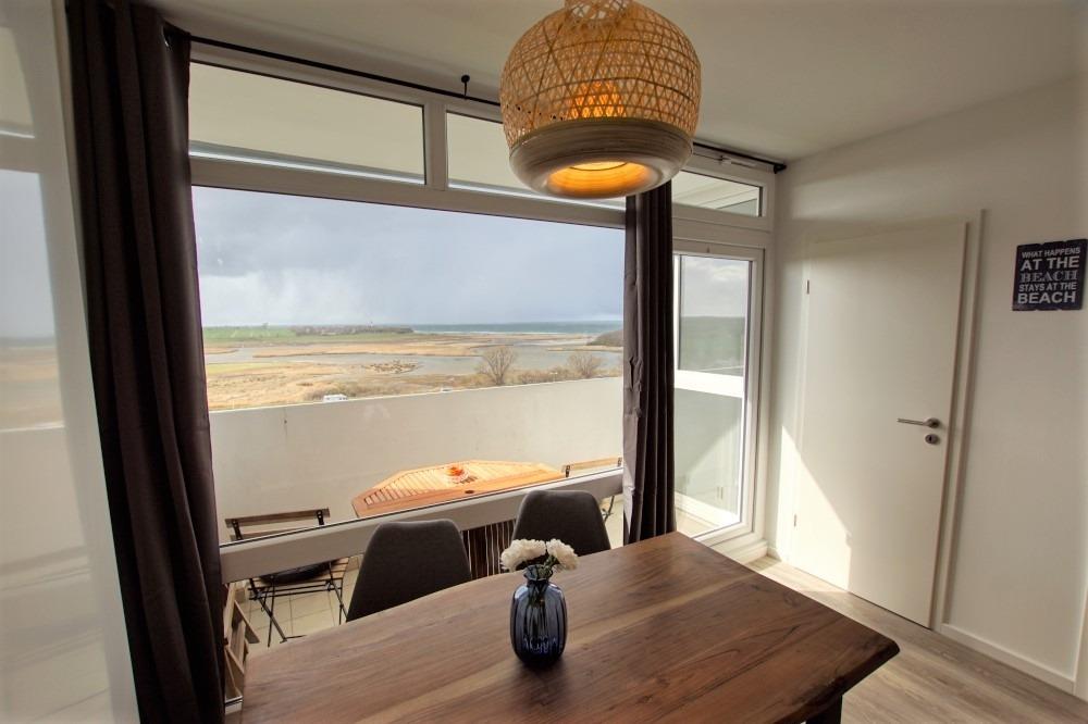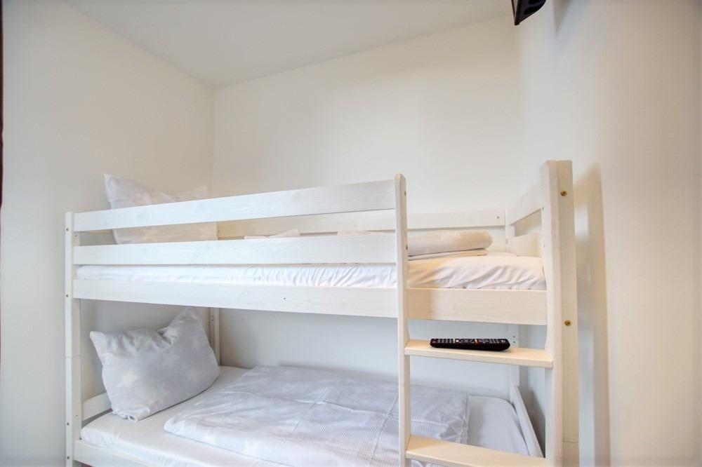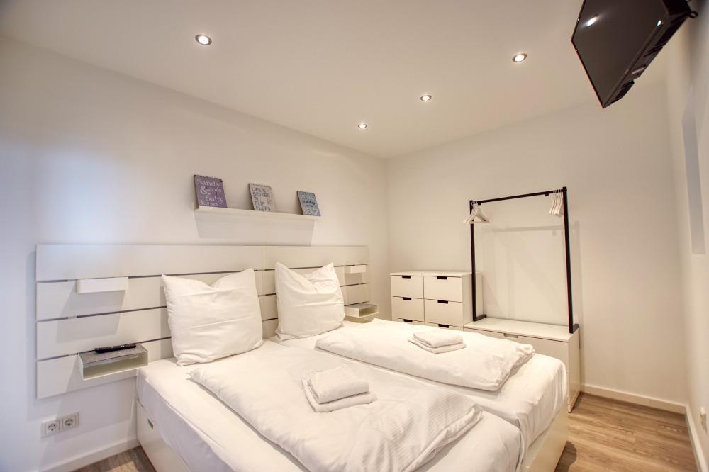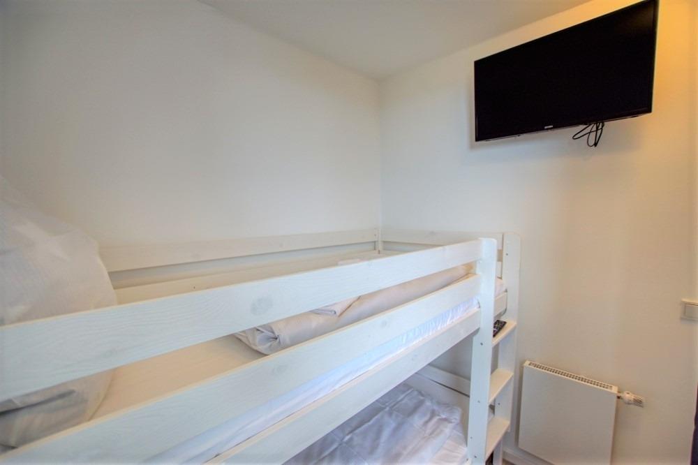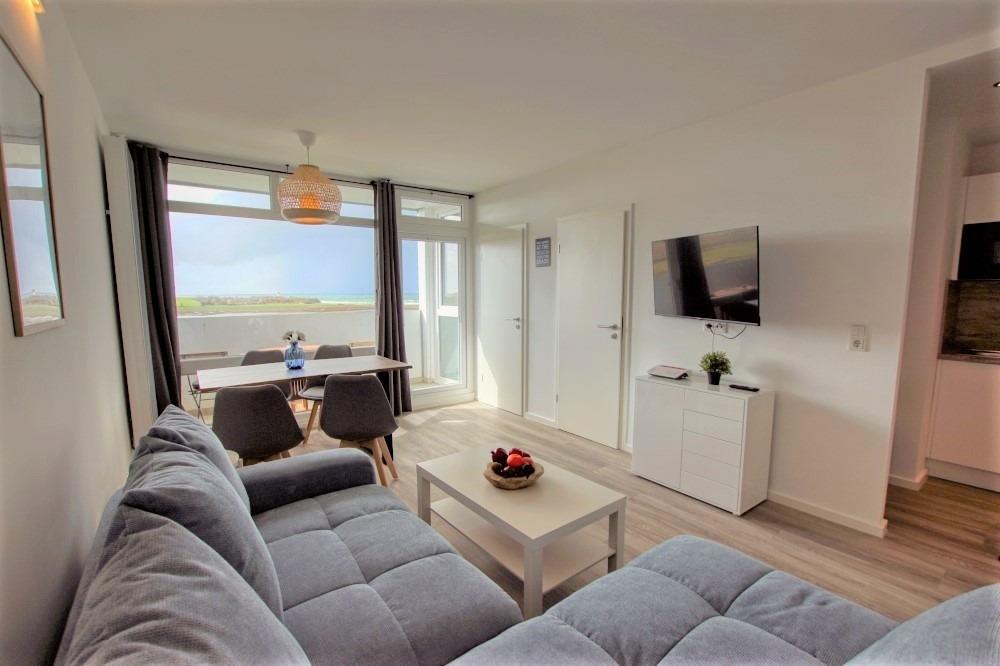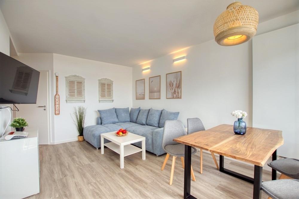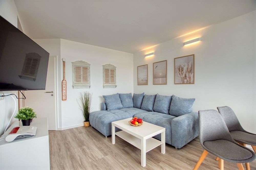 Wohnfläche 45?m² für bis zu 5 Personen: Elternschlafzimmer mit Doppelbett/TV, Kinderzimmer mit Etagenbett/TV, Schlafcouch im Wohnbereich. Offener Wohn-/Essbereich mit Sofa, Esstisch (4 Plätze), Flachbild-TV, maritimer Boden. Küche mit Ceranfeld, Backofen, Geschirrspüler, Mikrowelle, Kühlschrank/Gefrierfach, Kaffeemaschine, Wasserkocher. Bad mit Dusche/WC, Handtuchtrockner. Balkon Westseite, WLAN inklusive. Nichtraucher, keine Haustiere, nicht allergikerfreundlich. Strand ca. 300?m, Aktiv-Hus und Läden in Nähe, Fahrstuhl, Fahrradräume, kostenfreier Parkplatz.
