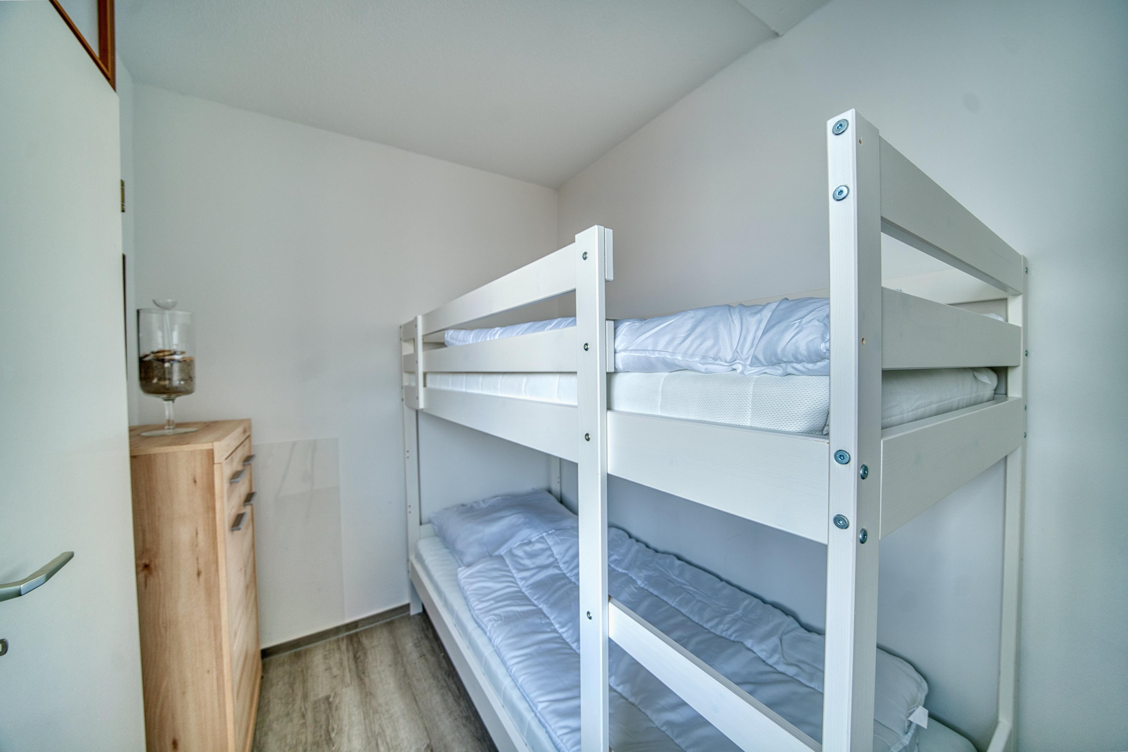 Die Wohnung bietet Wohnzimmer mit Couch, TV und Westbalkon, Schlafbereich mit Doppelbett, Kinderzimmer mit Etagenbett für 2 Personen, Essbereich für 4 Personen, Vinylboden. Küche mit Ceranfeld, Kühlschrank mit Gefrierfach, Kaffeemaschine, Wasserkocher und Geschirr. Duschbad mit Handtuchtrockner. WLAN inklusive. Nichtraucher, keine Haustiere, Fahrstuhl, Fahrradräume, ca. 300?m zum Strand, Parkplatz hinter dem Ferienpark.