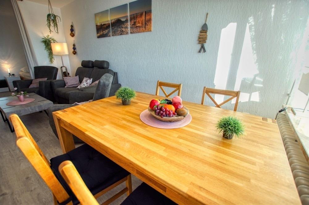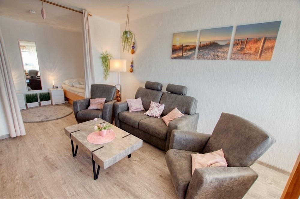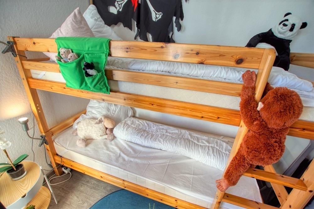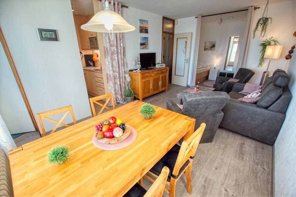 Die 45?m² große Wohnung verfügt über Wohn-Esszimmer mit Sitzecke, Elternschlafbereich mit Einzelbetten, separates Kinderzimmer mit Etagenbett, voll ausgestattete Küche (Mikrowelle, Kühlschrank, 4-Plattenherd), Bad mit Dusche/WC sowie TV und Radio. Nichtraucher, keine Haustiere, kein WLAN, Fahrstuhl, Fahrradräume, ca. 300?m zum Strand, kostenfreier Parkplatz hinter dem Ferienpark. Ideal für entspannte Tage und Freizeitangebote im Ferienpark.