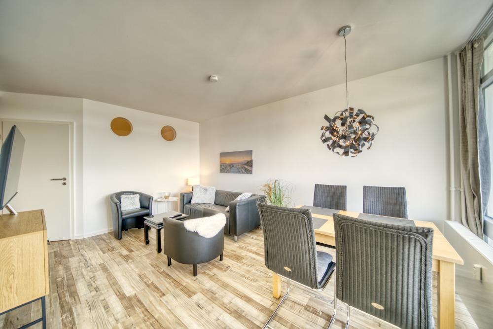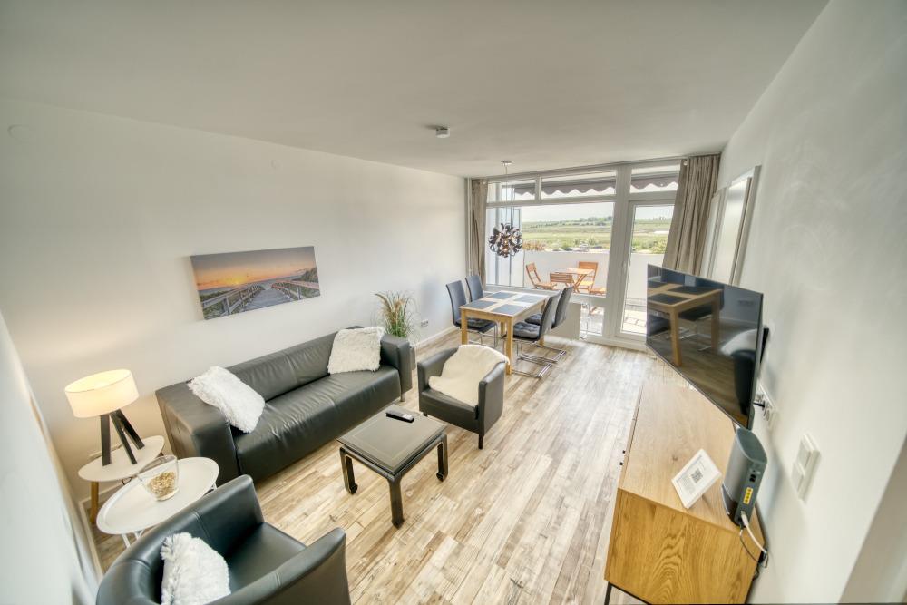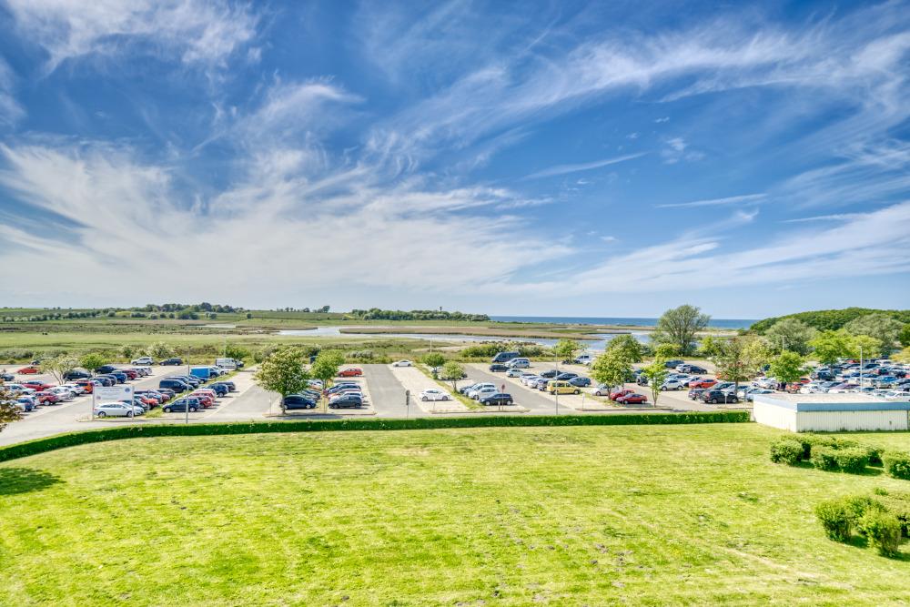 Verbringen Sie einen entspannten Urlaub in dieser modernen Ferienwohnung in der 3. Etage im Haus H des Ferienparks Heiligenhafen. Die 51 m² große Wohnung bietet Platz für bis zu 4 Personen und verfügt über einen großen Westbalkon mit Abendsonne. Zur Ausstattung gehören ein separates Schlafzimmer mit Doppelbett, ein Kinderzimmer mit ausziehbarem Einzelbett und TV, ein gemütliches Wohnzimmer mit Smart-TV sowie eine voll ausgestattete Küche mit Ceranherd, Backofen, Mikrowelle und Geschirrspüler. Das moderne Bad bietet eine niedrige Dusche und Handtuchtrockner. WLAN ist kostenfrei nutzbar. Nichtraucherwohnung, keine Haustiere. Fahrstuhl, Fahrradräume, Parkplatz vorhanden. Strand ca. 300 m entfernt, zahlreiche Freizeitangebote im Ferienpark in direkter Nähe.