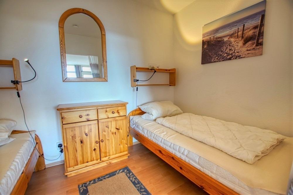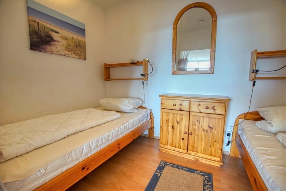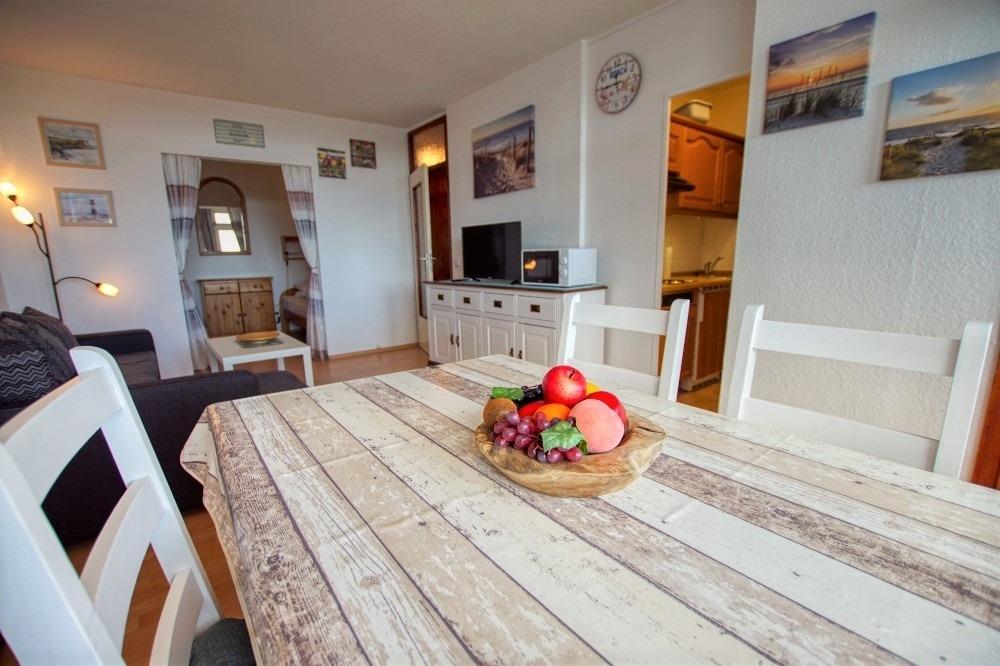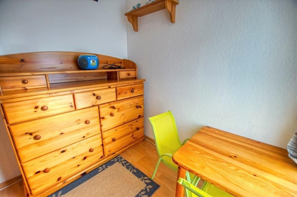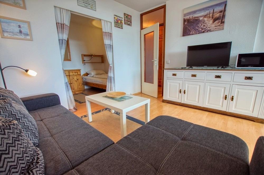 Die Wohnung verfügt über einen Wohn-Schlafbereich mit zwei Einzelbetten, separates Kinderzimmer mit Etagenbett, Laminatboden, Flachbild-TV, Sofa und Esstisch. Die Küchenzeile ist mit Kühlschrank, Gefrierfach, 4-Plattenherd, Mikrowelle, Kaffeemaschine, Wasserkocher und Toaster ausgestattet. Badezimmer mit WC und Duschkabine. Nichtraucherwohnung, keine Haustiere, Fahrstuhl, abschließbare Fahrradräume, ca. 300 m zum Strand, kostenfreier Parkplatz. Perfekte Lage nahe Strand, Aktiv-Hus, Geschäften und Gastronomie.