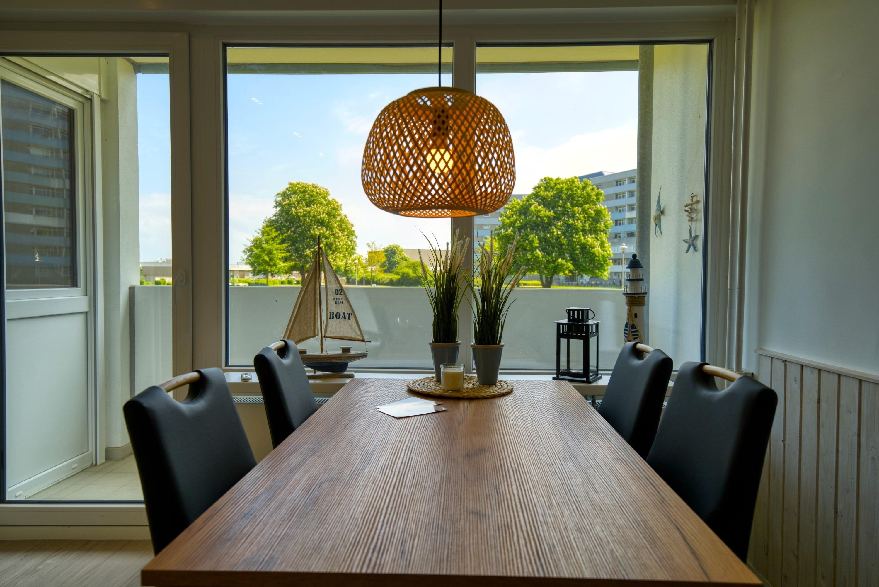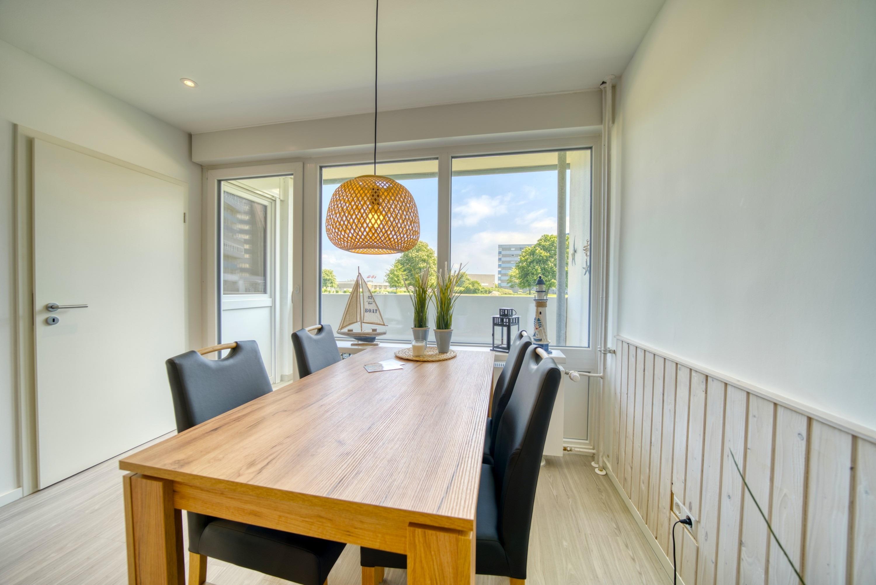 Diese wunderschöne Wohnung liegt im Haus H Ferienpark, im Erdgeschoss (Wohnung Nr. 10), mit Balkon zur Ostseite, der einen schönen Blick ins Grüne bietet. Wohnfläche 45?m², offener Wohnbereich mit Schlafcouch und Flachbild-TV, separater Elternschlafbereich mit Doppelbett und TV, Kinderzimmer mit Etagenbett. Küche hochwertig ausgestattet mit Ceranfeld, Backofen, Kühlschrank mit Gefrierfach, Spülmaschine und Kaffeemaschine. Modernes Bad mit großzügiger Dusche. Bonus: WLAN. Nichtraucherwohnung, keine Haustiere, Fahrradräume, ca. 300?m zum Strand, Parkplatz inklusive. Aktiv-Hus, Shops und Restaurants in unmittelbarer Nähe.