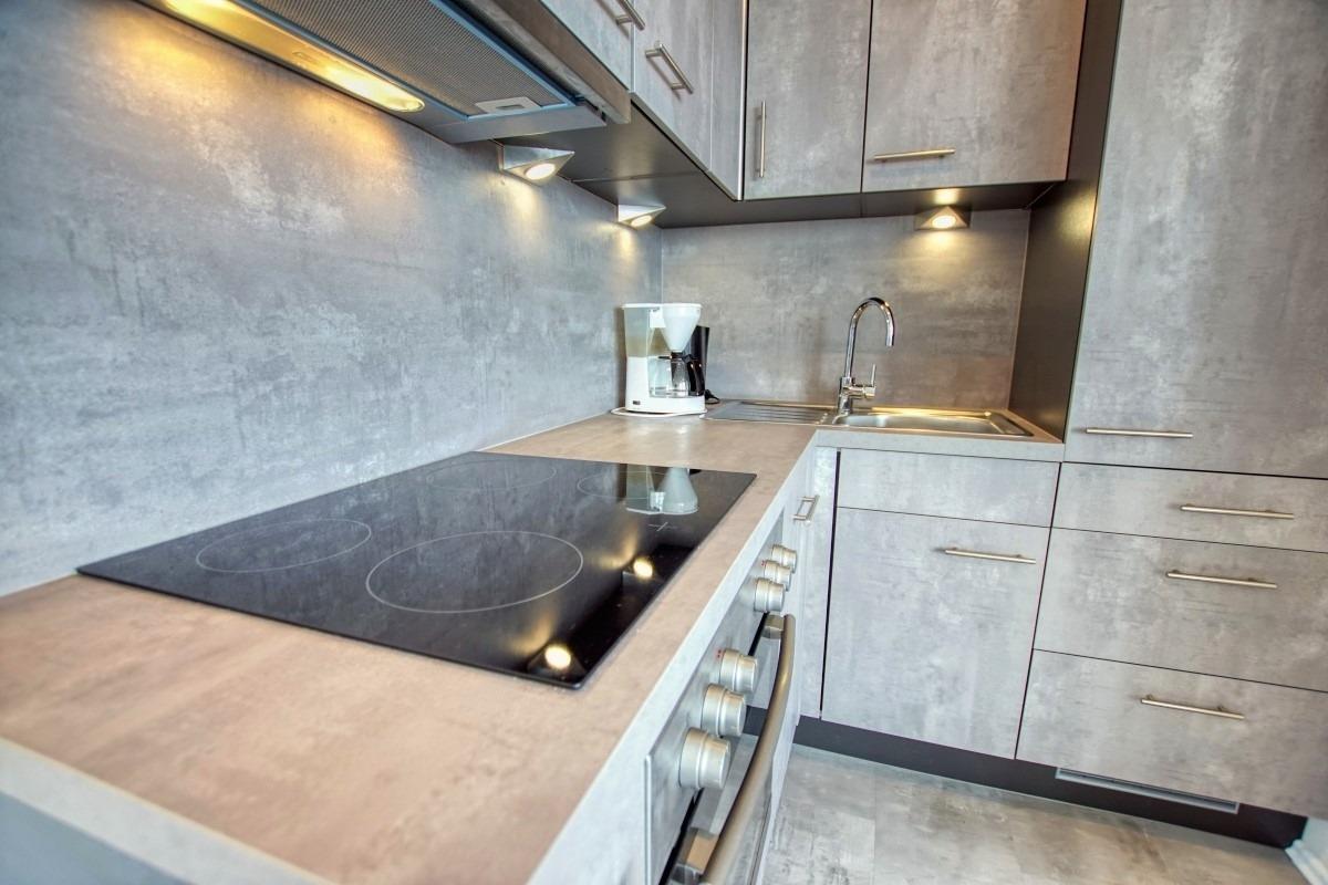 Küche mit Ceranherd, Backofen, Kühlschrank mit Gefrierfach, Wasserkocher, Geschirrspüler, Toaster und Filterkaffeemaschine