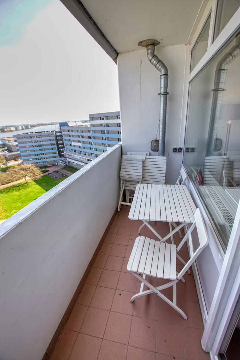 Die Wohnung liegt im Haus K Ferienpark, in der 9. Etage, mit Balkon zum Innenhof, der einen schönen Blick auf die Grünanlagen, den Binnensee und die Ostsee Richtung Fehmarn bietet.