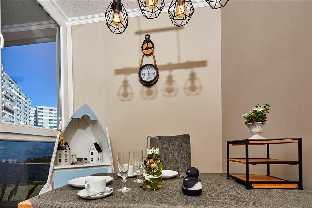 Die Wohnung verfügt über Wohn-Schlafbereich mit Doppelbett, zwei Sessel mit Schlaffunktion für die 3. Person, Flachbild-TV und Laminatboden. Die Küchenzeile ist ausgestattet mit Induktionsherd, Mini-Backofen, Mikrowelle, Kühlschrank mit Gefrierfach, Kaffeemaschine und Wasserkocher. Modernes Duschbad mit WC und Handtuchtrockner. Kostenfreies WLAN, Nichtraucher, keine Haustiere, Fahrstuhl, Fahrradräume, kostenfreier Parkplatz vorhanden. Strand ca. 300?m entfernt. Aktiv-Hus, Restaurants und Einkaufsmöglichkeiten in direkter Nähe.