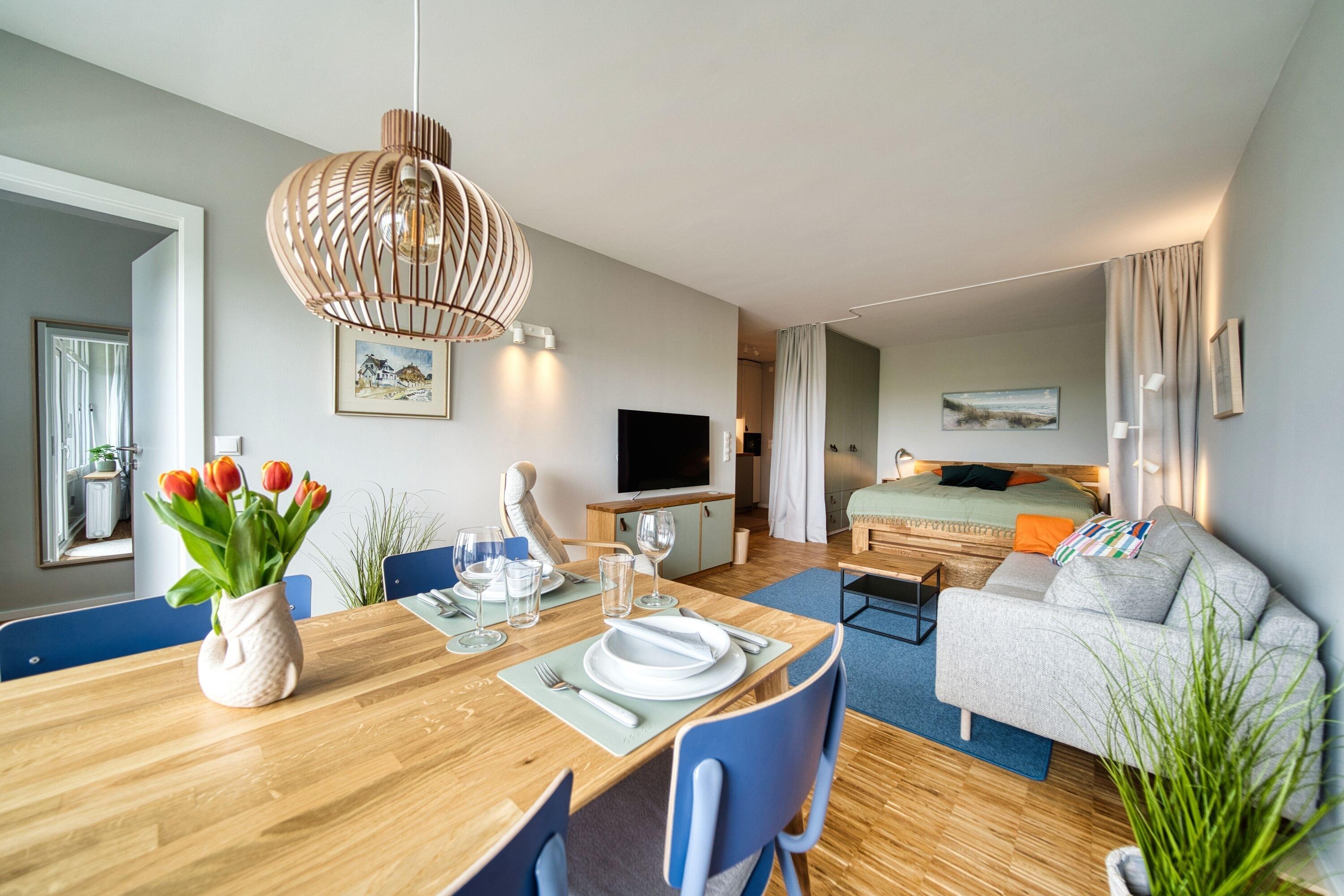 Wohnfläche ca. 45 m². Elternschlafbereich mit Doppelbett, Smart-TV und Einbauschrank. Kinderzimmer mit Doppelbett, Smart-TV und Schrank. Offener Wohnbereich mit Couch, Smart-TV, Radio/Bluetooth. Küche mit Spülmaschine, Backofen/Mikrowelle, Induktionsherd, Toaster, Kühlschrank/Gefrierfach, Kaffeemaschine. Modernes Bad mit Dusche. WLAN, Kinderspielweltkarte inklusive. Nichtraucher, max. 4 Personen, Fahrstuhl, kostenfreier PKW-Stellplatz. Strand ca. 300?m, Promenade fußläufig. Ferienpark mit Shops, Aktiv-Hus, Schwimmbad, Sauna, Wellness, Kinderspielwelt.