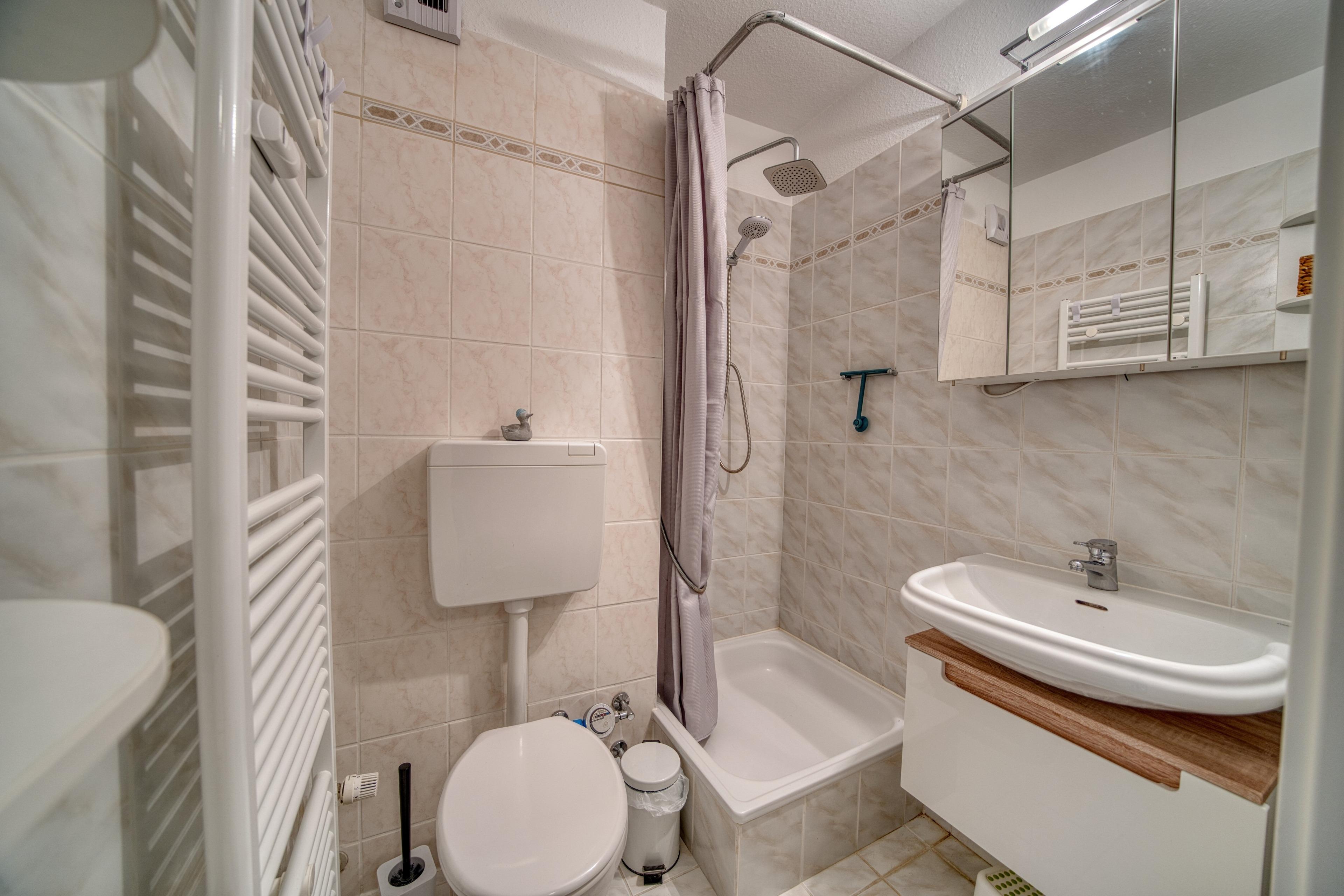 Badezimmer mit Dusche, WC und Handtuchtrockner