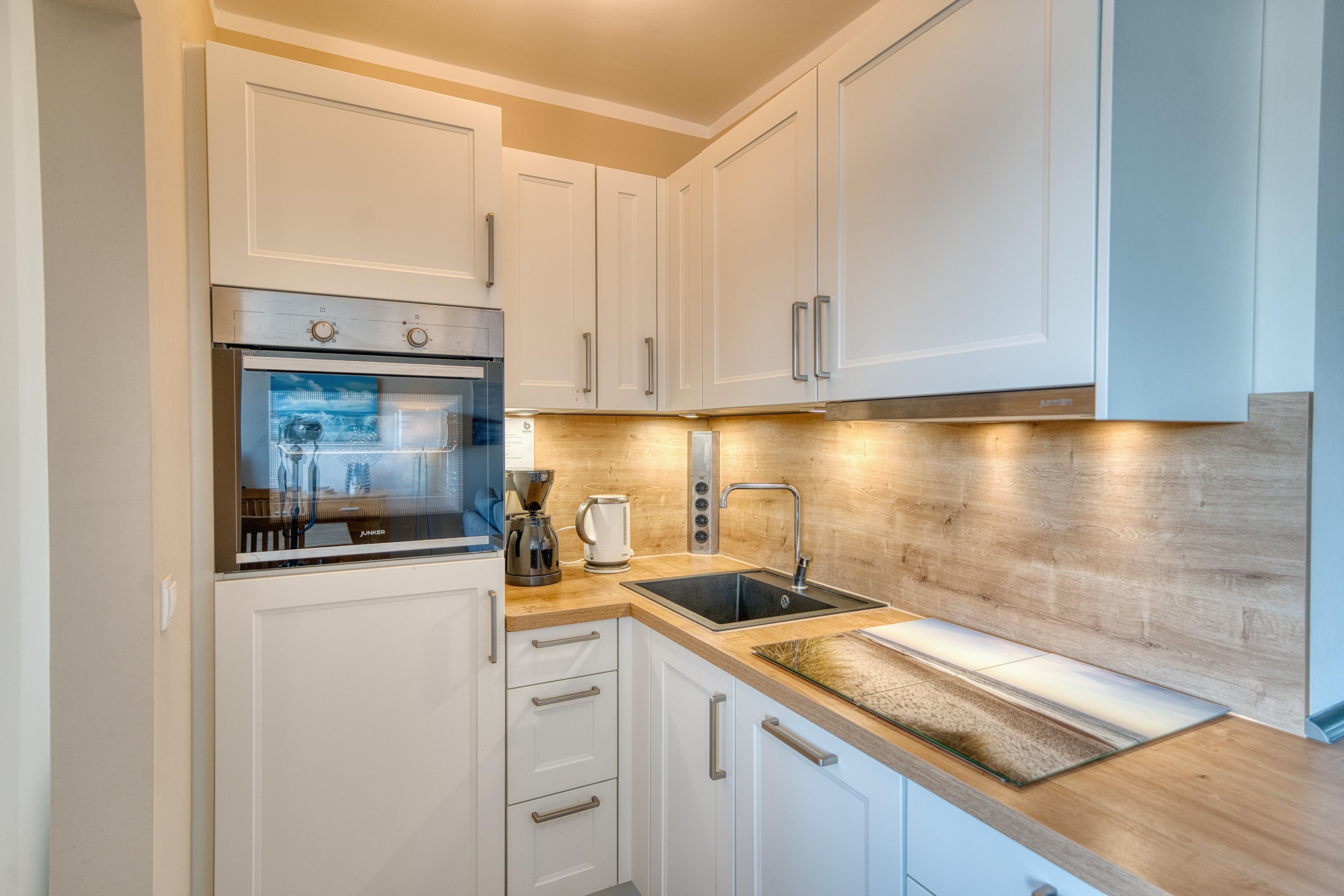 Küche mit Ceranherd, Backofen, Kühlschrank mit Gefrierfach und Geschirrspüler