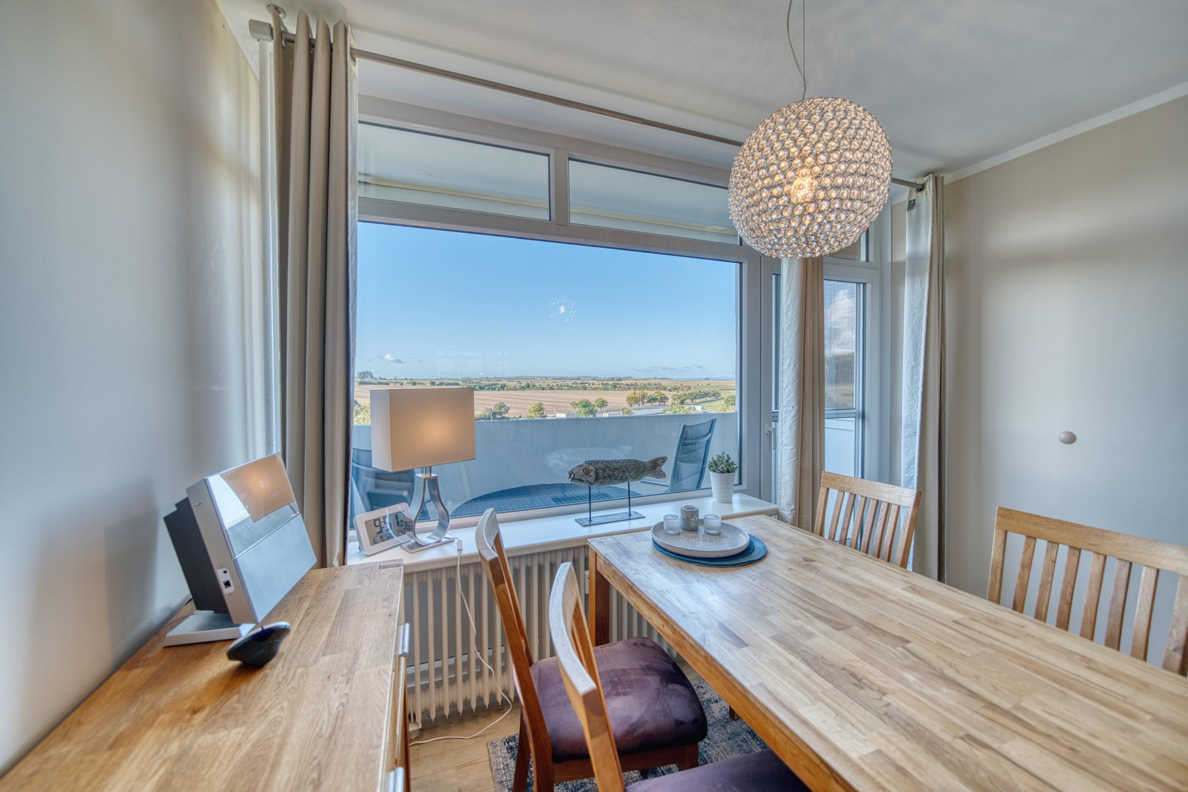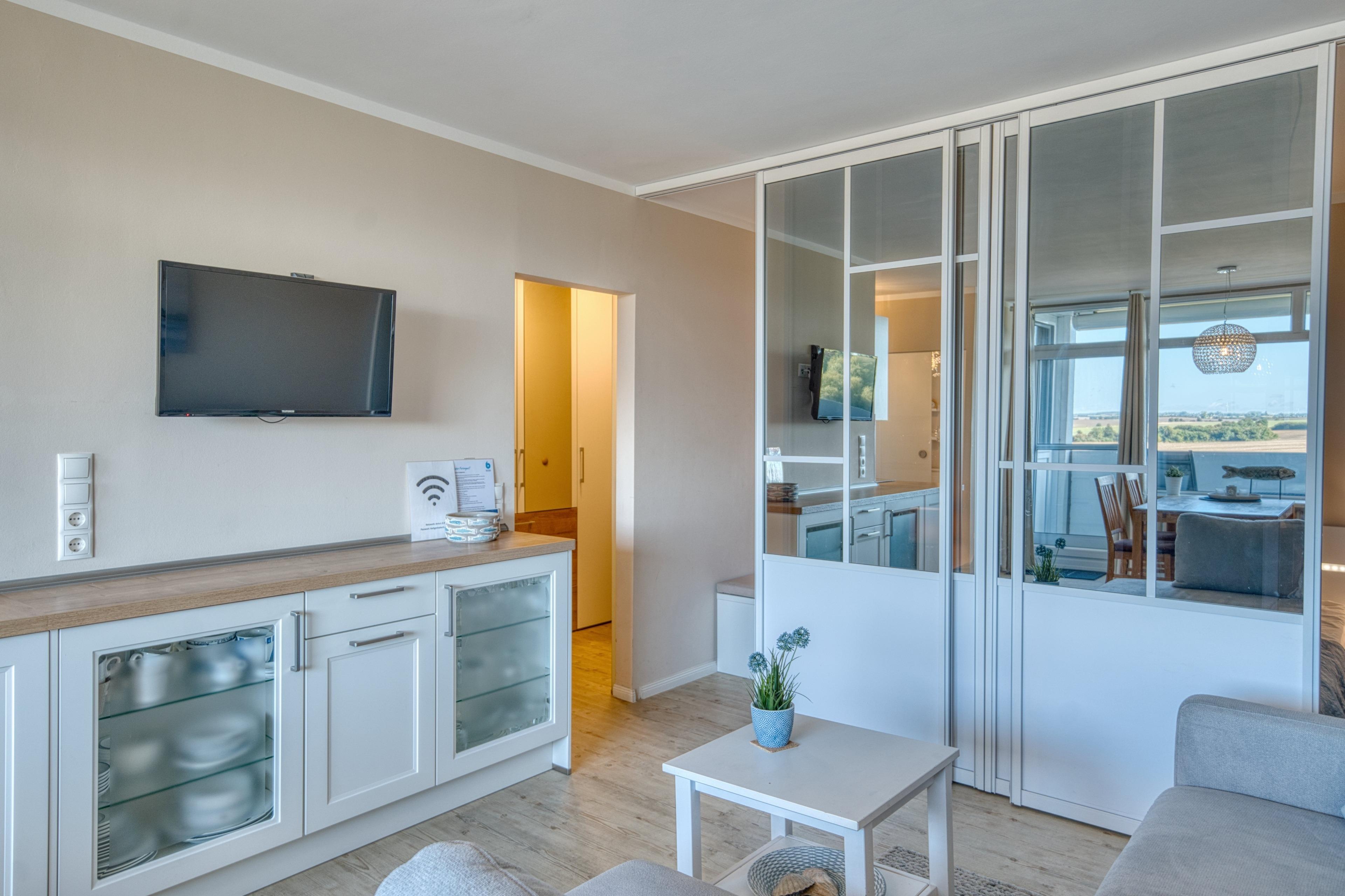 Wohn-Esszimmer mit Eckcouch, Esstisch vor dem Balkon, Flachbild-TV, Radio und Vinylboden