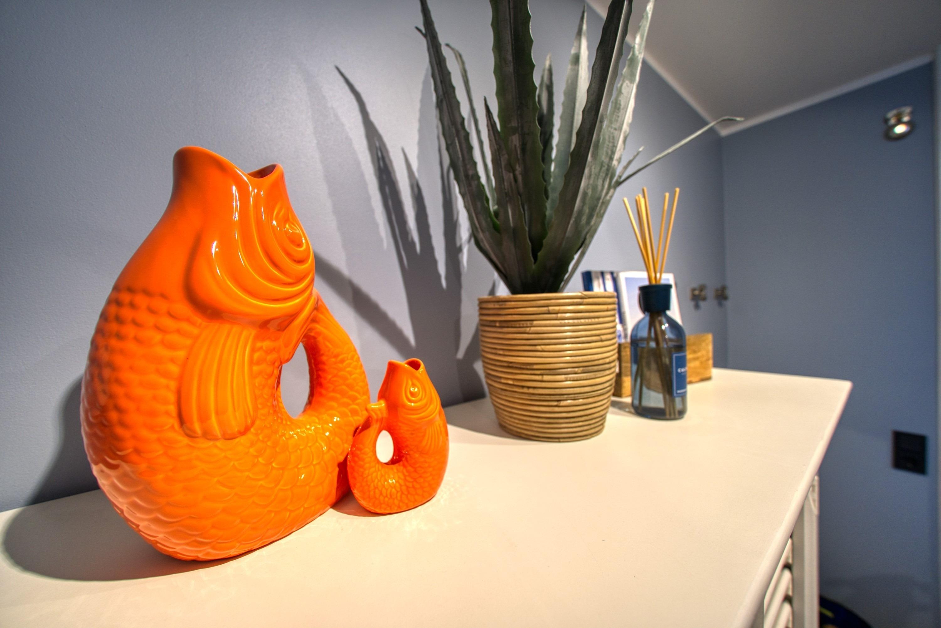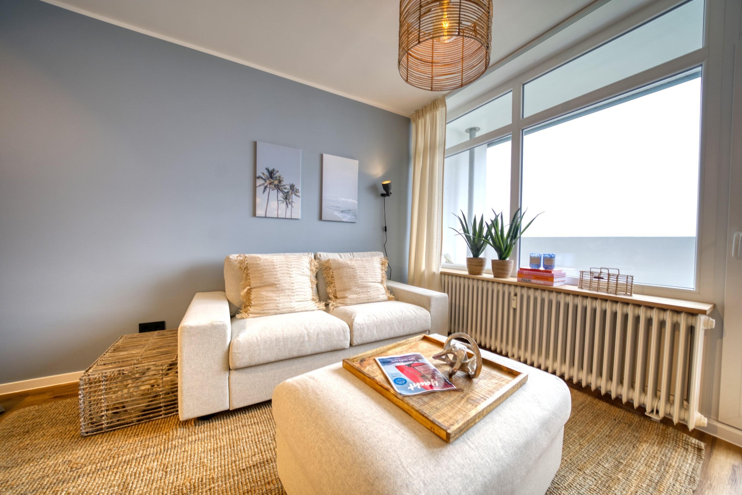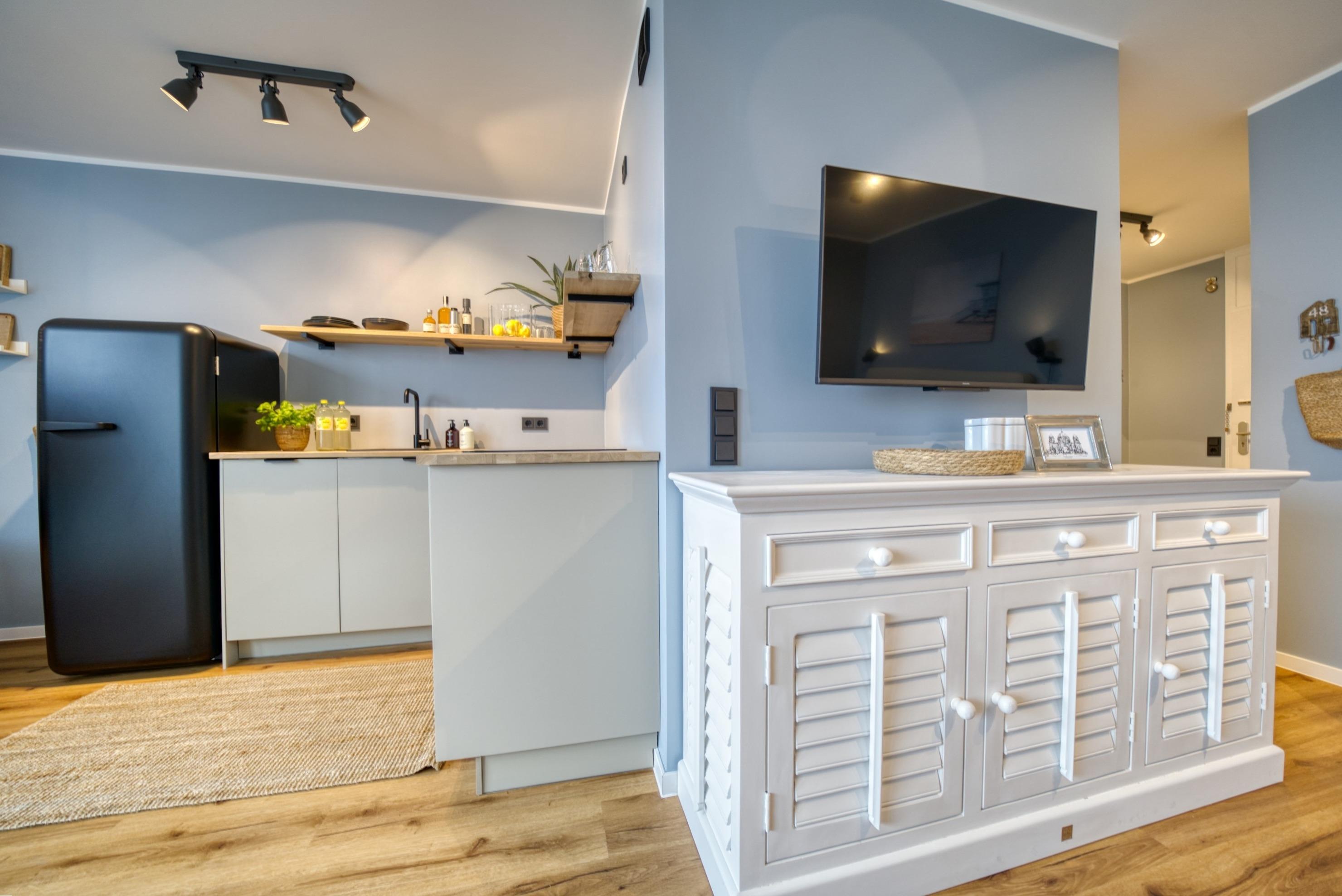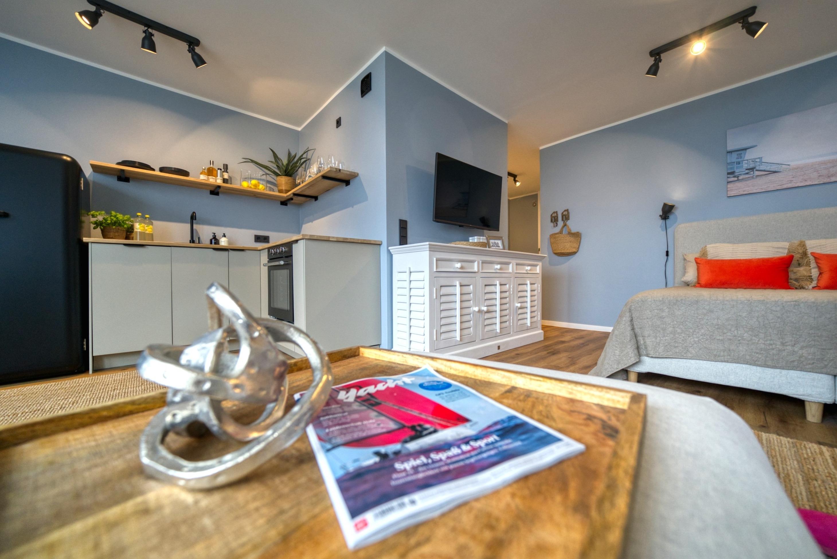 Hochwertig sanierte Ferienwohnung mit erneuerter Elektrik und Designvinyl-Boden. Wohnbereich mit Philips Ambilight TV und dekorativen Accessoires. Voll ausgestattete Küche mit Backofen, Geschirrspüler und Kochutensilien. Wellness-Badezimmer mit Regendusche, Duschkabine und Handtuchheizkörper. Privater Balkon mit Blick auf Binnensee und Innenhof. Aufzug im Haus, PKW-Stellplatz, stilvolle Einrichtung für Komfort und entspannten Urlaub.