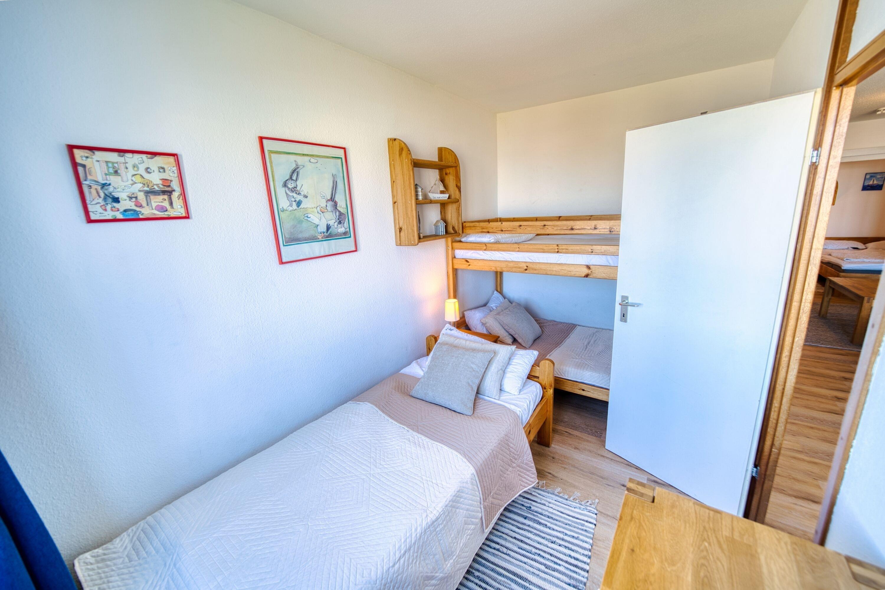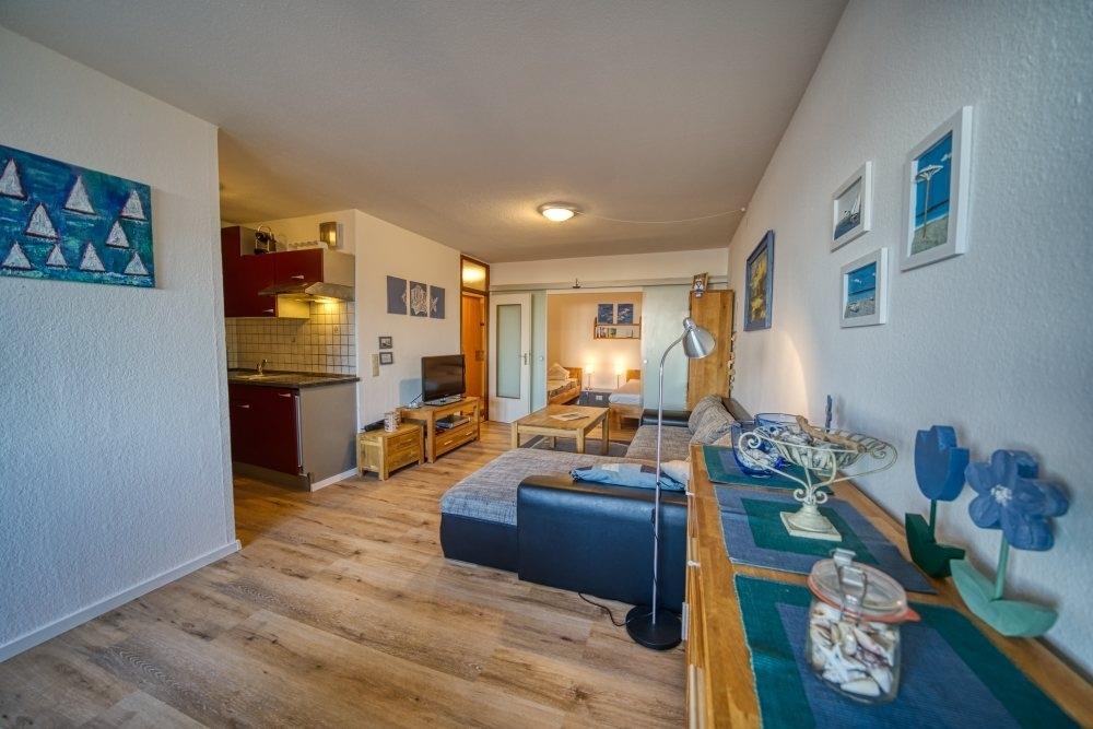 Wohn- und Essbereich mit Flachbild-TV. Elternschlafbereich mit Einzel- und französischem Bett, Kinderzimmer mit Etagenbett und zusätzlichem Einzelbett. Voll ausgestattete Küche mit Ceranfeld, Mikrowelle, Kühlschrank/Gefrierfach, Kaffeemaschine, Nespresso, Toaster, Mixer und Sandwichmaker. Bad mit Dusche, WC und Handtuchtrockner. Kostenloses WLAN. Nichtraucher, haustierfrei, Fahrstuhl, kostenloser Parkplatz, abschließbare Fahrradräume. Strand ca. 300?m, Aktiv-Hus, Restaurants, Bäckereien und Shops ca. 30?m. Kein Balkon, aber schöner Innenhof- und Ostseeblick.