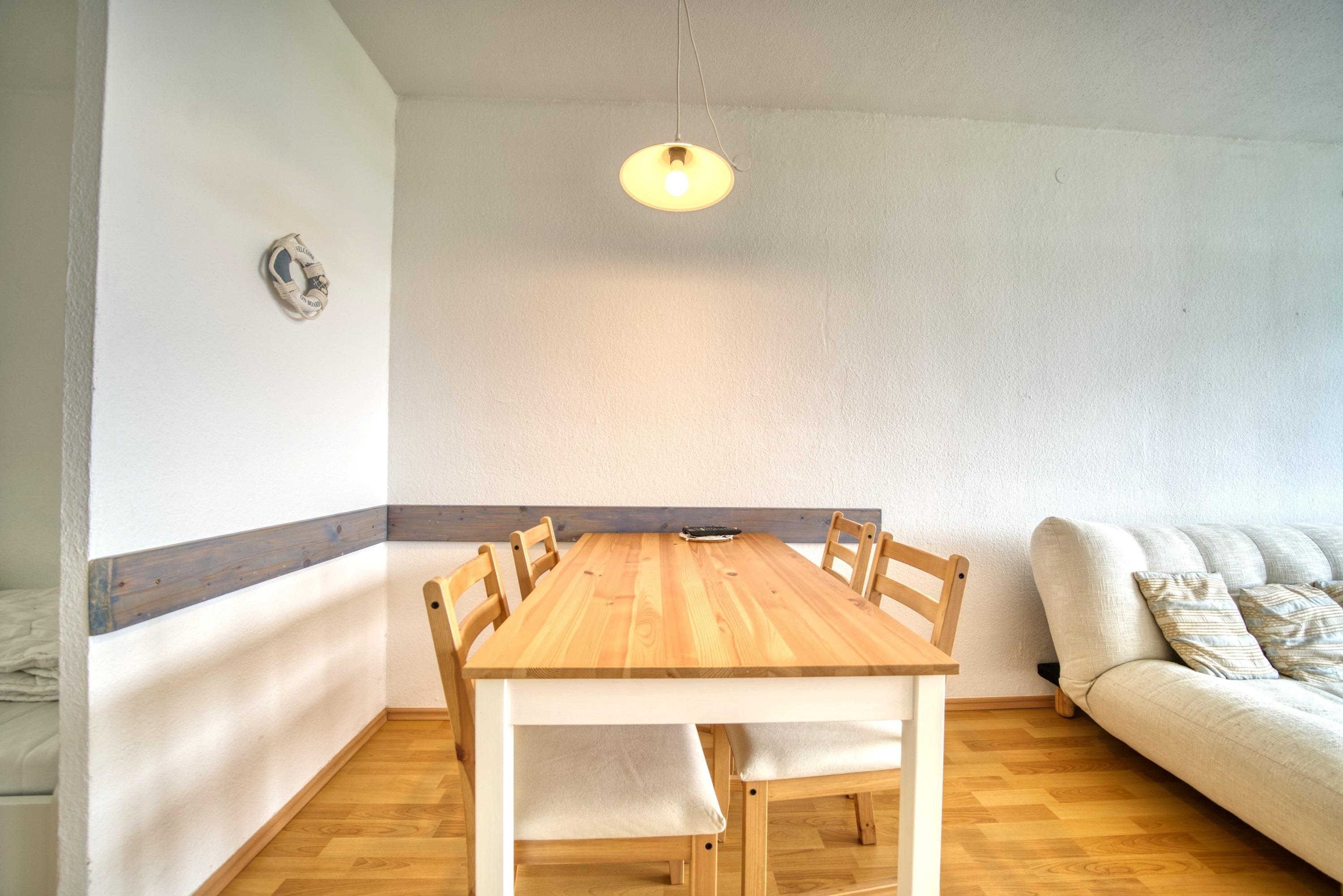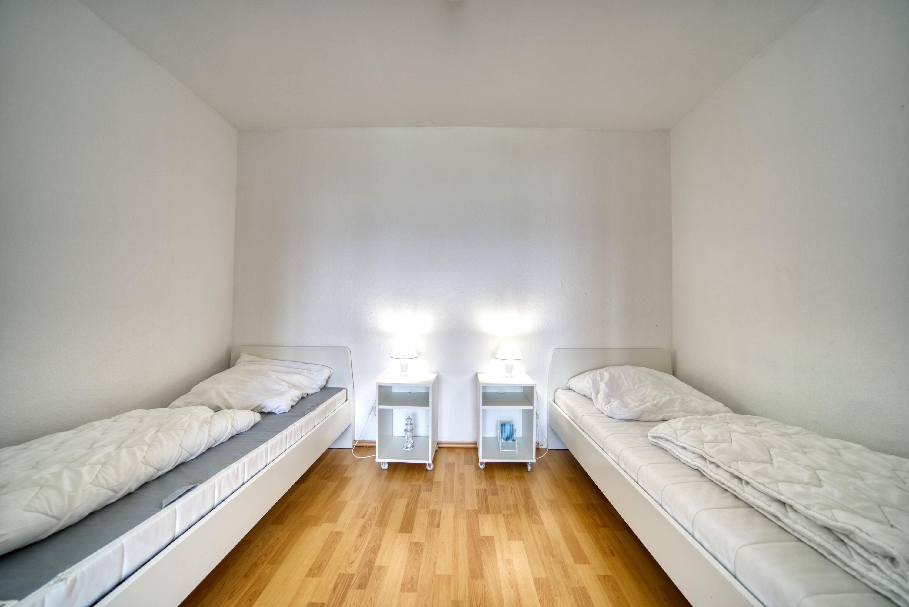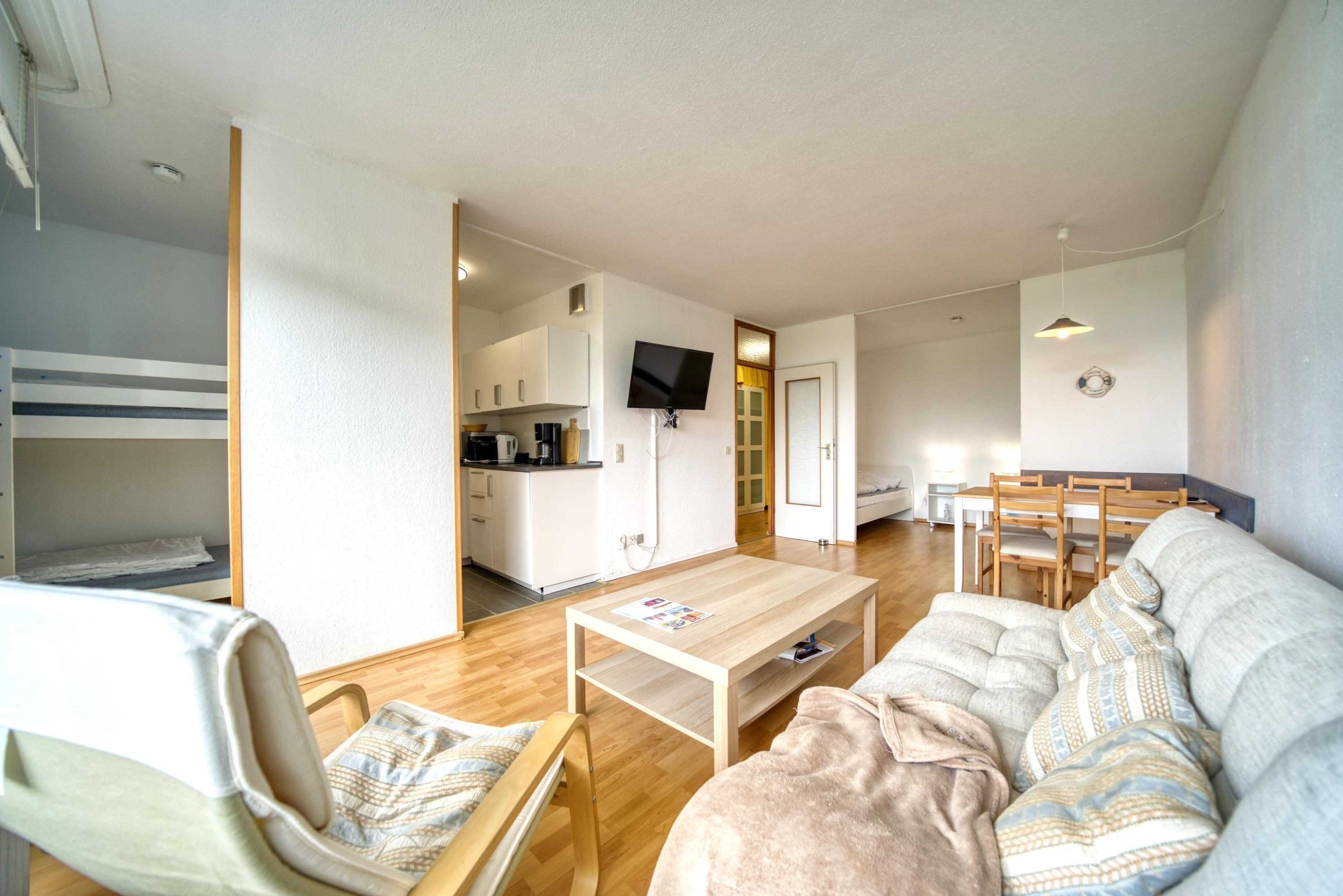 Wohn-Esszimmer, Schlafbereich mit Einzelbetten, Kinderzimmer mit Etagenbett, funktionale Küche mit Kühlschrank, Bad mit WC und Duschkabine, TV im Wohnzimmer, Balkon. Kostenloses WLAN. Nichtraucherwohnung, haustierfrei, max. 4 Personen. Kostenfreier Parkplatz, Strand ca. 300?m entfernt. Ideal für Familien, die Sonne, Strandnähe und Freizeitangebote wie Aktiv-Hus, Schwimmbad, Sauna und Kinderspielwelt genießen möchten.