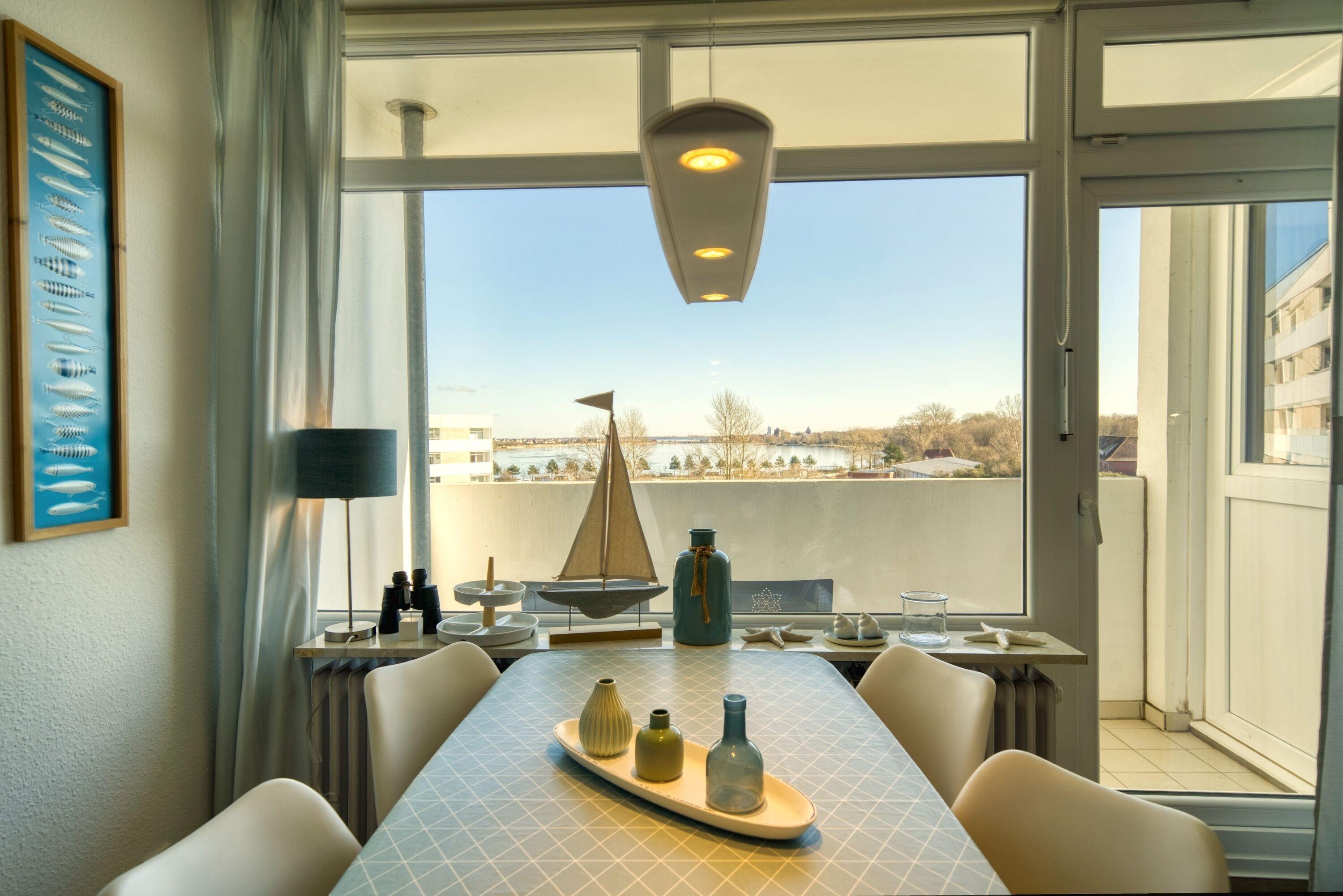 Moderne Ferienwohnung in Heiligenhafen mit Balkon, Blick auf Binnensee und Yachthafen, Highspeed-WLAN und Strandkorb inklusive.