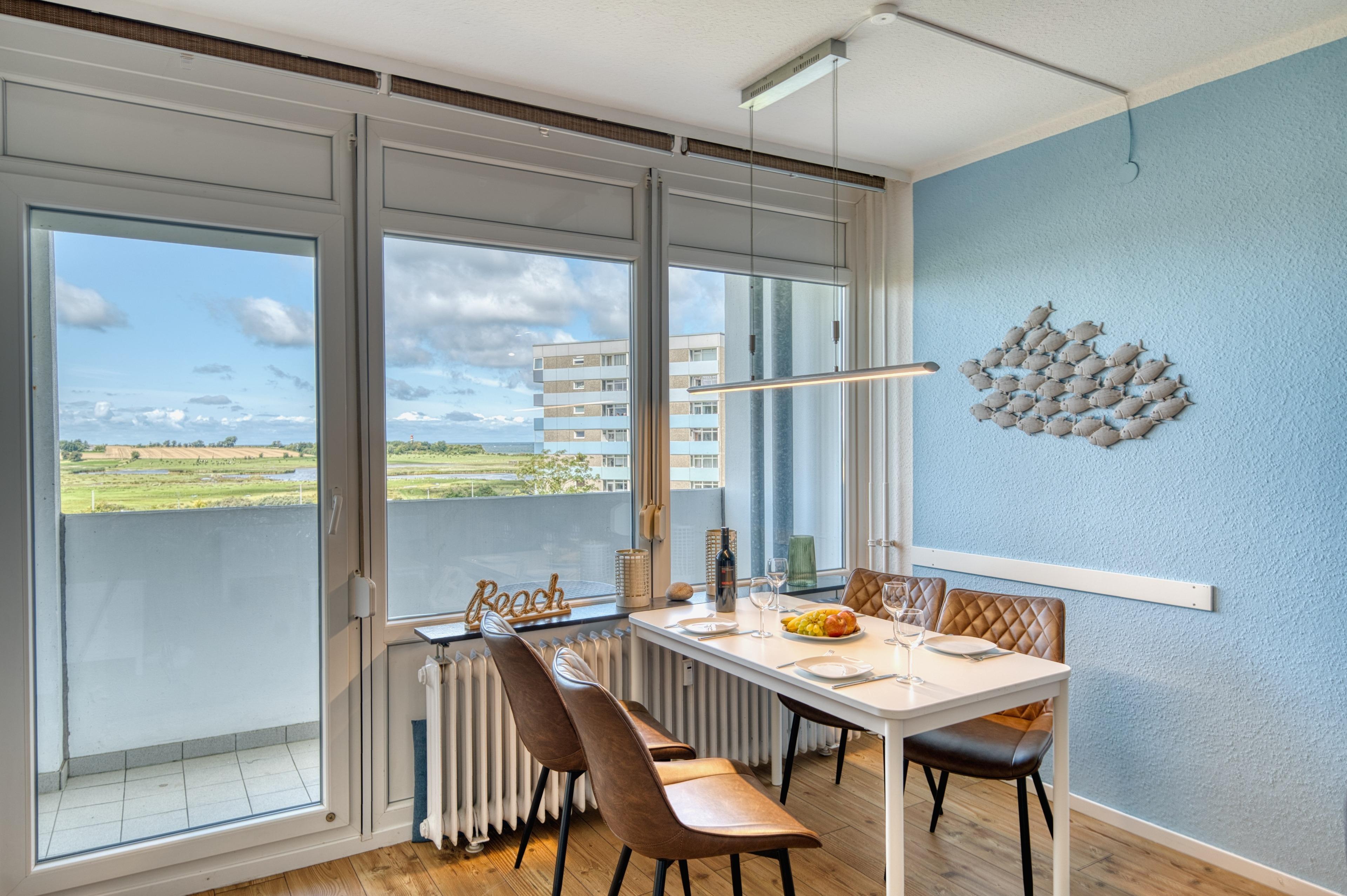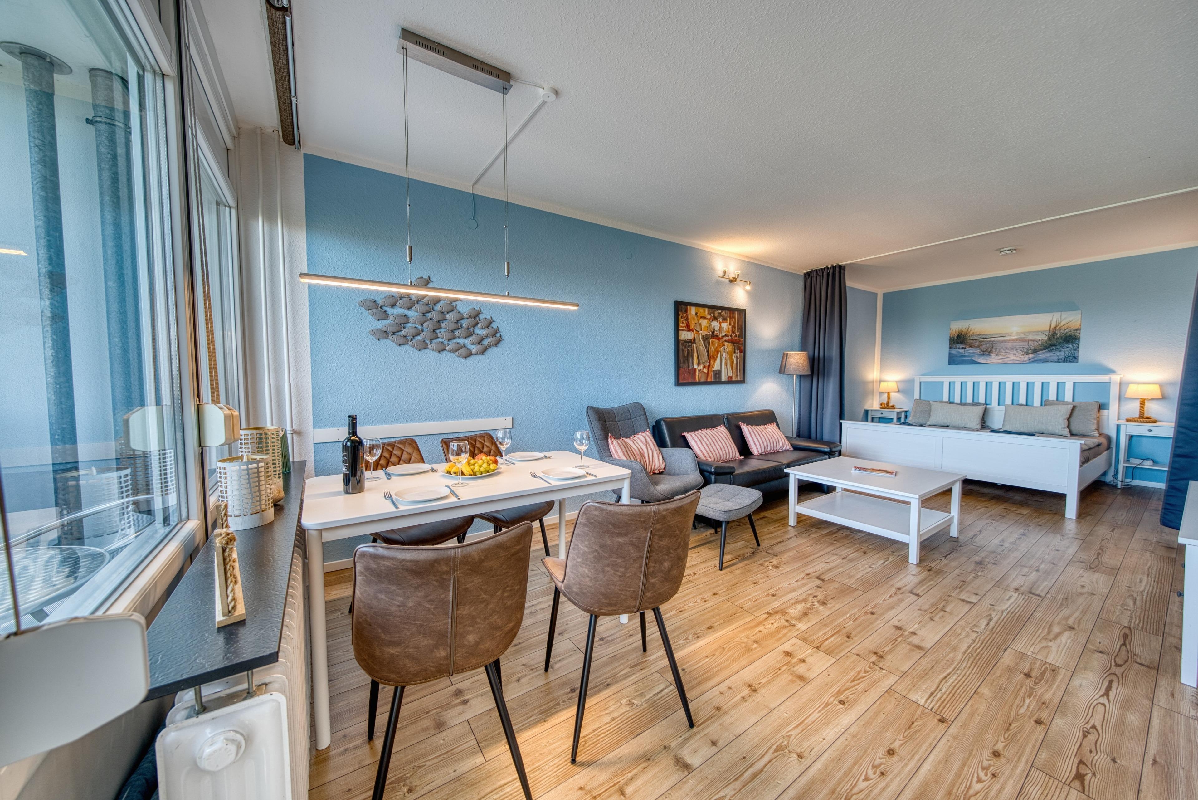 Diese gepflegte Ferienwohnung in der 5. Etage des Hauses M bietet auf 45?m² Platz für bis zu 4 Personen. Wohn-/Schlafzimmer mit Doppelbett, Sofa, Smart-TV und Esstisch. Separates Schlafzimmer mit Etagenbett. Küche mit 2-Platten-Cerankochfeld, Backofen, Kühlschrank mit Gefrierfach, Geschirrspüler, Filterkaffeemaschine, Wasserkocher und Toaster. Bad mit Dusche/WC. Balkon zur Ostseite mit Morgensonne. Bonus: kostenfreies WLAN, Kinderhochstuhl. Nichtraucherwohnung, keine Haustiere. Fahrstuhl vorhanden, Fahrradräume nutzbar. Strand ca. 300?m, kostenloser Parkplatz. Nähe Aktiv-Hus mit Schwimmbad, Sauna, Wellness und Kinderspielwelt. Ideal für einen komfortablen Familienurlaub an der Ostsee.
