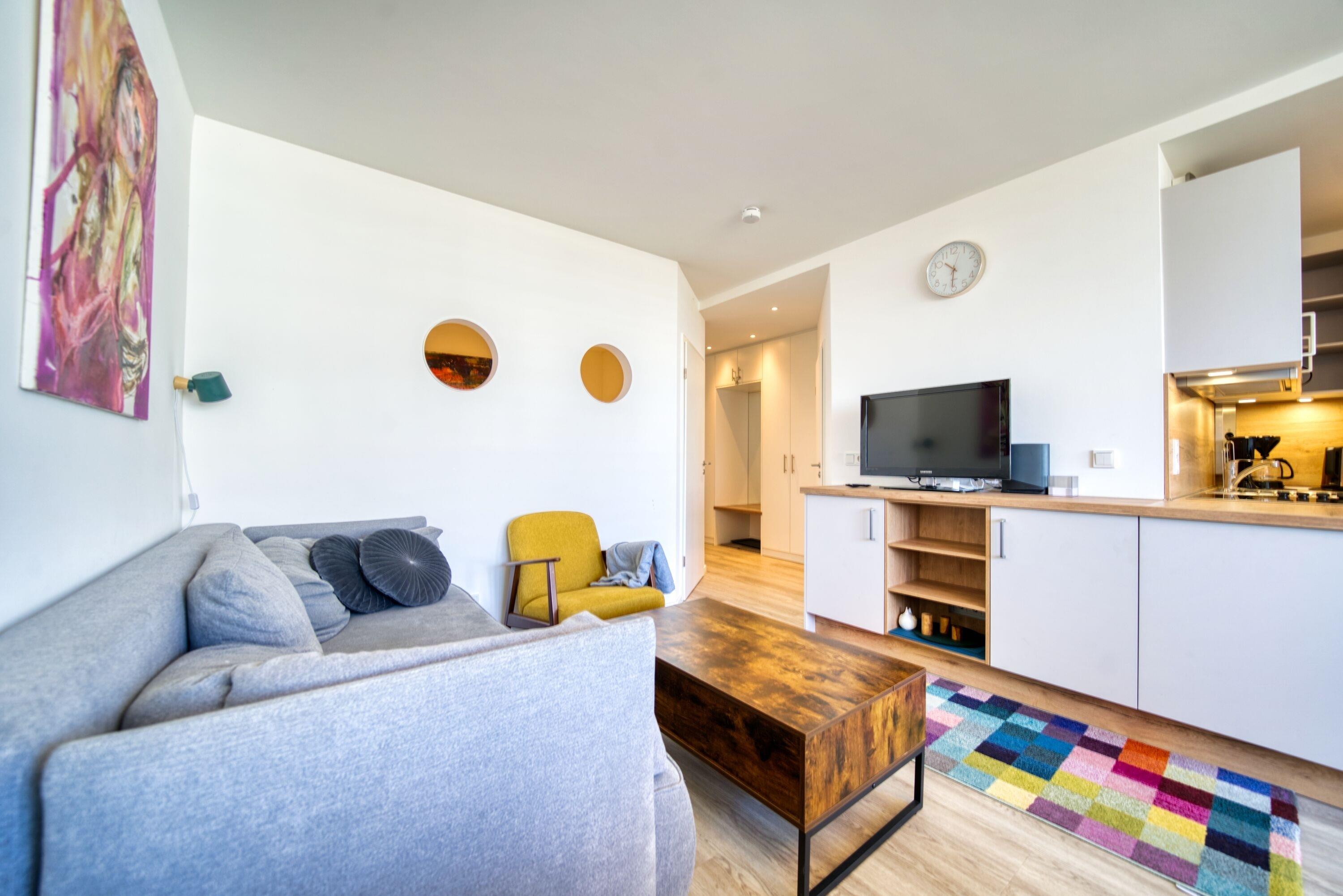 Die gemütlich eingerichtete Wohnung im Haus N, 7. Etage, bietet auf 45 qm Platz für bis zu 5 Personen. Der Balkon zum Innenhof eröffnet einen schönen Blick auf die Grünanlagen und die Ostsee Richtung Fehmarn. Das Wohn-Esszimmer ist mit Sofa mit Schlaffunktion, modernem Flat-TV und Radio ausgestattet. Ein Elternschlafraum mit Doppelbett sowie ein Kinderzimmer mit Etagenbett stehen zur Verfügung. Die Küche ist komplett eingerichtet mit Kühlschrank, 4-Plattenherd und Minibackofen mit Backfunktion. Das Bad verfügt über Dusche und WC.