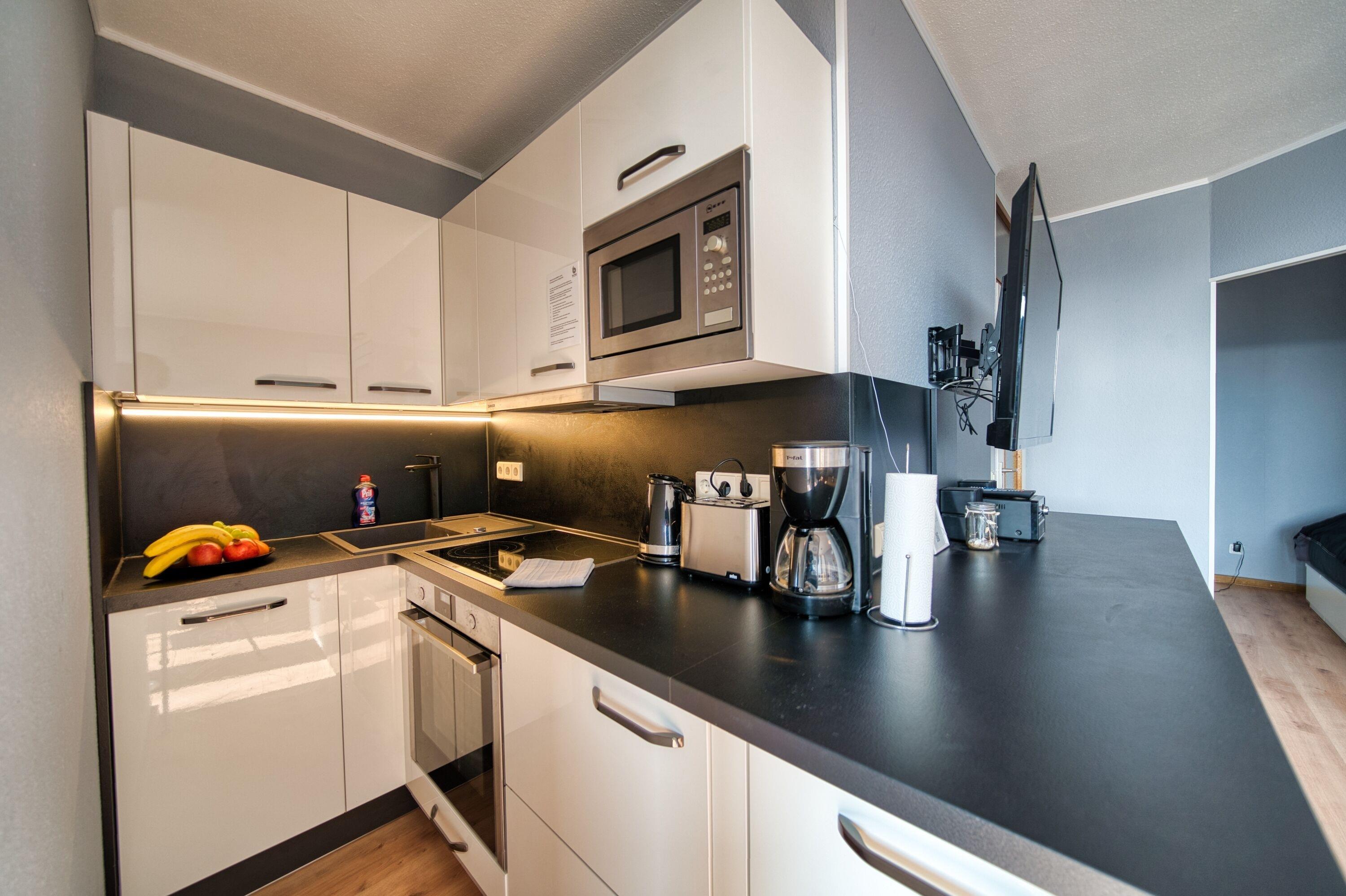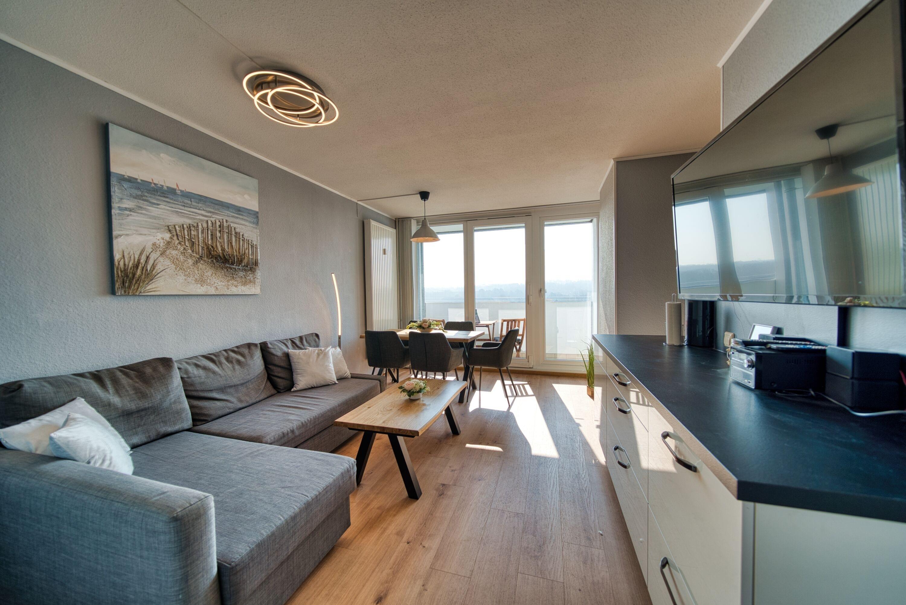 Die Wohnung befindet sich im Haus N im Ferienpark, 7. Etage, mit Balkon in Richtung Yachthafen und Wiesen. Auf 45 qm bietet sie ein Wohn-Esszimmer mit Schlafsofa, TV und Radio, ein Elternschlafzimmer mit Doppelbett sowie ein Kinderzimmer mit Etagenbett. Die moderne Einbauküche ist mit Geschirrspüler, Backofen, Mikrowelle und Ceranfeld ausgestattet. Das neue Bad verfügt über WC und eine komfortable Regenwalddusche. Eine Glasschiebetür verbindet Wohnraum und Balkon und sorgt für ein offenes Raumgefühl.
