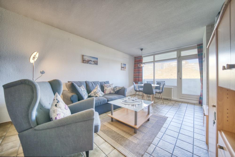 Die Wohnung im Haus O, 1. Etage, verfügt über einen Balkon zur Nordseite mit Blick in den Innenhof. Das Wohn-Esszimmer ist mit Schlafcouch und Fernseher ausgestattet, der Elternschlafbereich bietet ein Doppelschrankbett, und das separate Kinderzimmer ein Einzelbett. Die Küche ist komplett eingerichtet mit Kühlschrank, 4-Plattenherd und Geschirrspüler, das Bad mit WC und Dusche. Eine Loggia ist ebenfalls vorhanden.