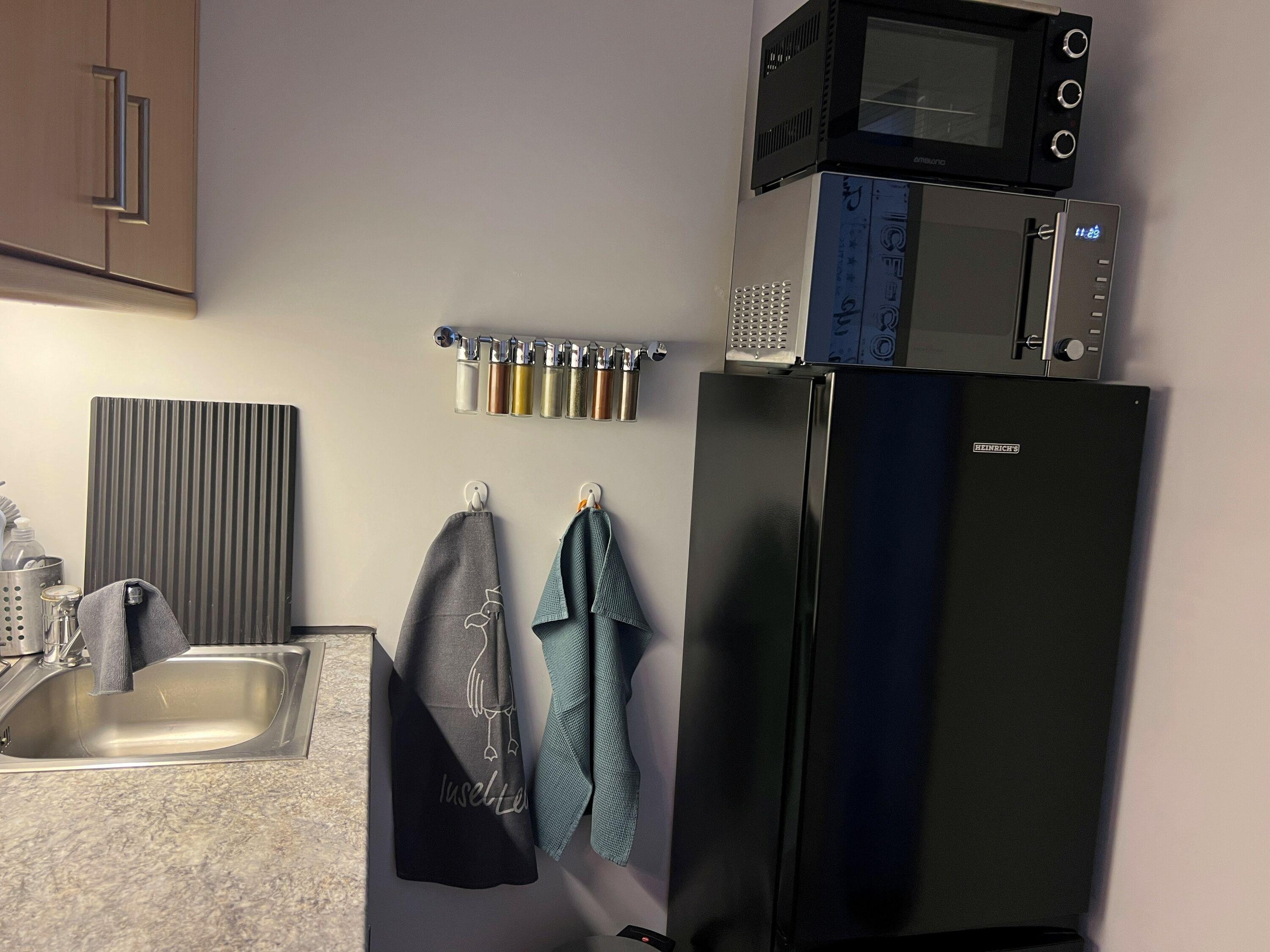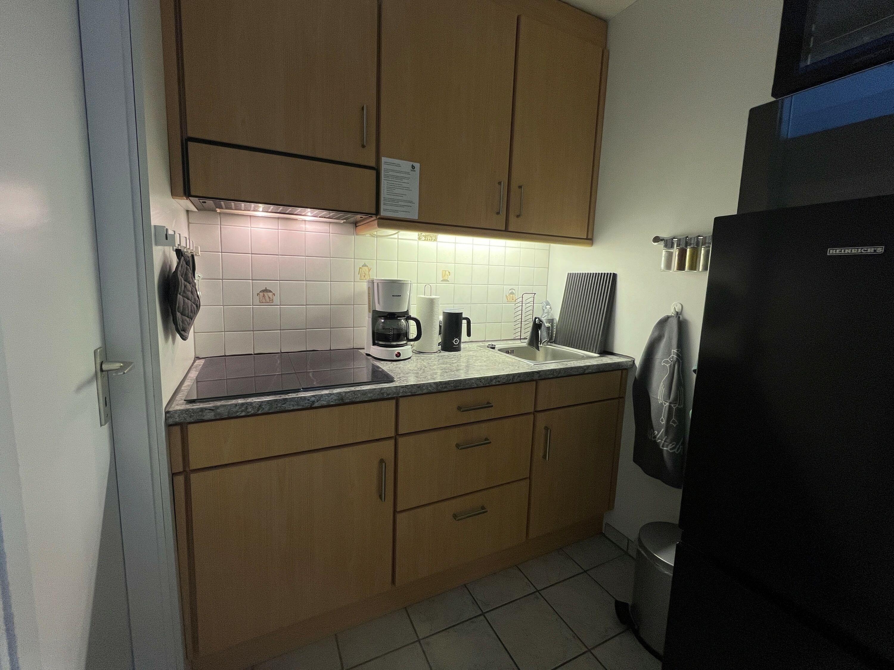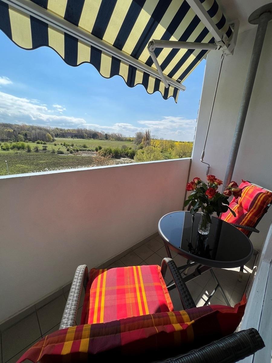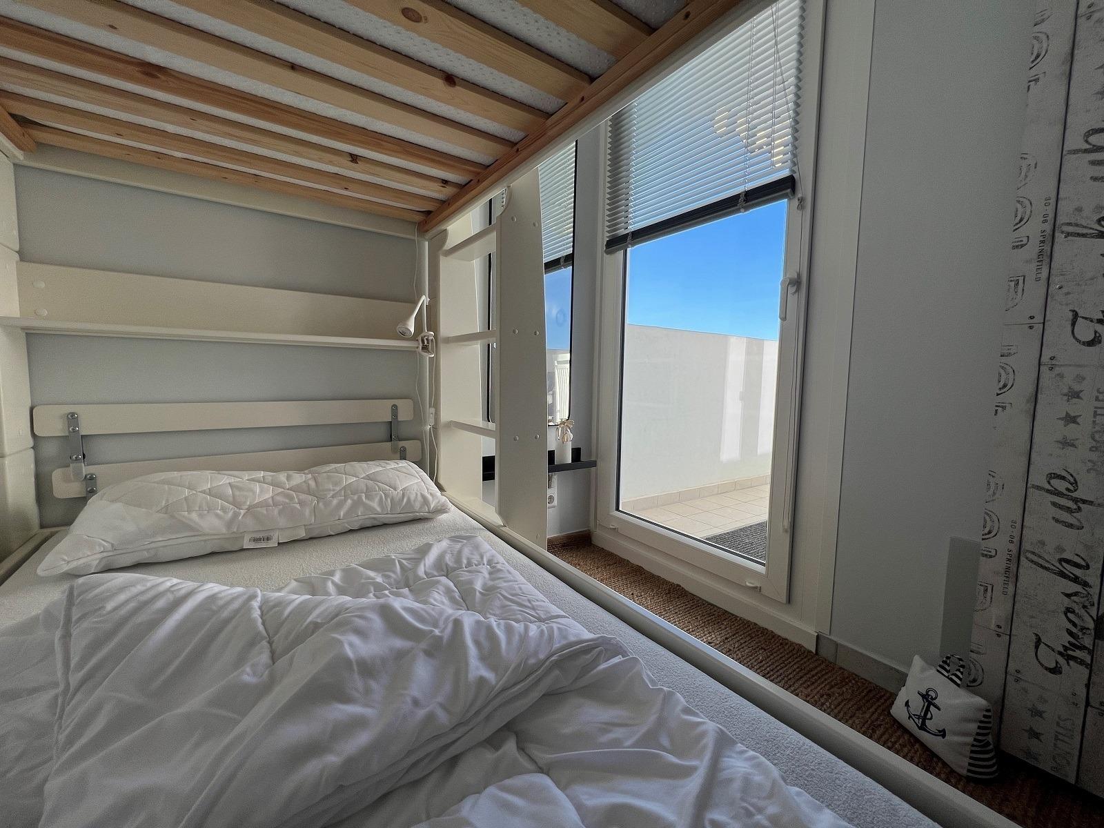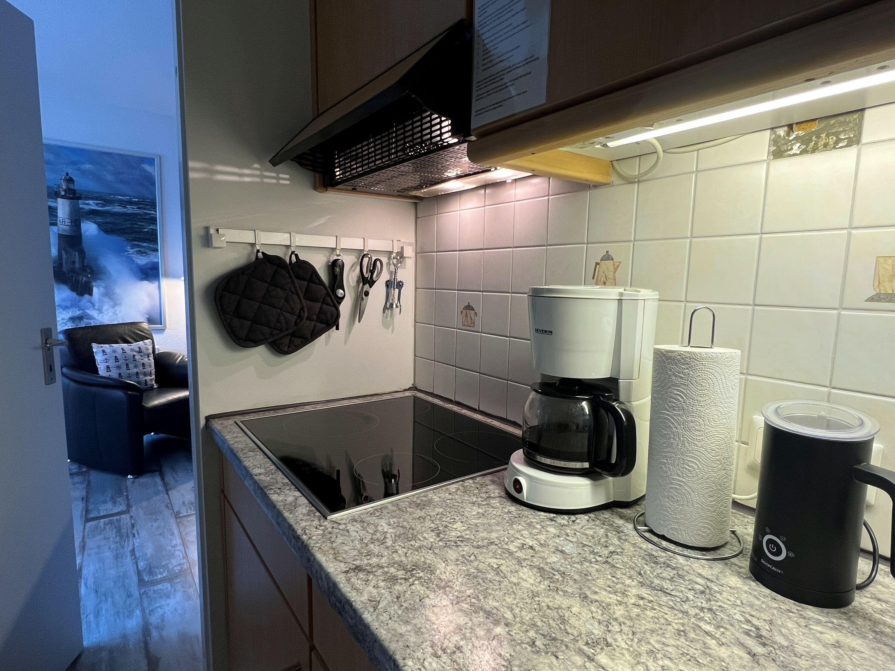 Helles Wohn-/Esszimmer mit zwei Einzelbetten, Sofa, Sessel und 50-Zoll-Smart-TV. Separates Schlafzimmer mit Etagenbett. Küche mit Kühl-Gefrierkombination, Cerankochfeld, Mikrowelle, Kaffeemaschine, Wasserkocher, Toaster, Eierkocher. Bad mit Dusche, WC und Handtuchtrockner. Süd-Balkon mit Markise.